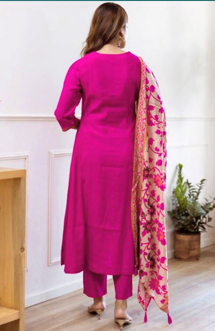 Rani Pink Chanderi Kurta Pant Set With Embroidery Work