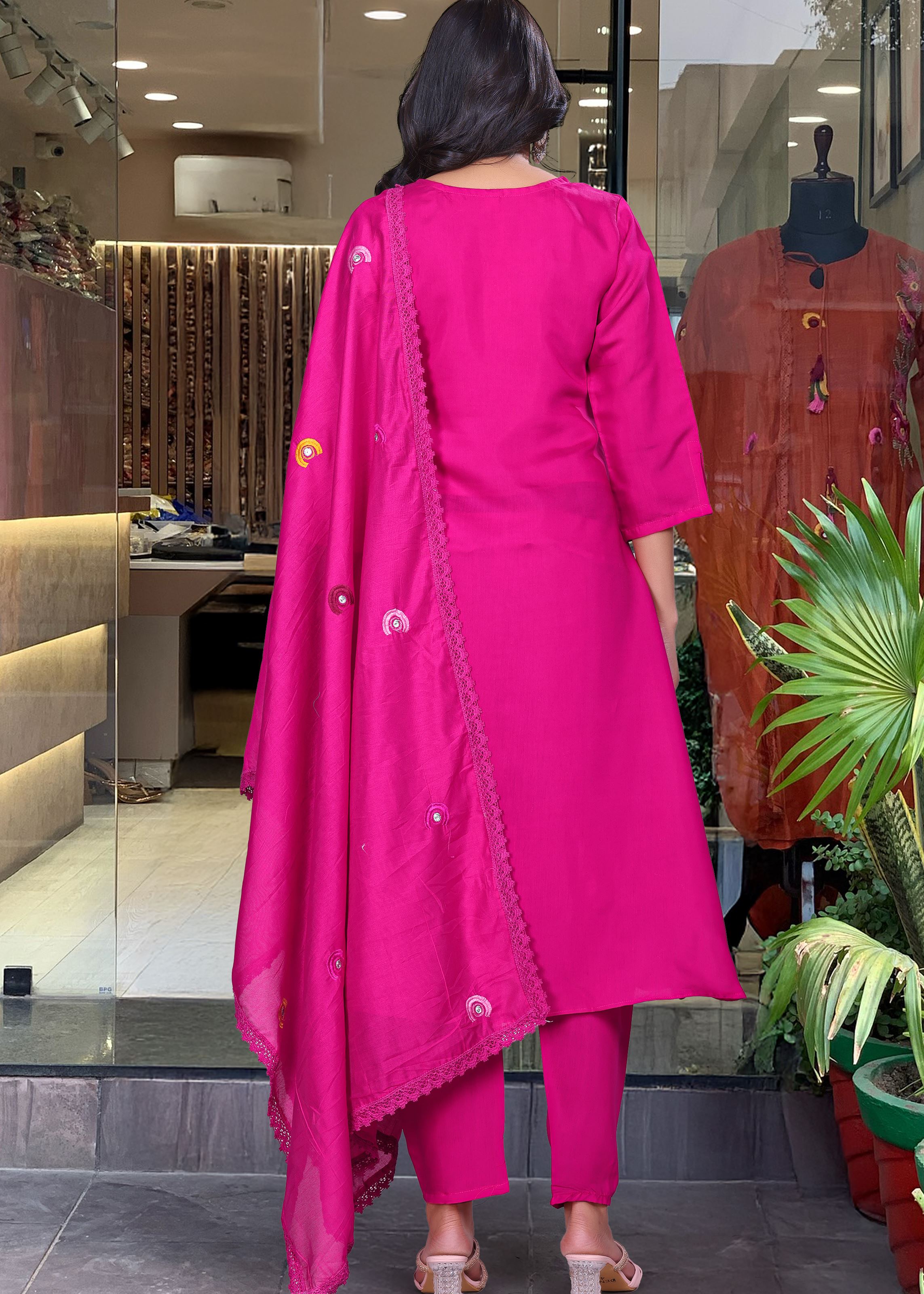 Rani Pink Chanderi Silk Kurta Pant with Heavy Thread Embroidery Work
