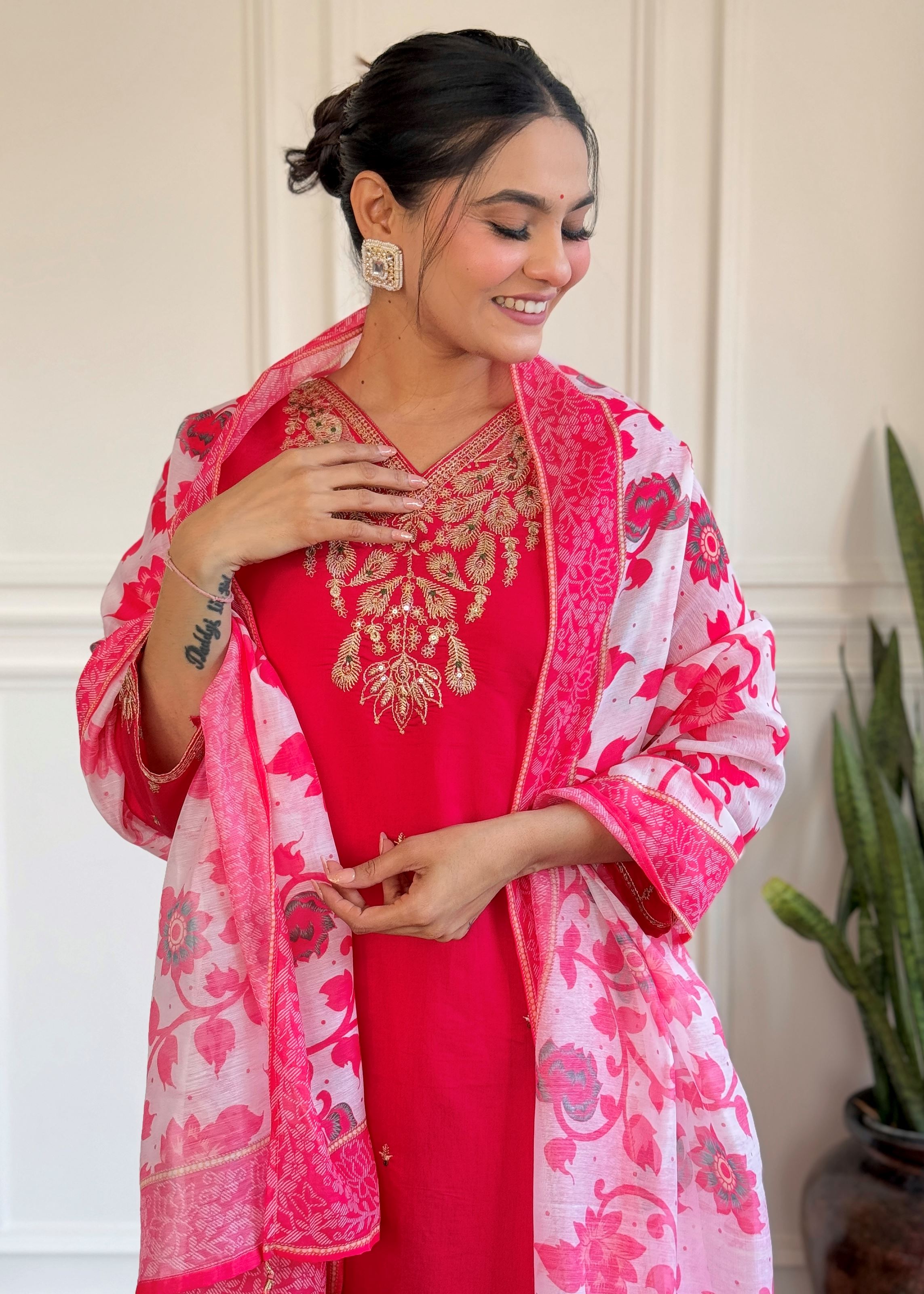 Rani Pink Kurta Pant Set with Heavy Thread Embroidery Work With Printed Dupatta