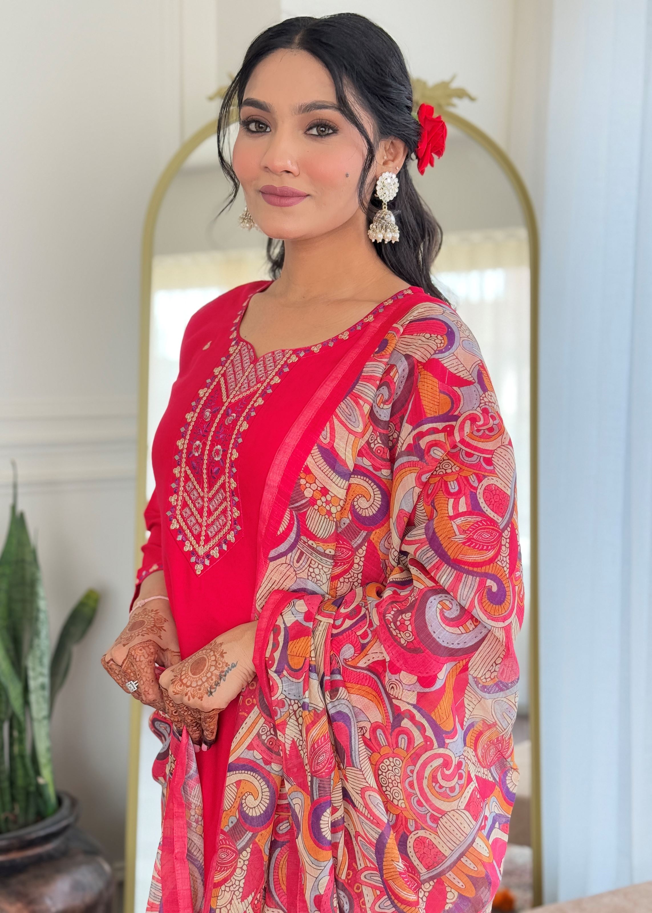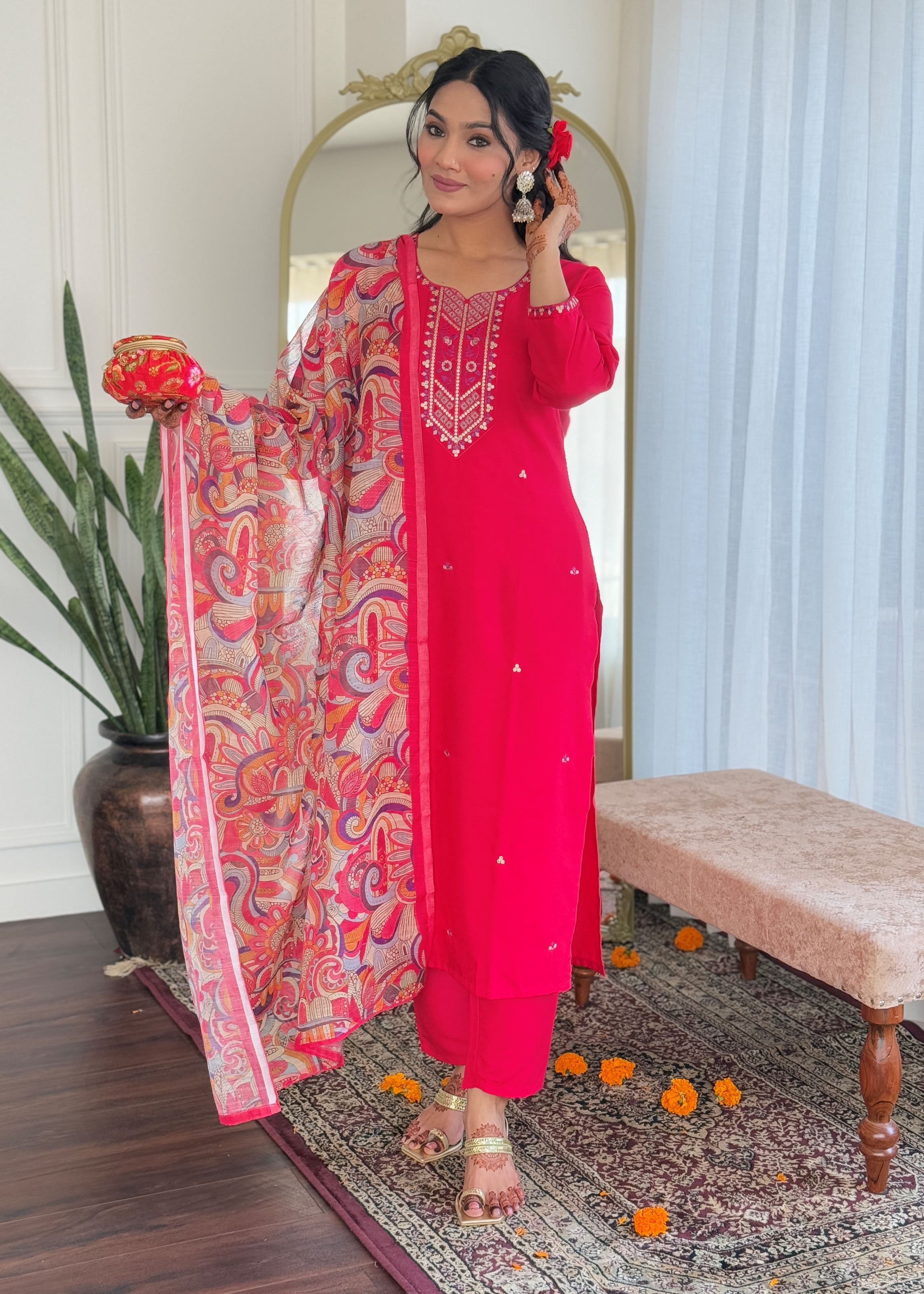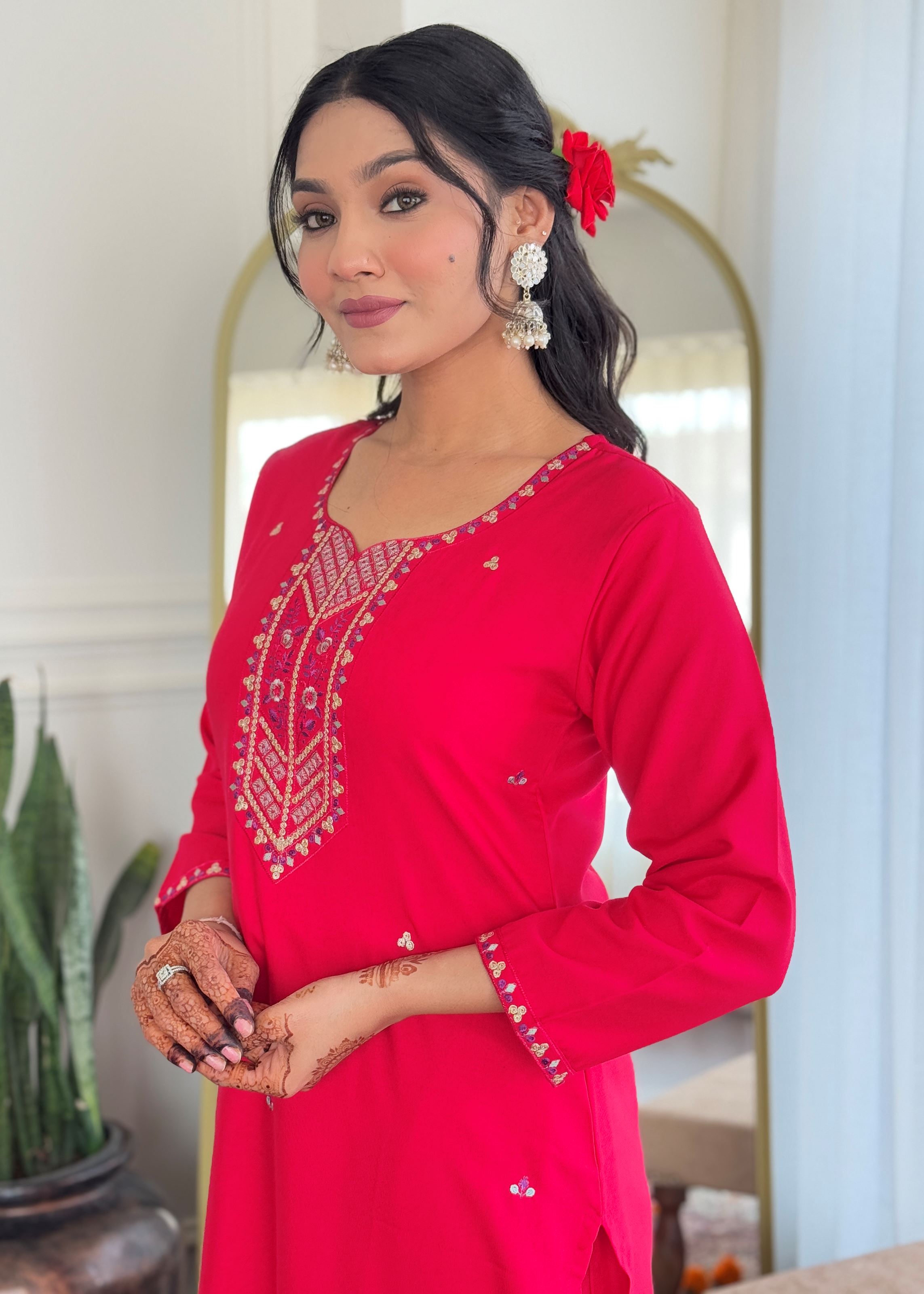 Rani Pink Rayon Kurta Pant Set With Embroidery Work