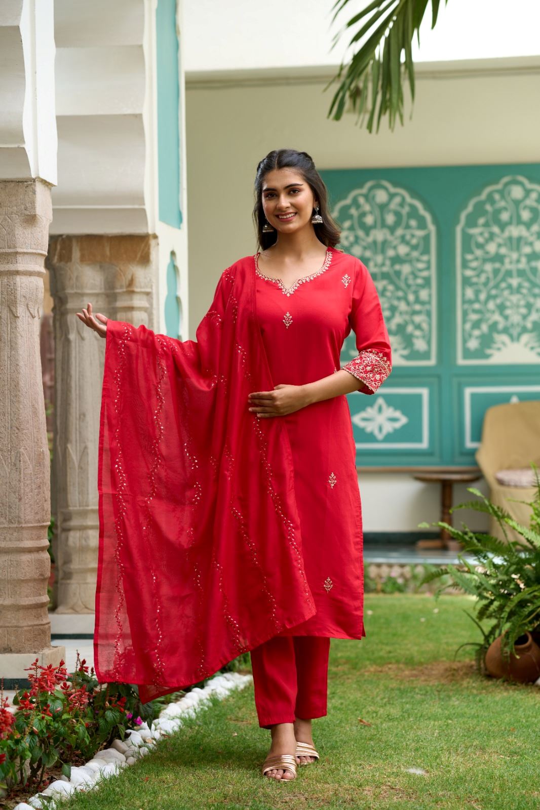 The set includes matching red Chanderi pants that provide a comfortable yet polished silhouette. Completing the ensemble is a soft Chanderi dupatta in the same tone, bringing together texture and elegance with effortless finesse. The fine weave and subtle sheen of Chanderi make this outfit an ideal choice for those who prefer classic ethnic wear with a sophisticated edge.