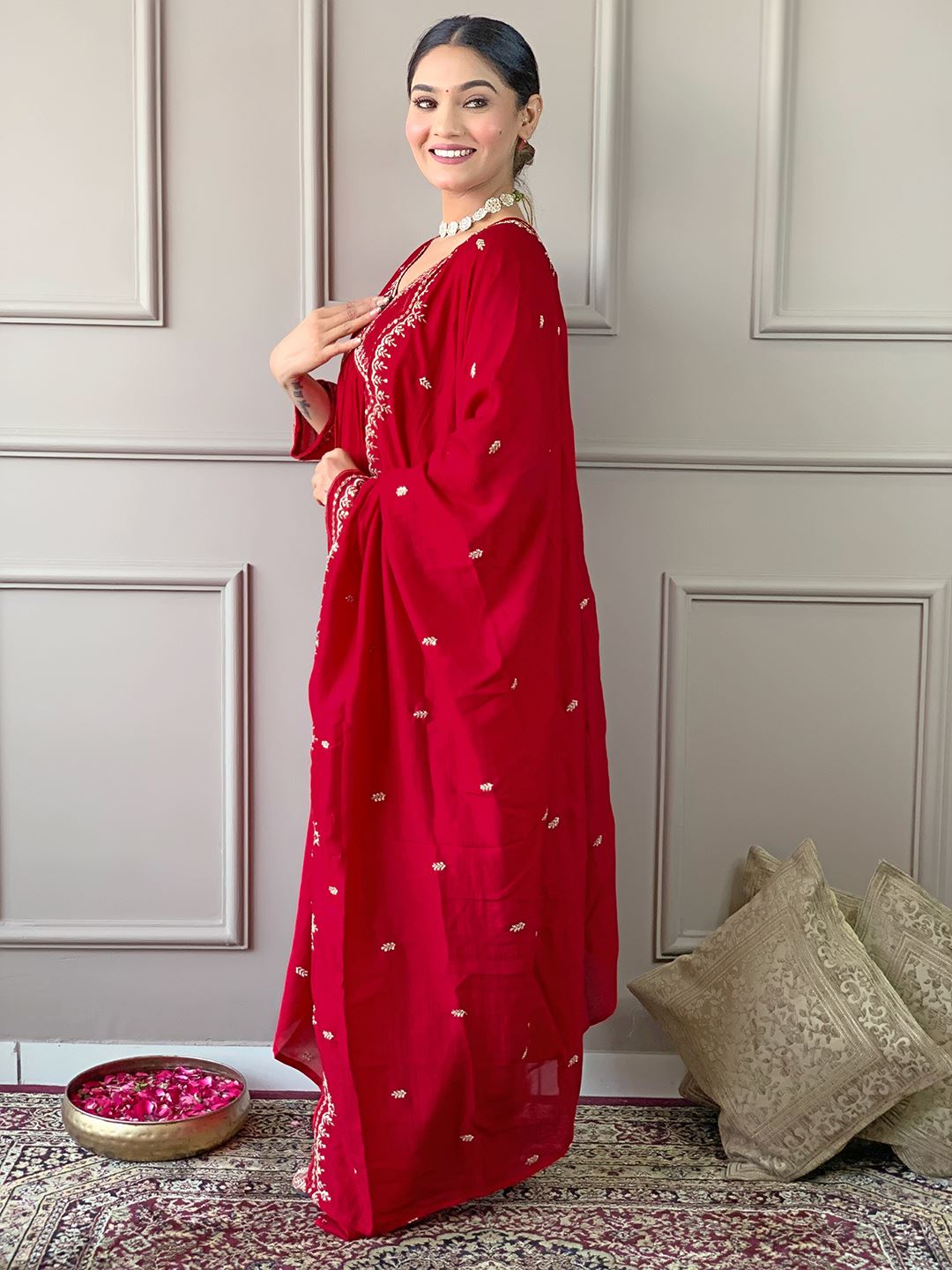 The matching pants, tailored in the same Vichitra Silk fabric, ensure a cohesive look while offering a flattering, comfortable fit. A beautifully draped Chinon dupatta in matching red adds a soft, flowing texture that balances the outfit with elegance and ease. The combination of fine embroidery and luxurious fabrics makes this set a standout piece in your ethnic wardrobe.