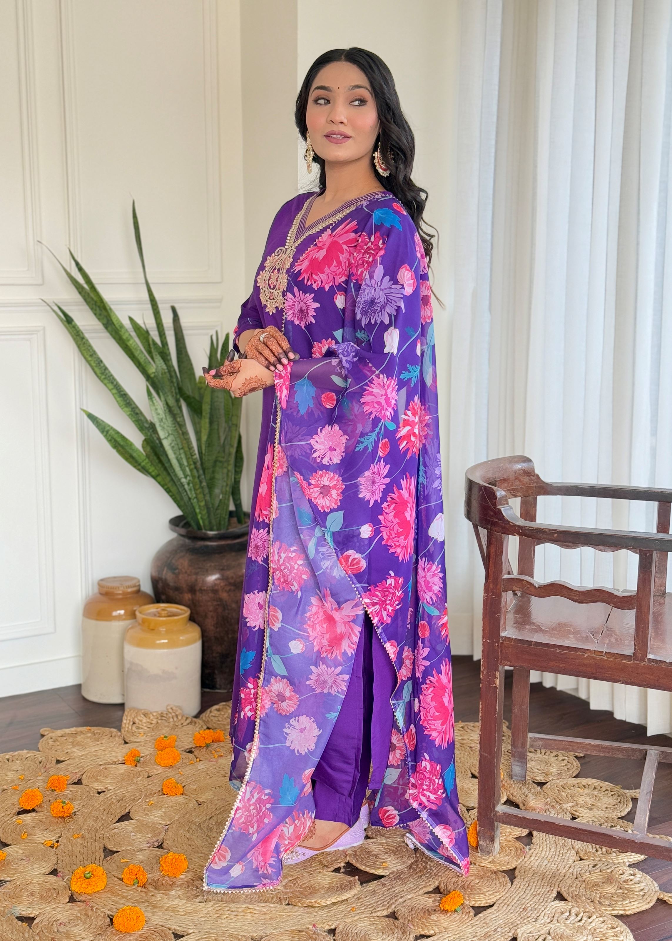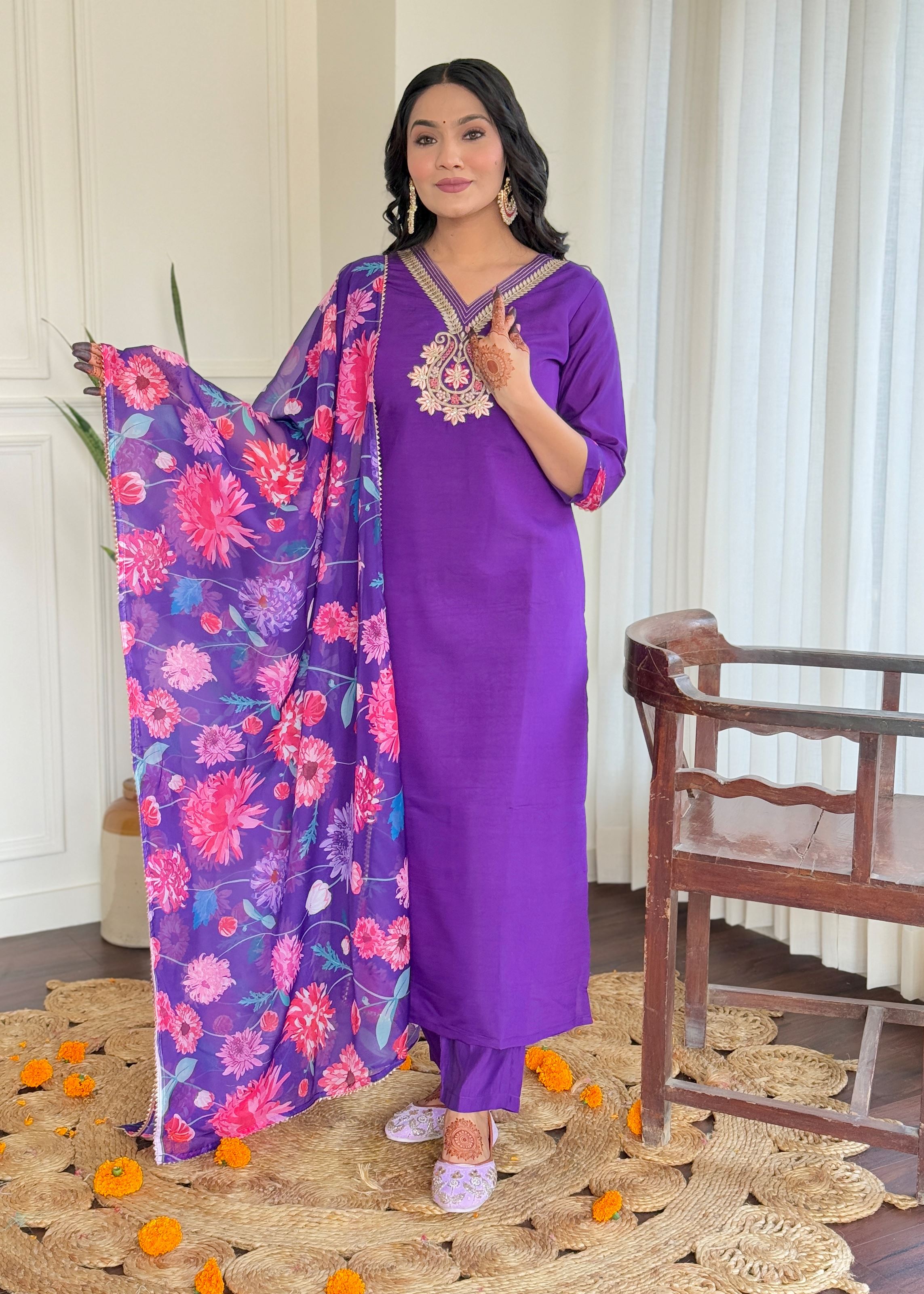 Violet Roman Silk Kurta Pant with Heavy Thread Embroidery Work With Printed Dupatta