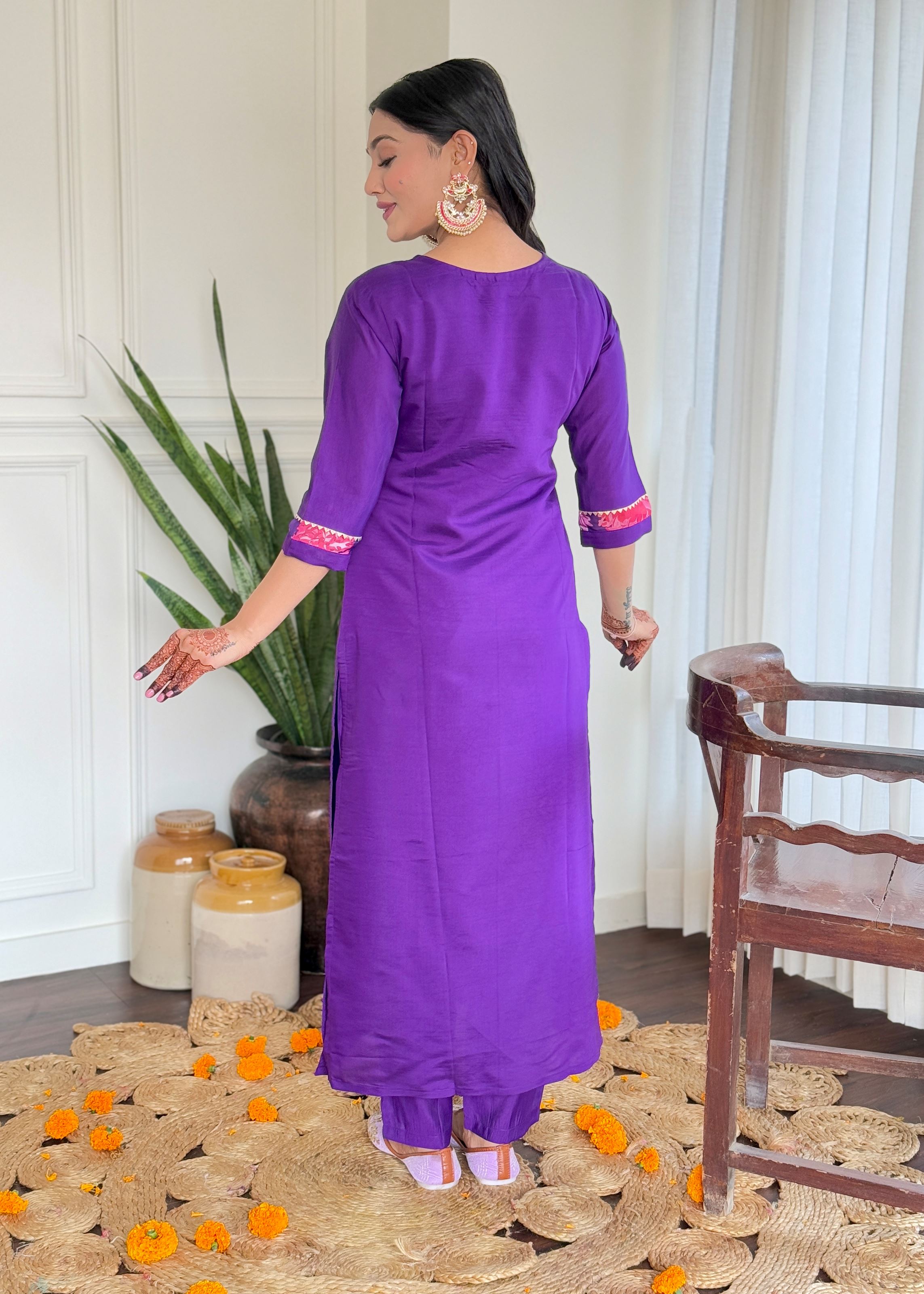 Make an everlasting impression with this Violet Roman Silk Kurta Pant Set from Aethnofit Fashions — a perfect fusion of classic design and contemporary detailing. The rich Roman silk fabric offers a regal texture and natural luster, making it ideal for festive occasions and refined gatherings. Featuring intricate heavy thread embroidery, the kurta showcases timeless artistry that speaks volumes without saying a word.