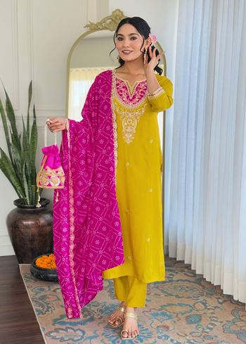 Completing the ensemble is a coordinated Silk Blend dupatta that adds a subtle sheen and a luxurious touch to the overall look. Whether you're attending a pooja, brunch, or a festive get-together, this set ensures you look polished, poised, and effortlessly stylish.