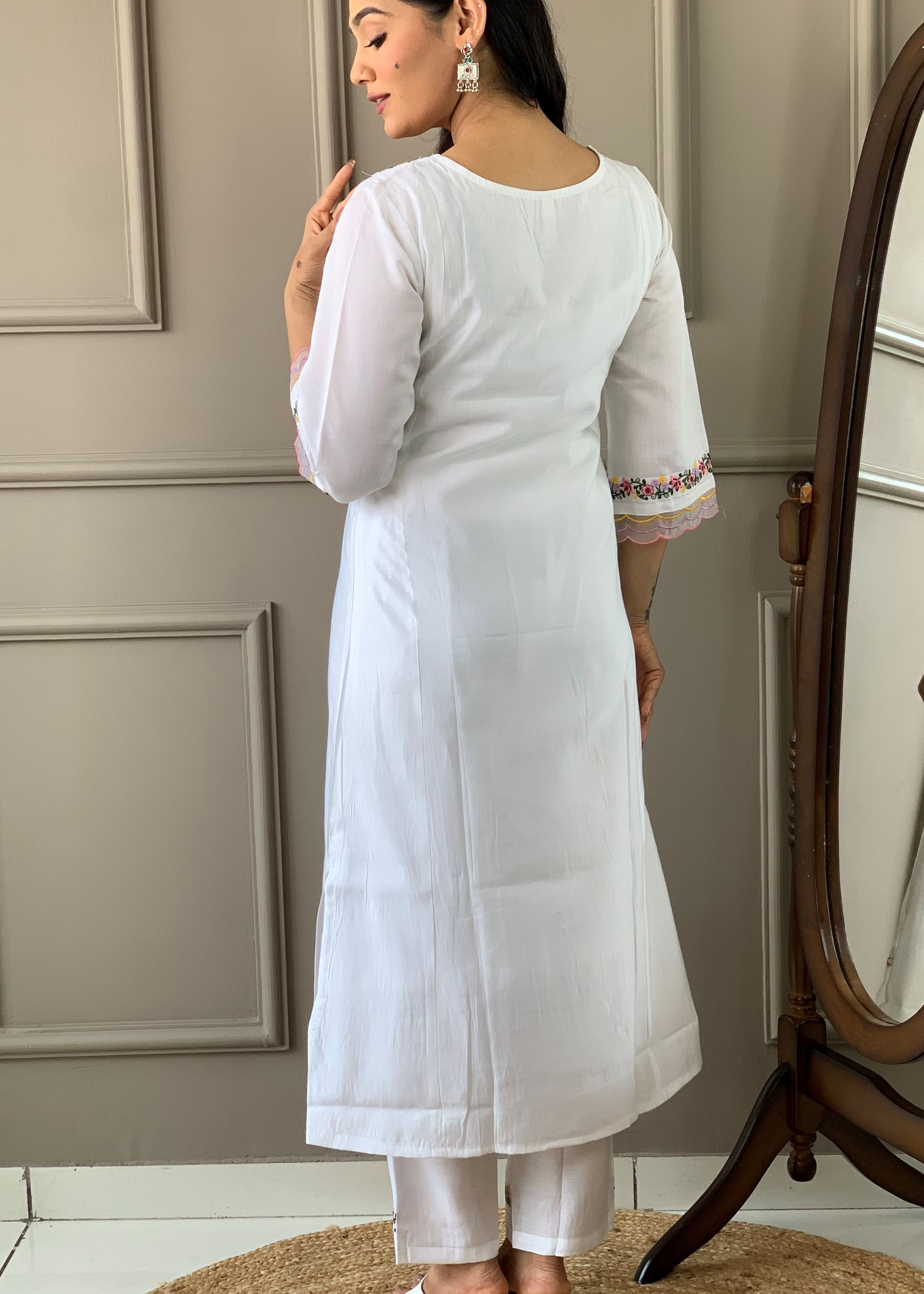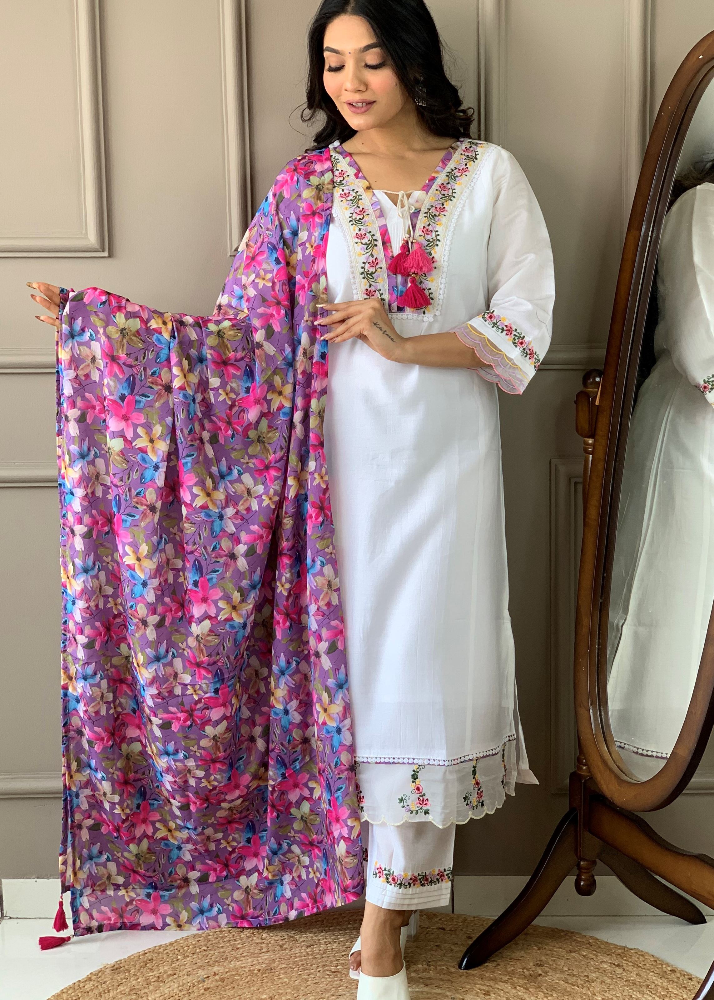 The highlight of the ensemble is its delicate woven work, subtly enhancing the sophistication of the pristine white hue. The kurta features a flattering V neck and 3/4 sleeves, giving it a refined yet contemporary silhouette. The ensemble is perfectly complemented by a smooth French crepe dupatta, adding fluidity and finesse to the entire look.Effortlessly graceful and versatile, this set is a beautiful choice for day functions, ethnic celebrations, or elegant evening gatherings. Now available from Aethnofit Fashions, with shipping across India and the USA.