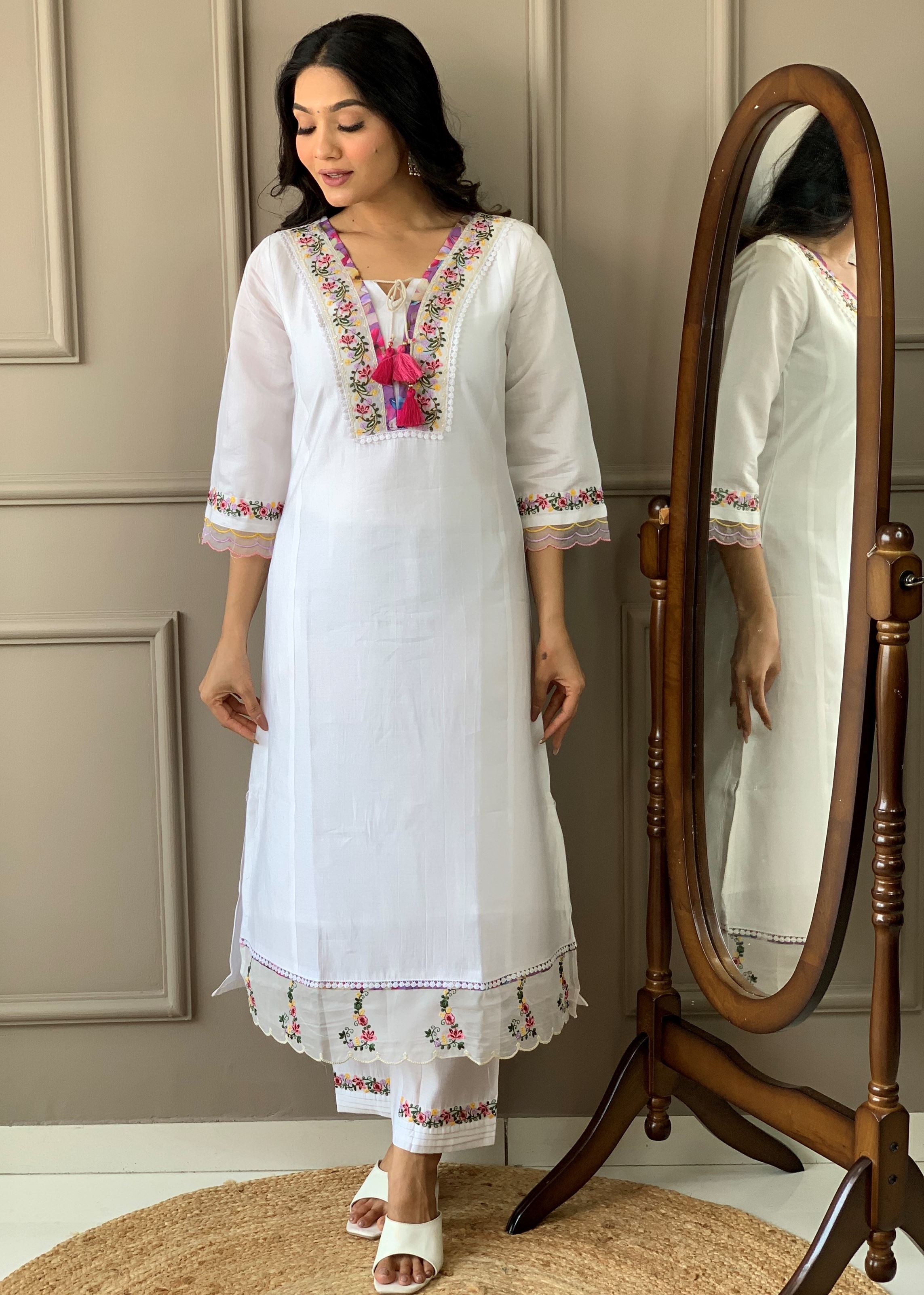 White Chanderi Silk Elegant Kurta Pant Set With Woven Work