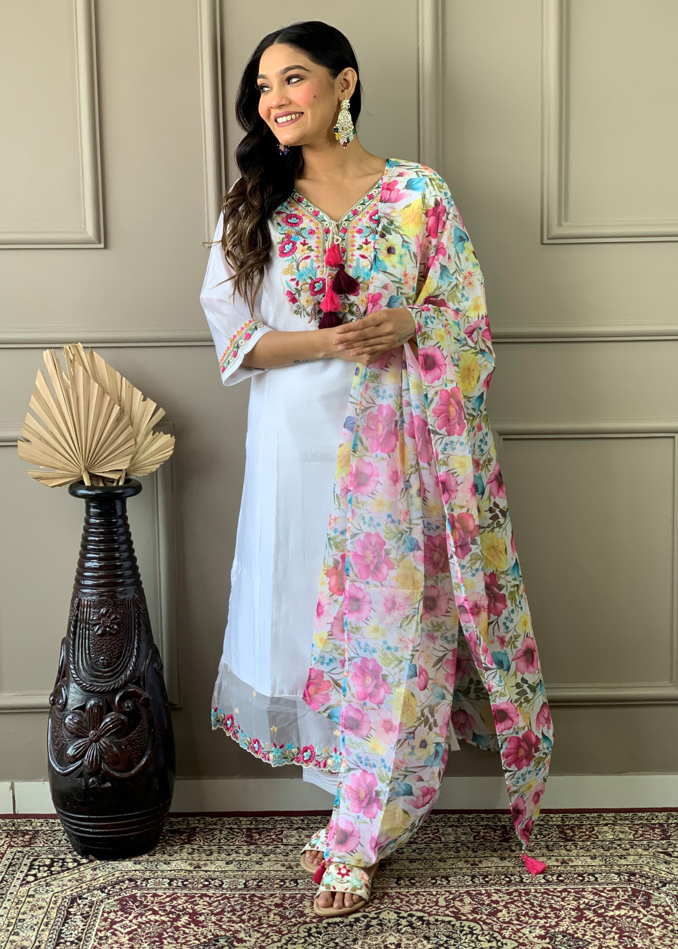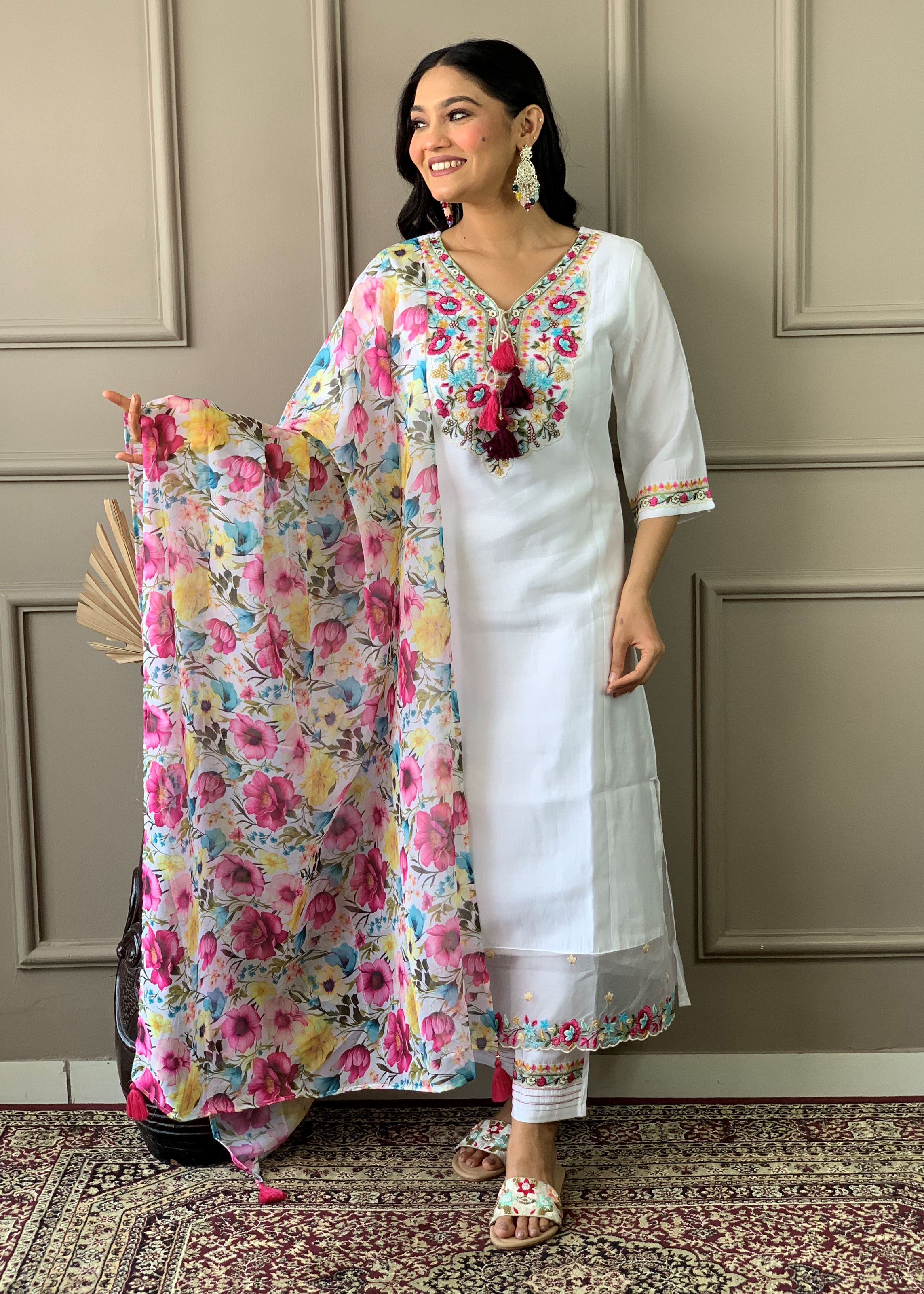 The elegant V-neckline and classic 3/4 sleeves offer a flattering silhouette, while the coordinated Chanderi silk pants ensure both comfort and style. Completing the ensemble is a delicate organza dupatta — soft, sheer, and effortlessly graceful — adding an ethereal layer to this sophisticated set.