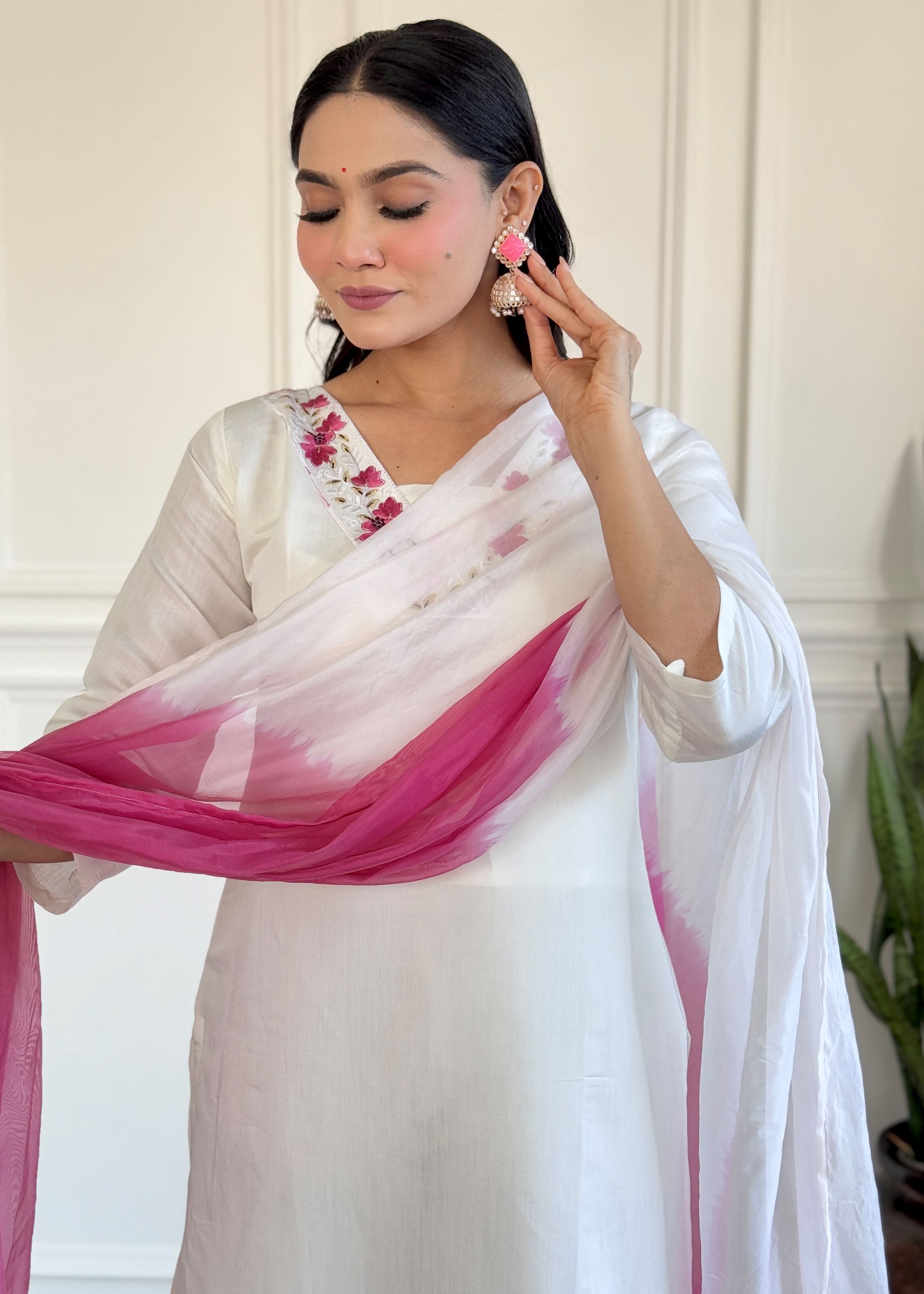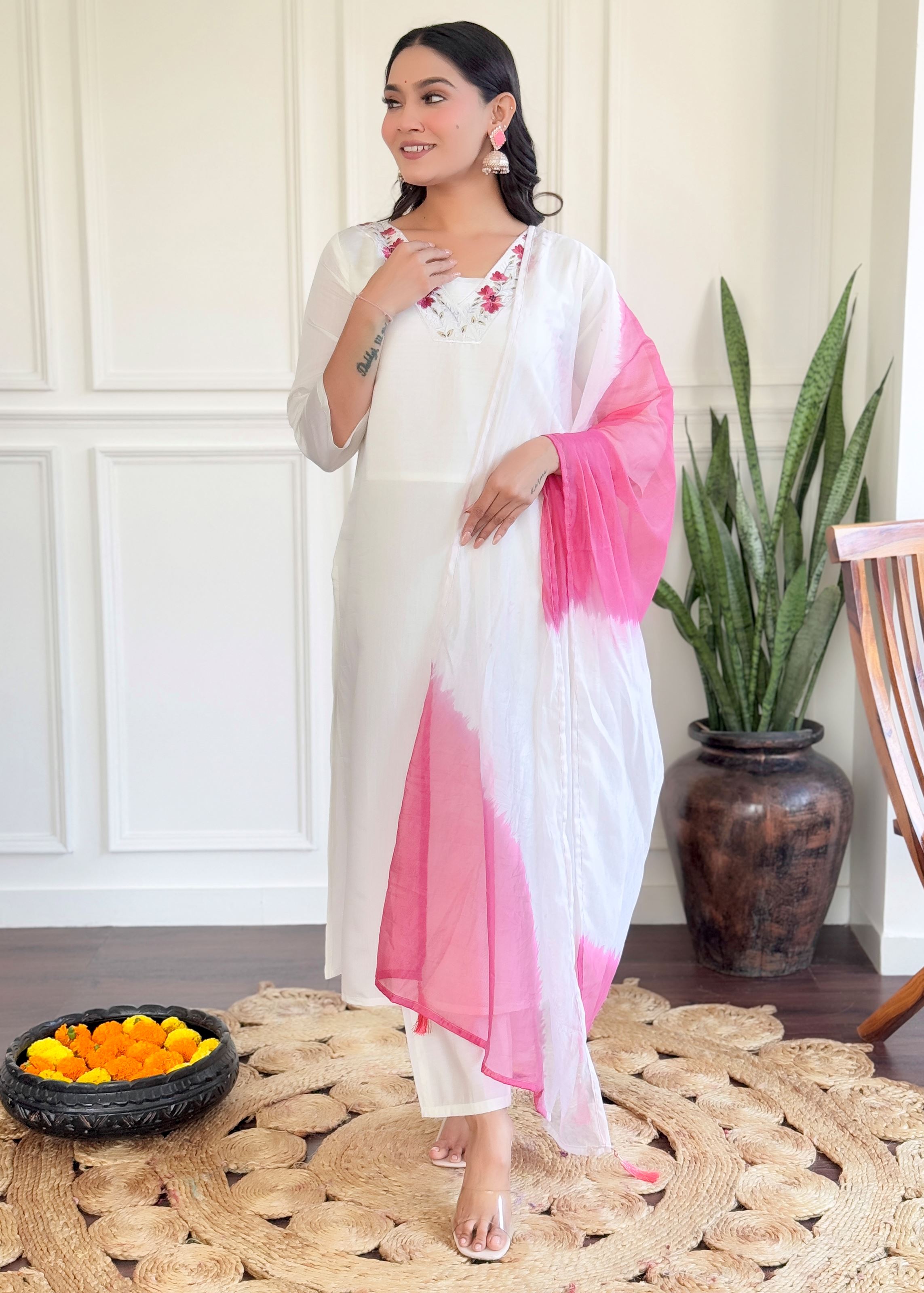 White Kurta Pant Set with Heavy Thread Embroidery Work on Neck