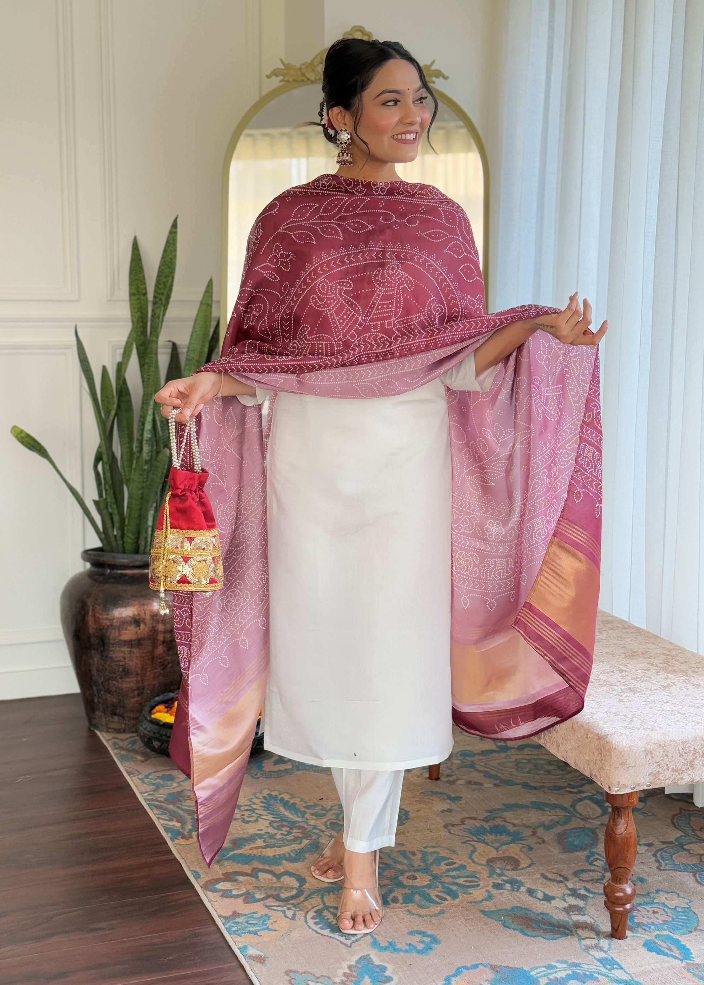 White Kurta Pant Set with Heavy Thread Embroidery Work With Printed Dupatta