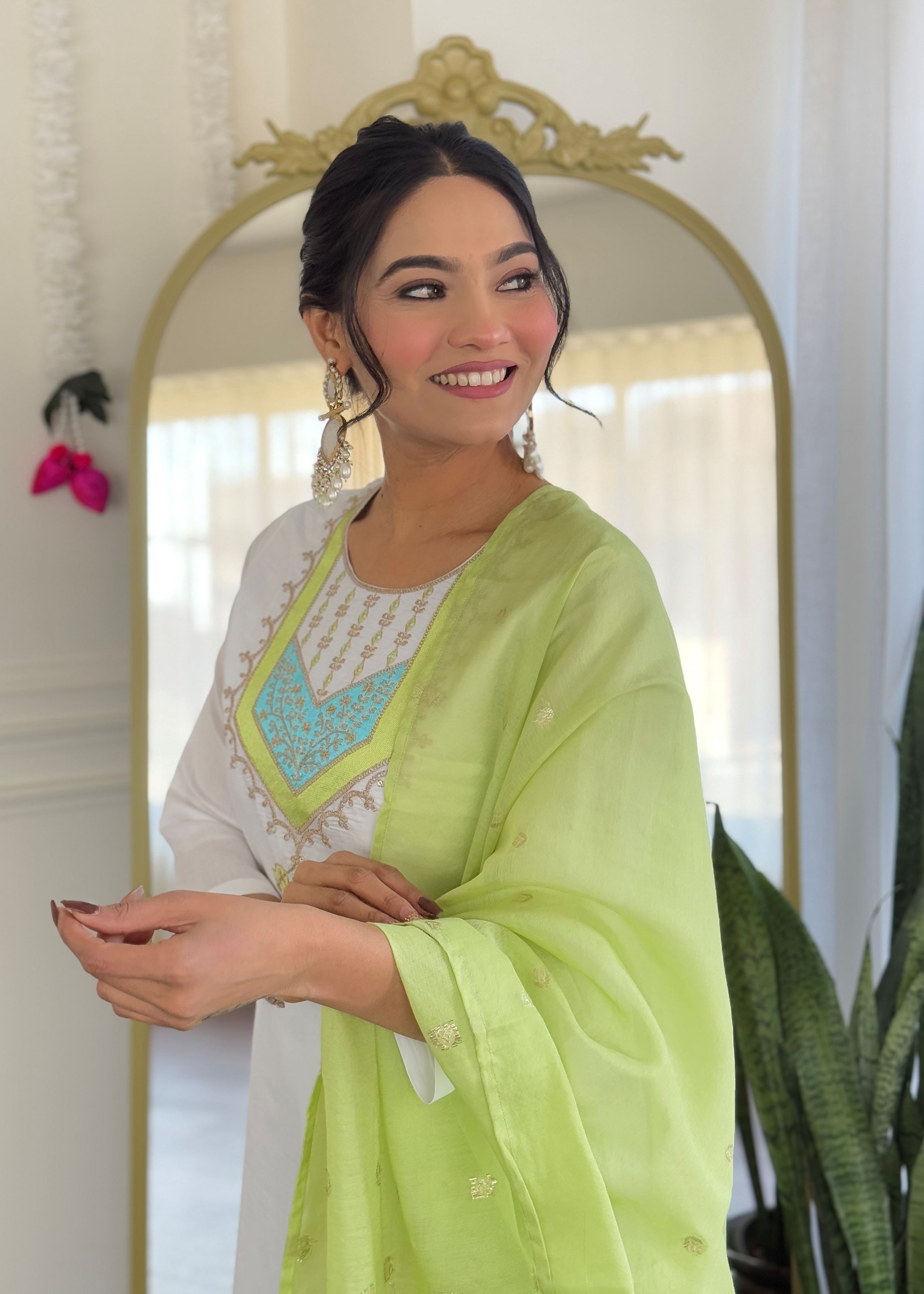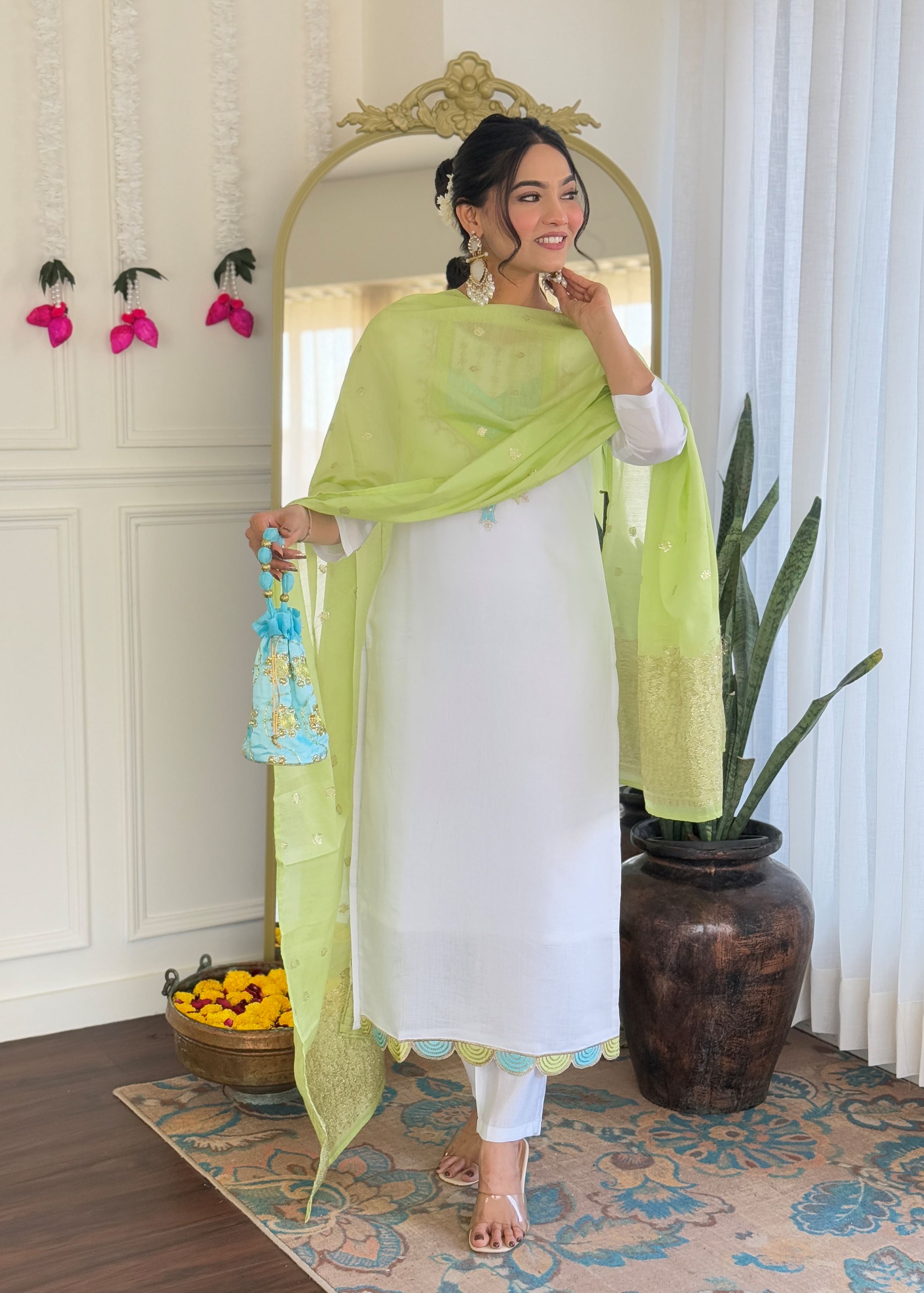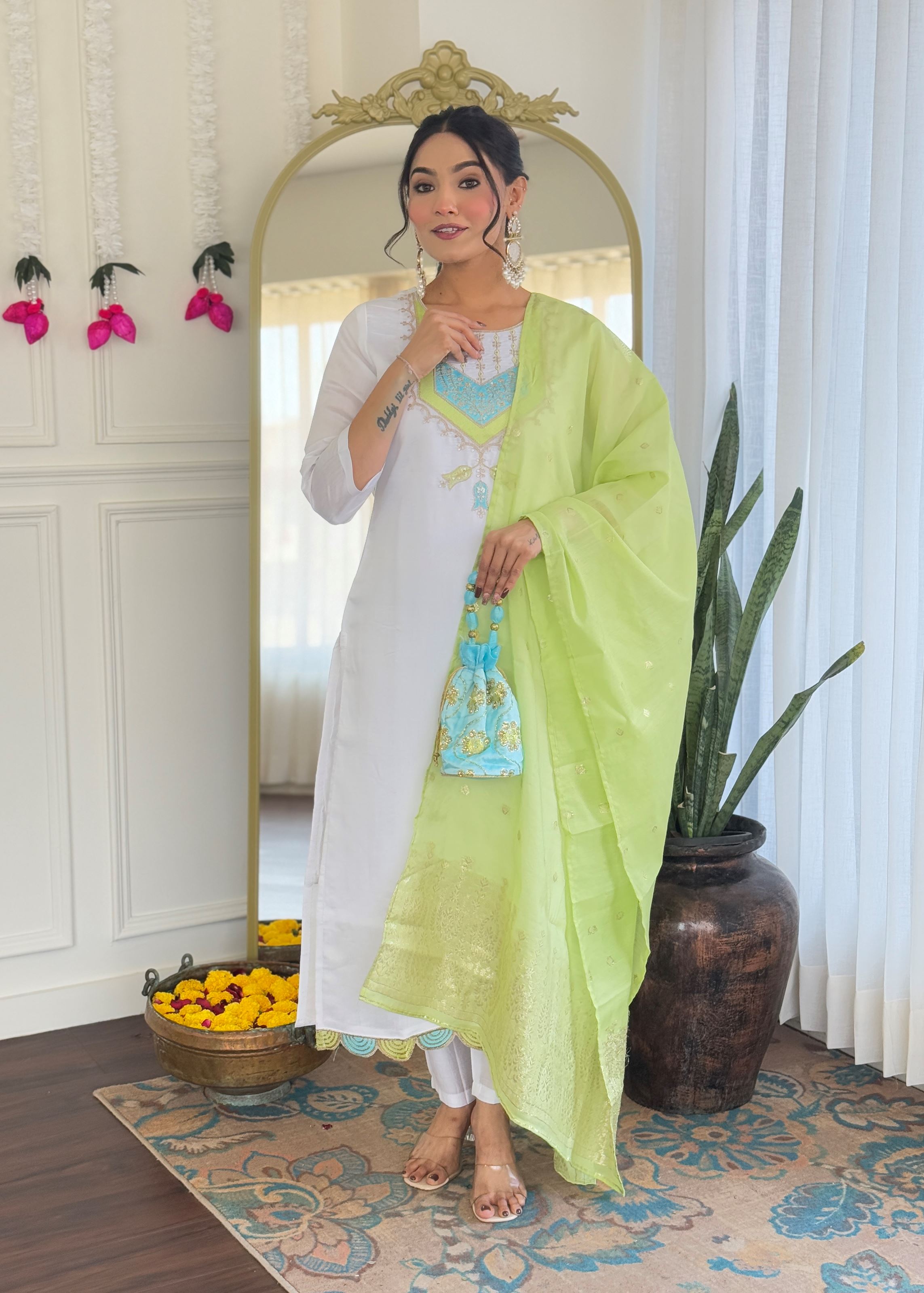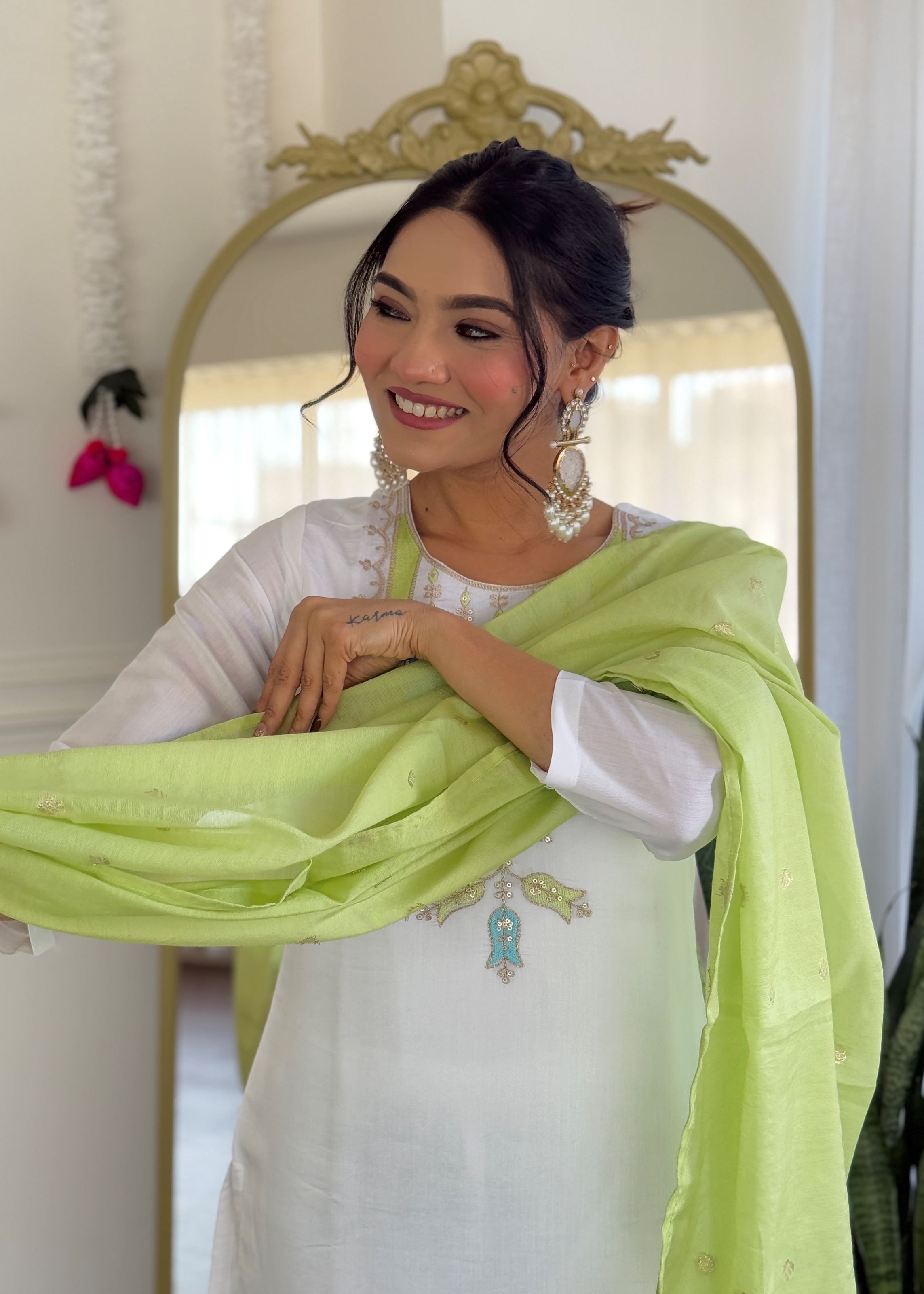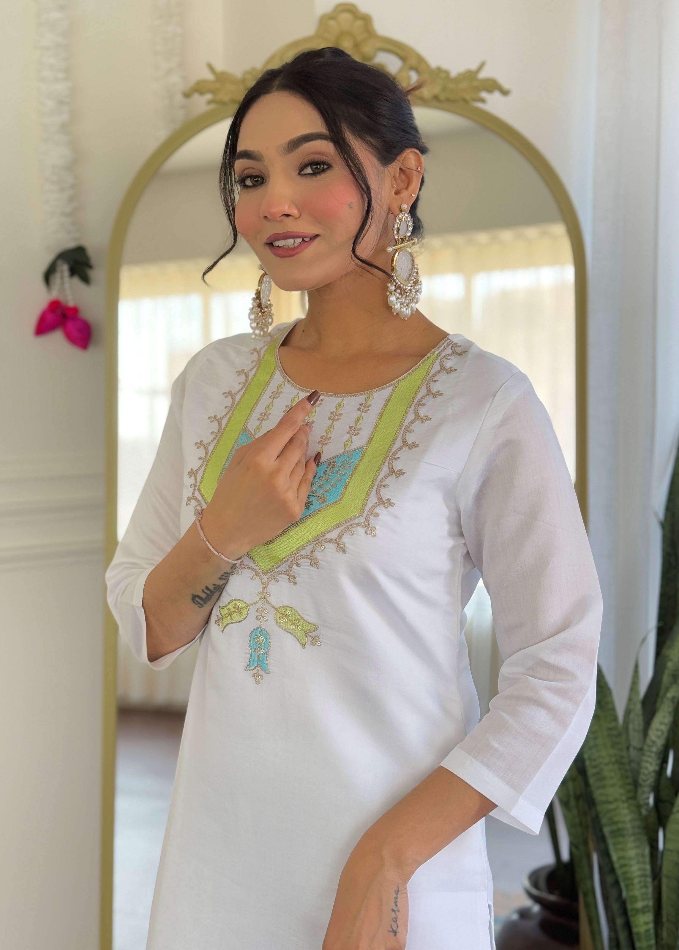 White Viscose Chanderi Kurta Pant Set With Embroidery Work