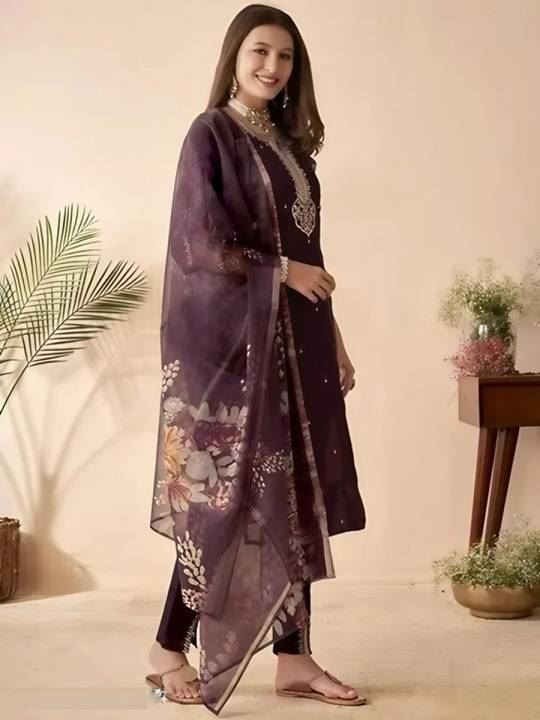 Wine Chanderi Kurta Pant with Heavy Thread Embroidery Sequins Work With Printed Dupatta