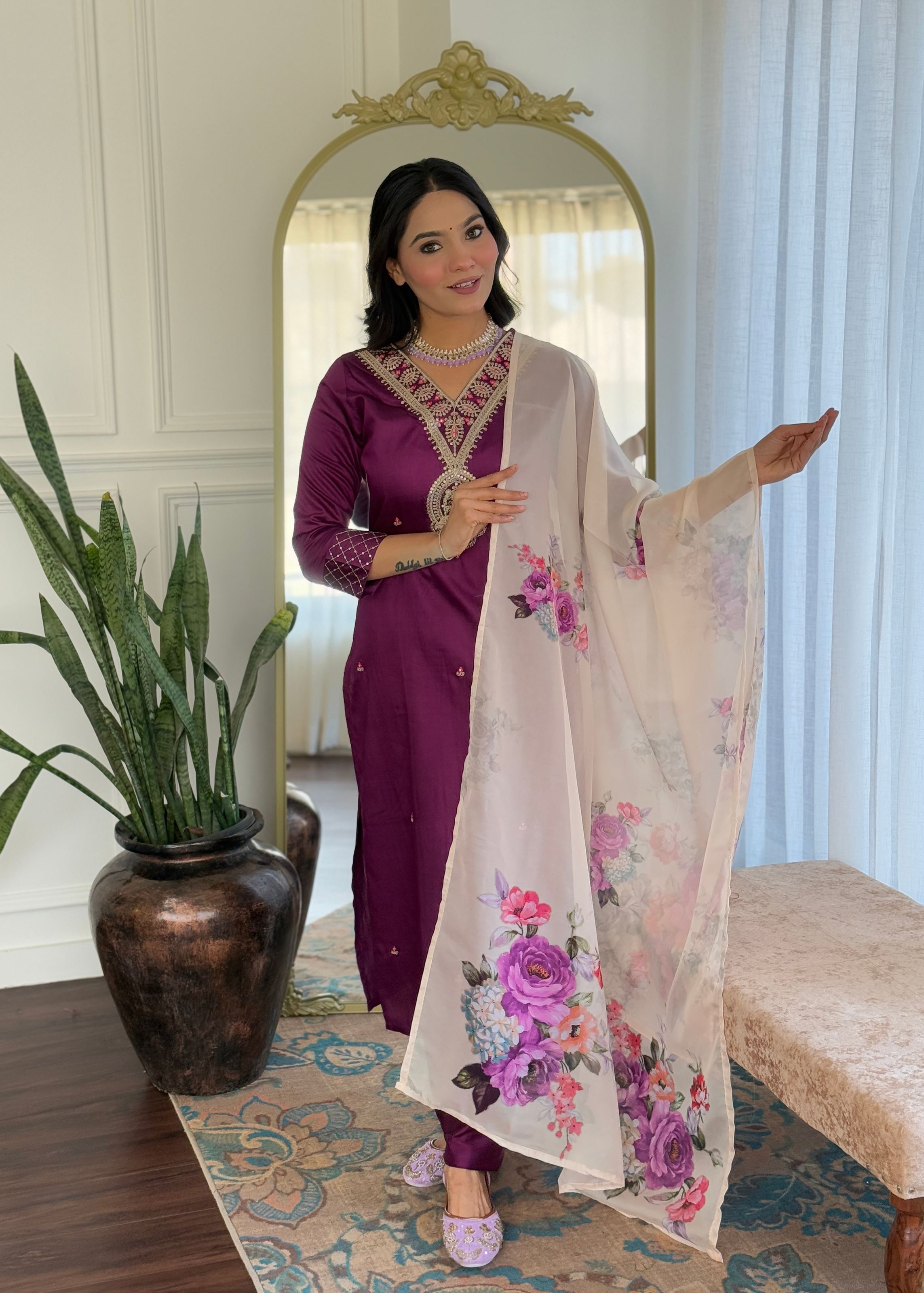Intricate embroidery work lends a sophisticated charm, elevating the outfit from everyday wear to festive-ready. Paired with matching wine-toned rayon slub pants and a coordinating Tabby dupatta, the set offers a balanced blend of tradition and modernity.