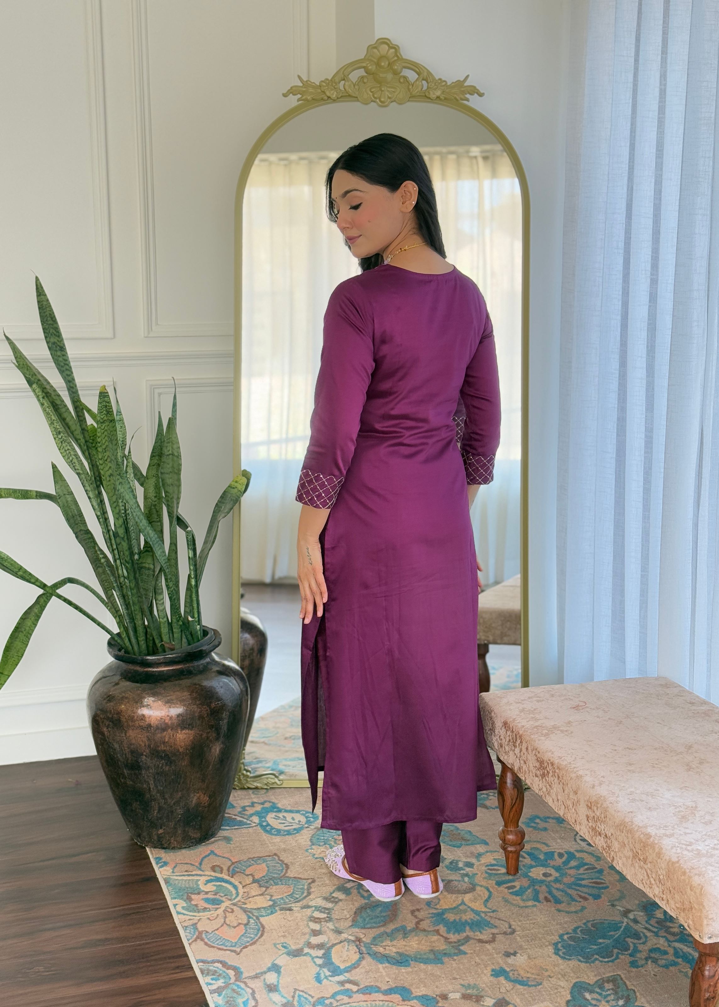 Wine Rayon Slub Elegant Kurta Pant Set With Embroidery Work