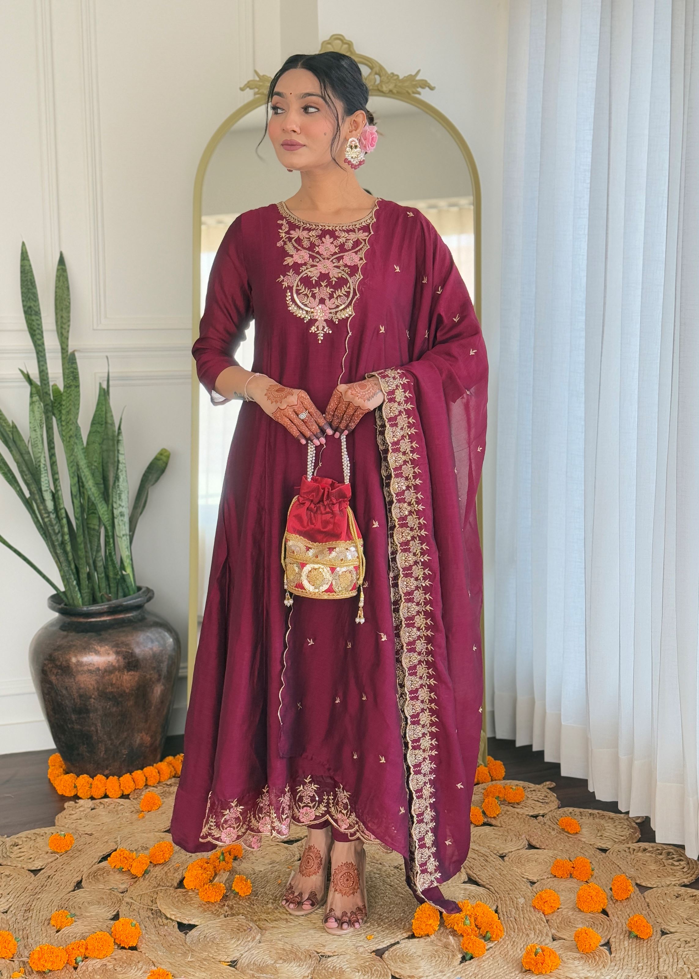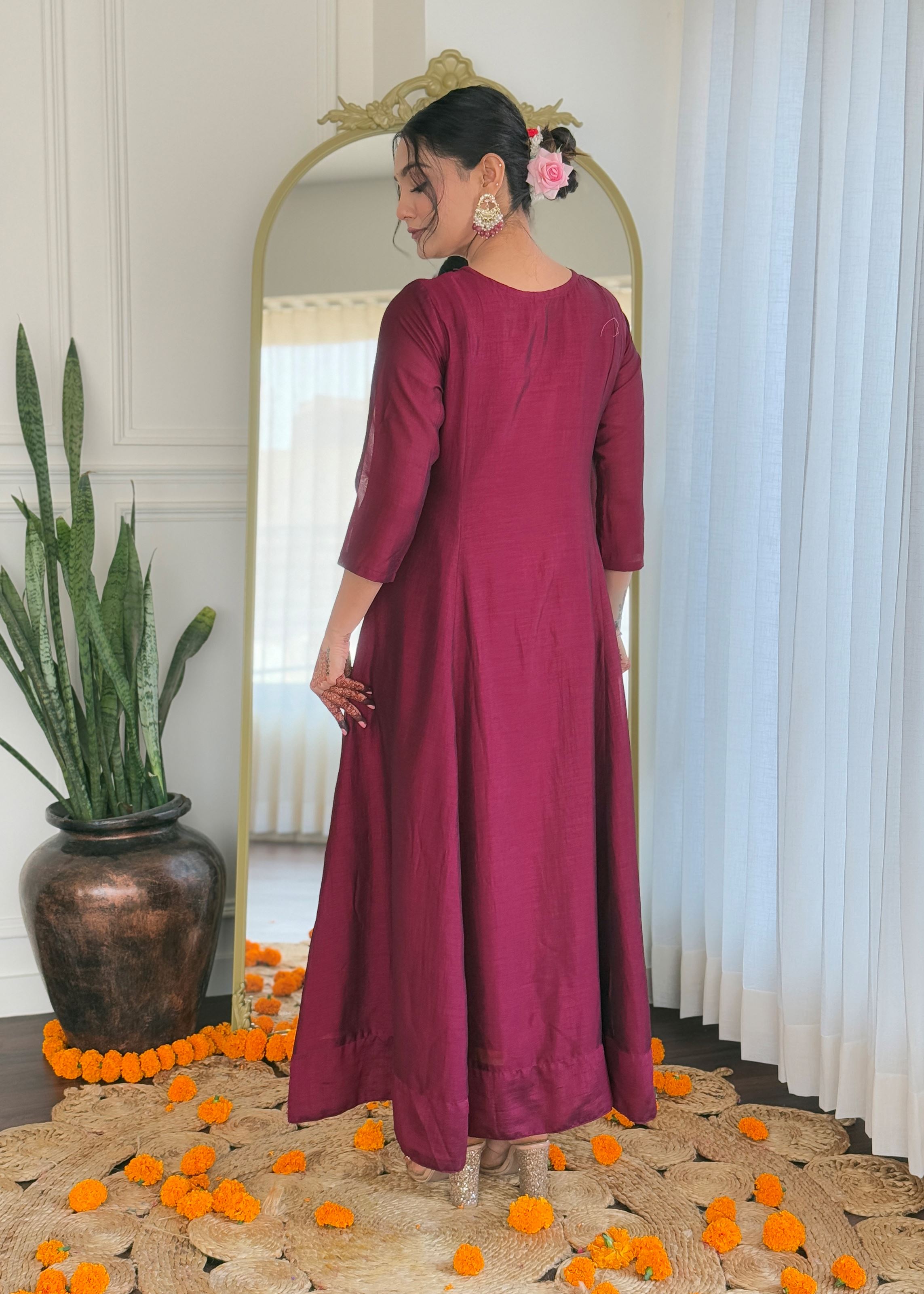The kurta features a soft U neckline and 3/4th sleeves, beautifully adorned with delicate embroidery work that reflects classic Indian craftsmanship. The coordinated rayon pants in the same wine tone offer a sleek, comfortable fit—perfect for long wear without compromising on style. Completing the look is a vichitra silk dupatta that adds a touch of fluid elegance, elevating the ensemble with its rich drape and soft sheen.