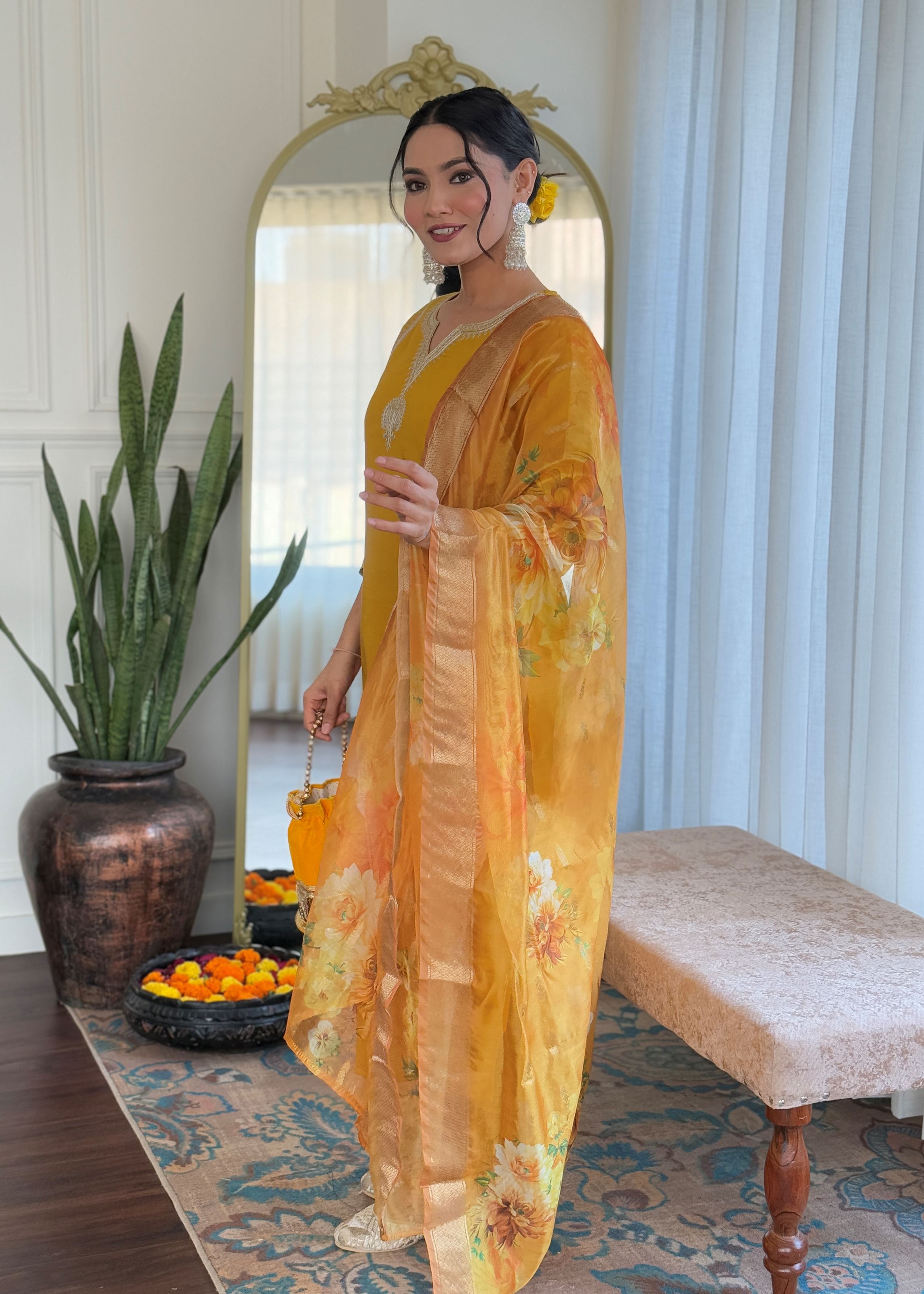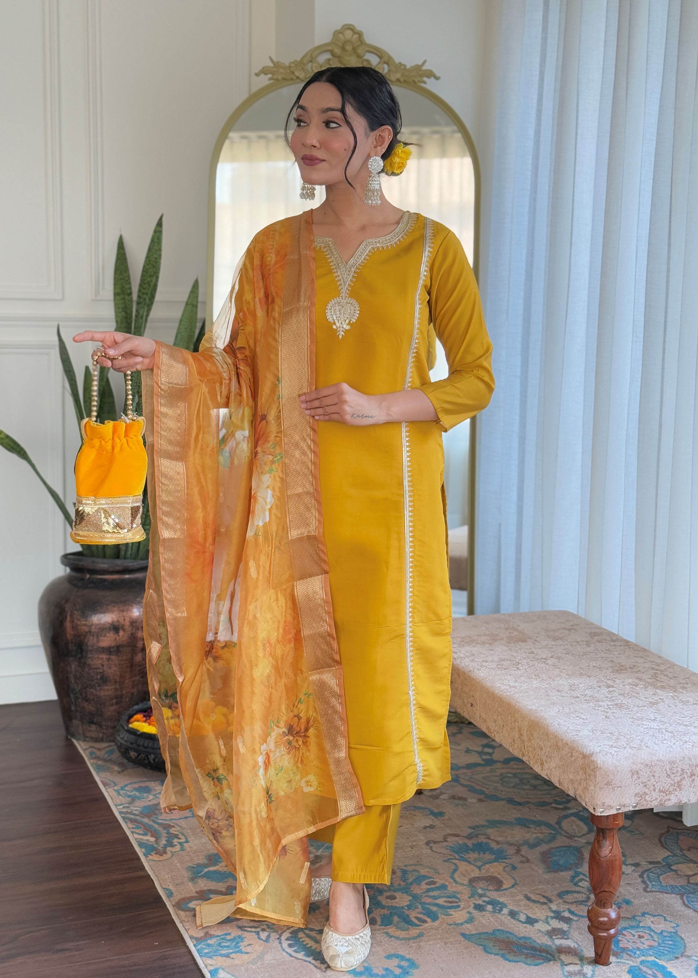 The matching Chanderi viscose pants complement the kurta perfectly, offering a seamless silhouette that flatters every body type. To complete the ensemble, the set includes a beautifully woven jacquard silk dupatta in a coordinating yellow shade, adding a luxurious finish with its elegant texture and traditional flair.