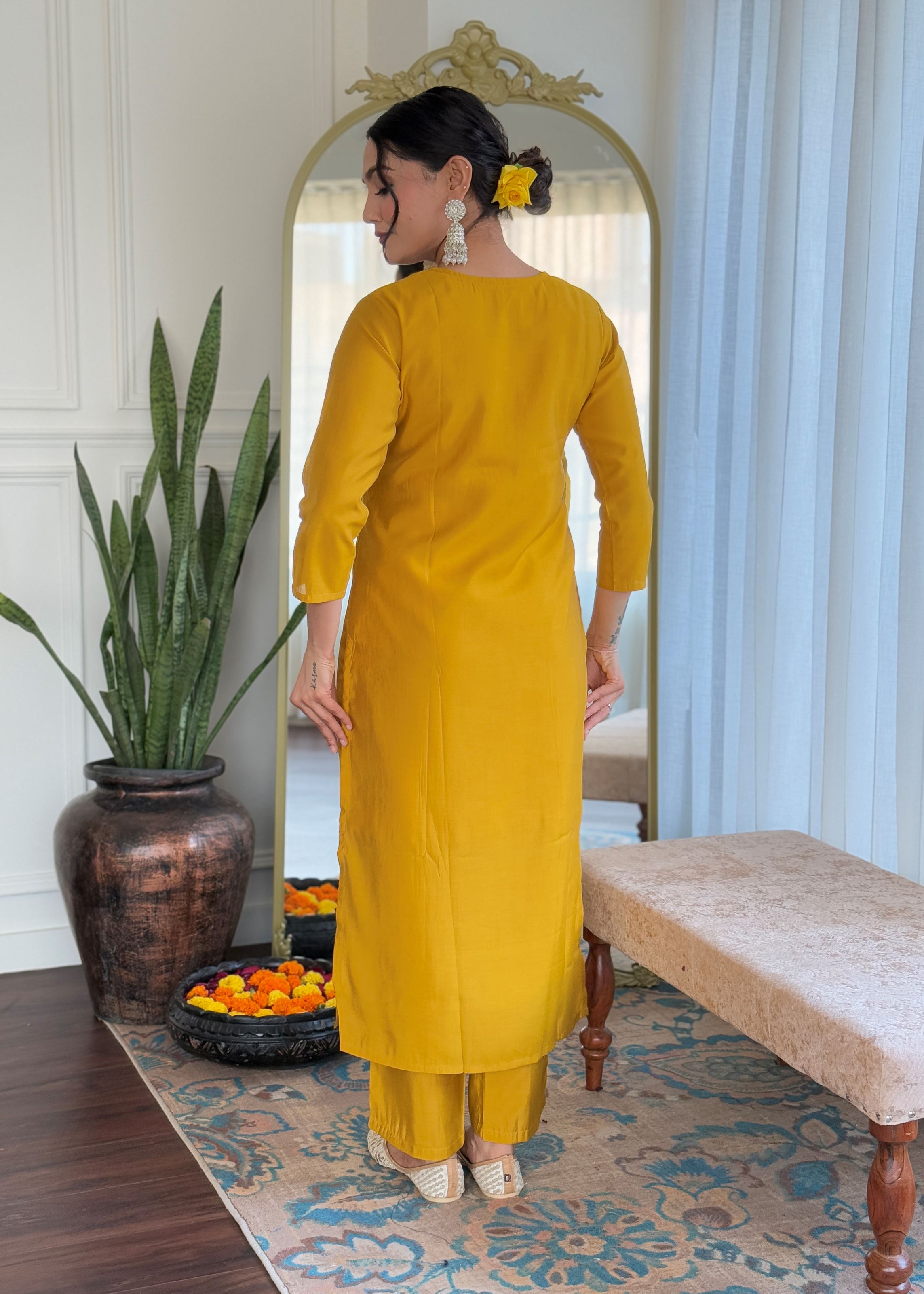 Yellow Chanderi Viscose Elegant Kurta Pant Set With Embroidery Work