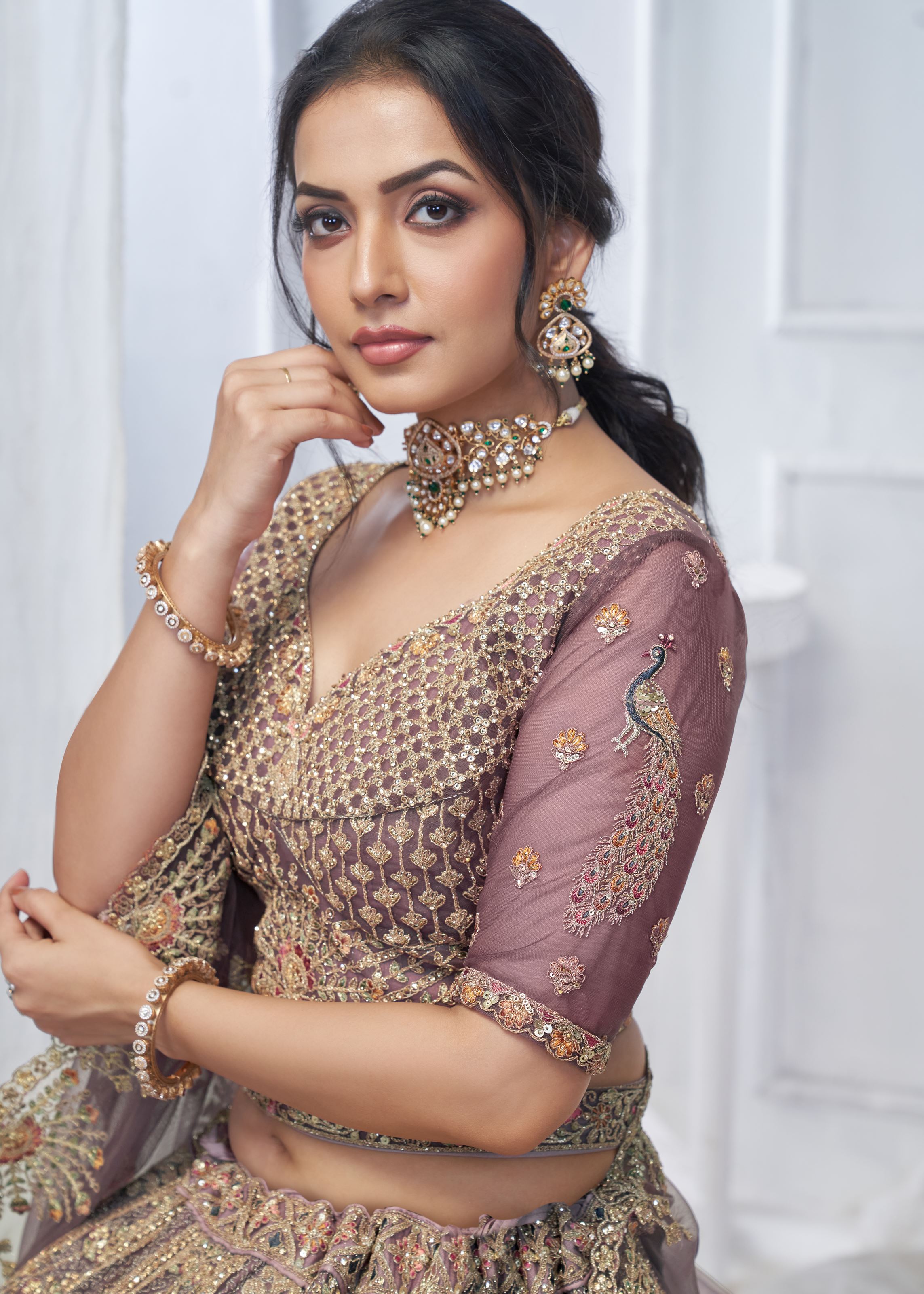 Purple Soft Net Lehenga Choli With Paisley And Peacock Motifs & Heavy Embroidery