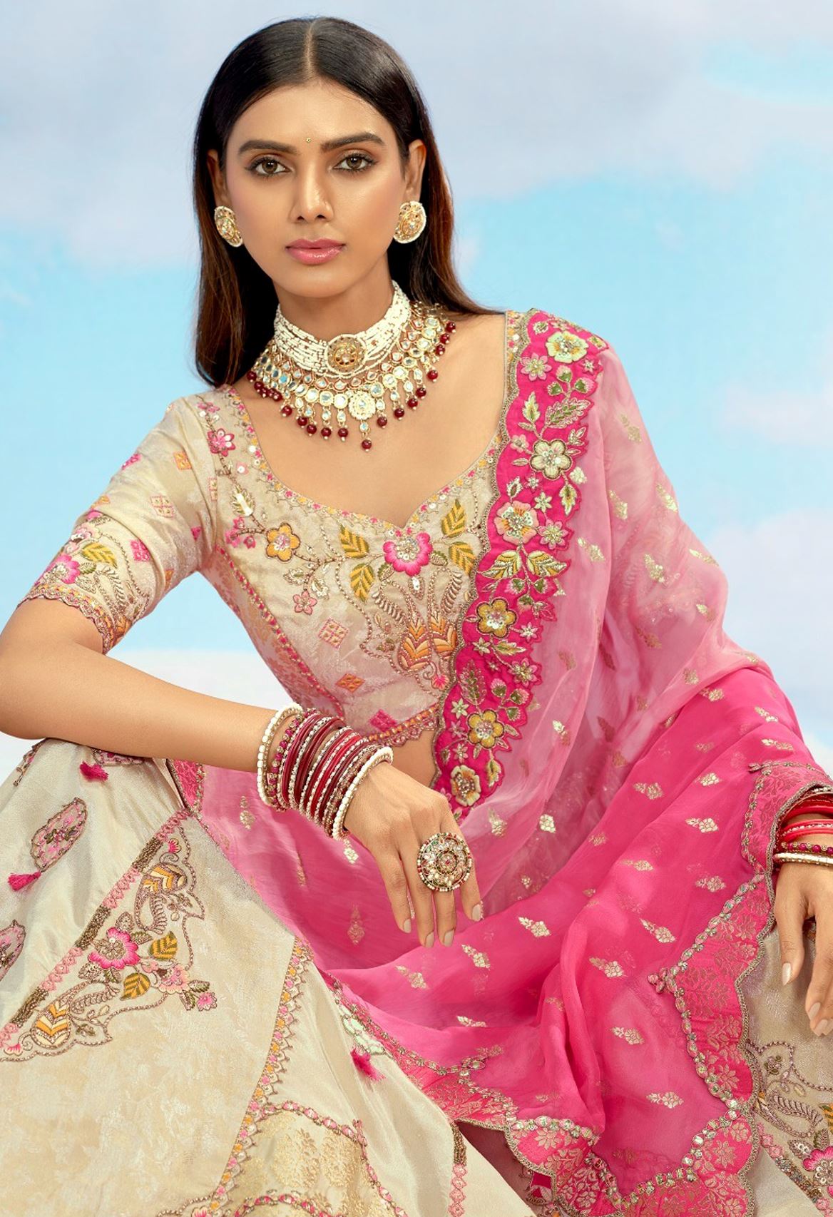 Beige Silk Lehenga Choli With Heavy Thread Embroidery, Zari With Sequins Work
