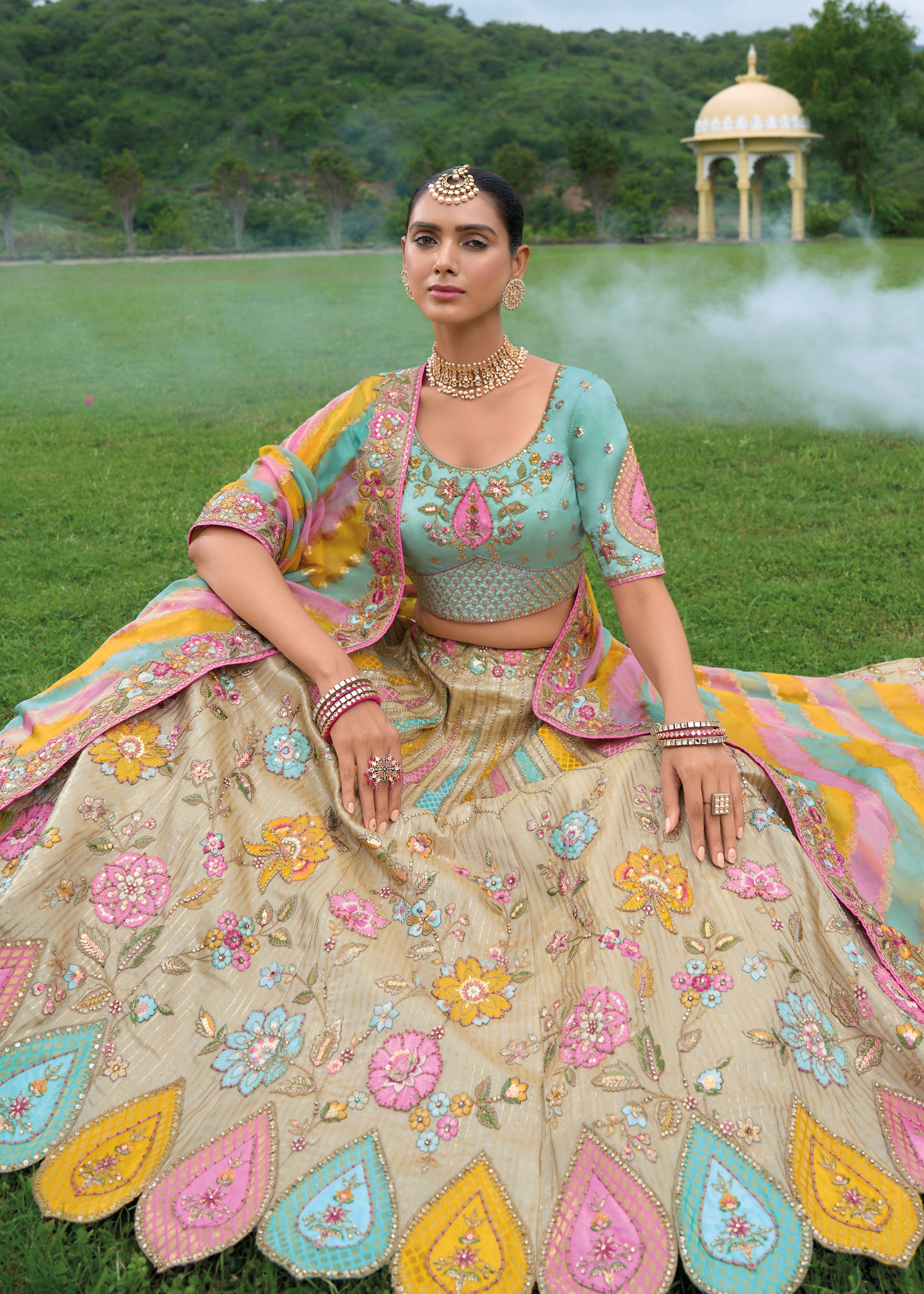Beige Heavy Silk Lehenga Choli With Heavy Thread Embroidery, Khatli With Sequins Work