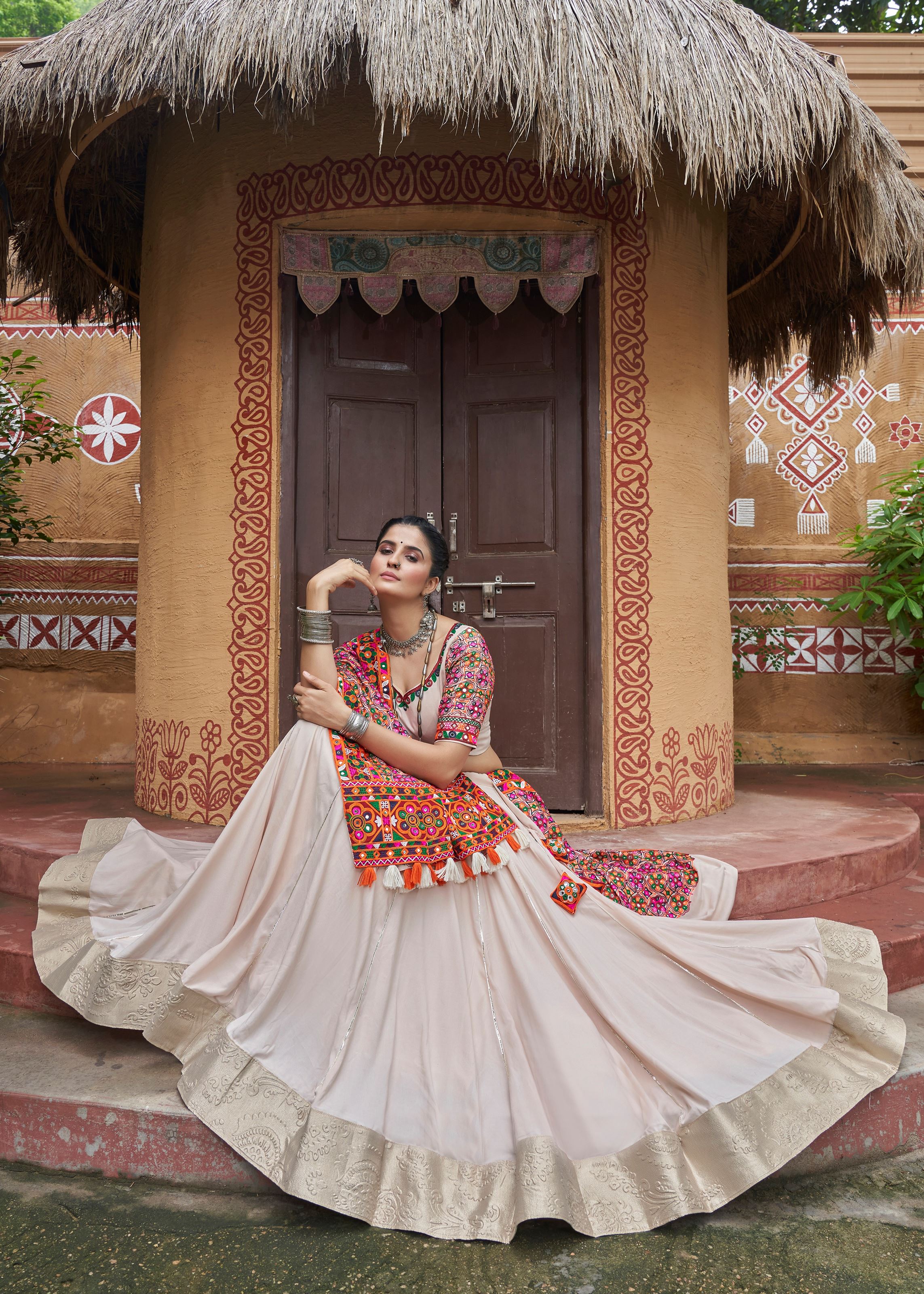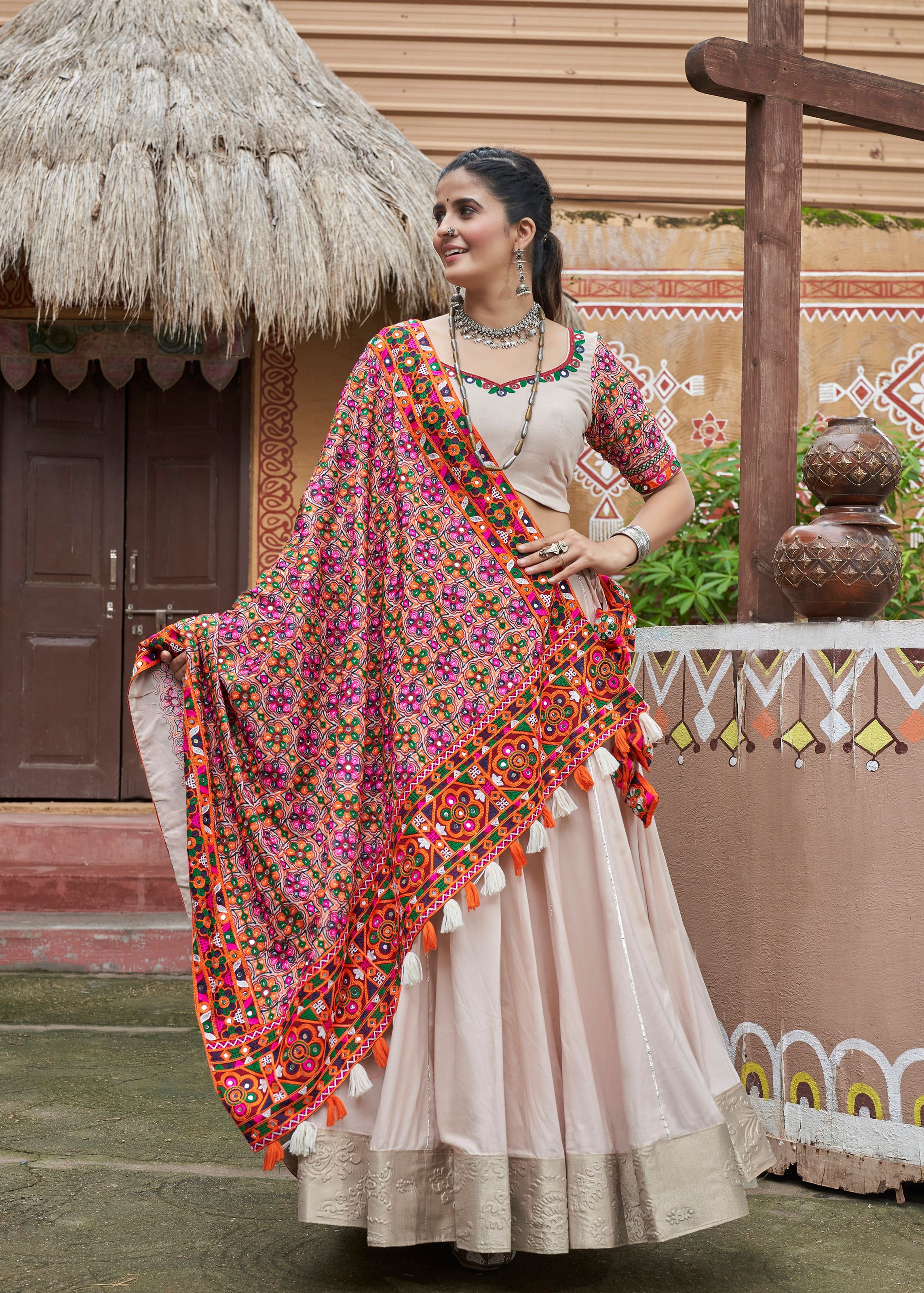The lehenga features a clean and flowing silhouette, offering comfort without compromising on charm. Paired with a matching beige Rayon blouse, the outfit presents a balanced and refined look. A coordinating Rayon dupatta adds a graceful layer, completing the ensemble with a soft and sophisticated finish.