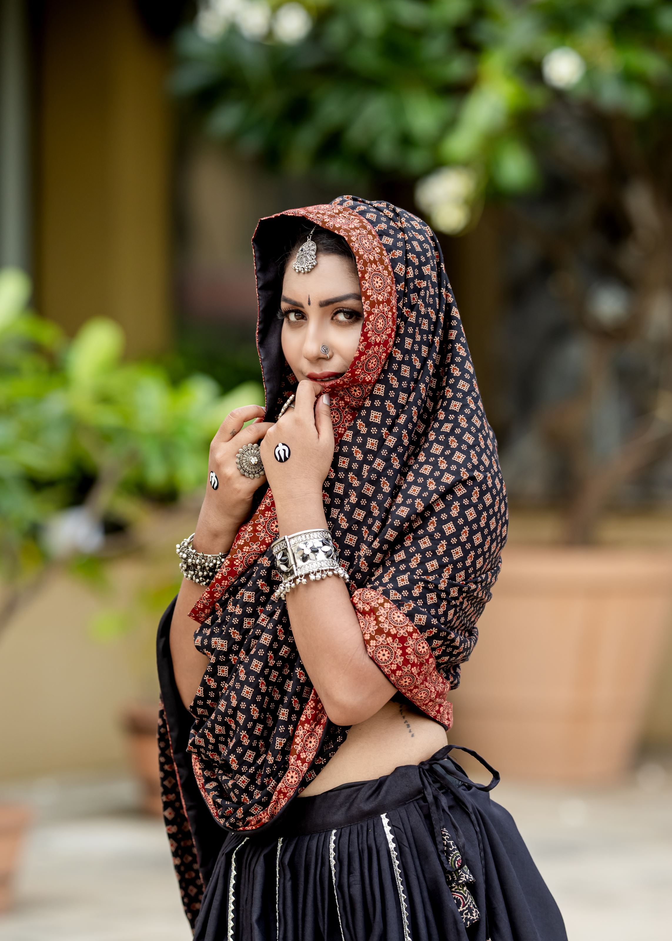 Showcase your festive spirit with this beautifully handcrafted Black and Maroon Printed Navratri Chaniya Choli With Cowrie Work from Aethnofit Fashions. Made from pure cotton, the lehenga in classic black features rich maroon print detailing that celebrates traditional artistry. The surface is adorned with subtle gotta and kodi (cowrie) work, adding both texture and cultural significance to the look.