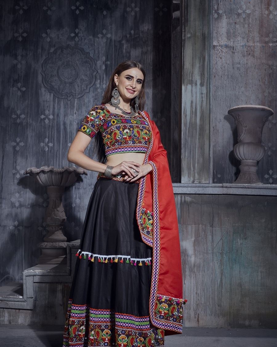 Drape yourself in cultural elegance with the Black and Red Navratri Chaniya Choli from Aethnofit Fashions, a beautifully crafted ensemble perfect for festive nights and traditional celebrations. The lehenga, made from rich art silk, features intricate Gamthi embroidery combined with delicate lace work, offering a timeless look that exudes grace and heritage.