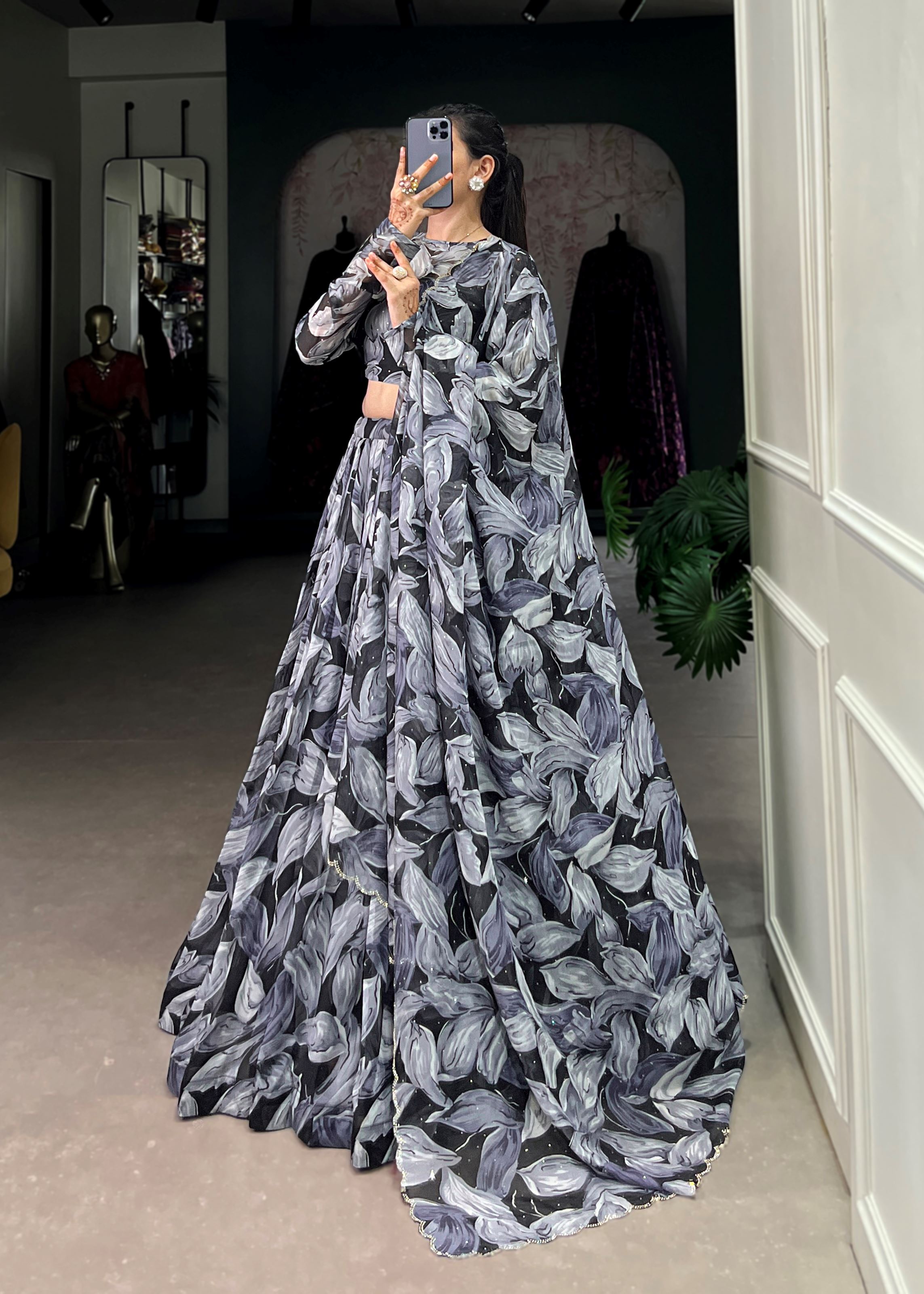 Command attention with the Black Elegance Printed Tabby Silk Lehenga with Hotfix Work, a stunning blend of boldness and sophistication from Aethnofit Fashions. This monochrome masterpiece is crafted in luxurious Tabby Silk, offering a glossy finish and elegant fall that elevates every movement. The black lehenga is beautifully enhanced with artistic prints and shimmering hotfix embellishments, making it an ideal choice for evening galas, receptions, or cocktail sangeets.