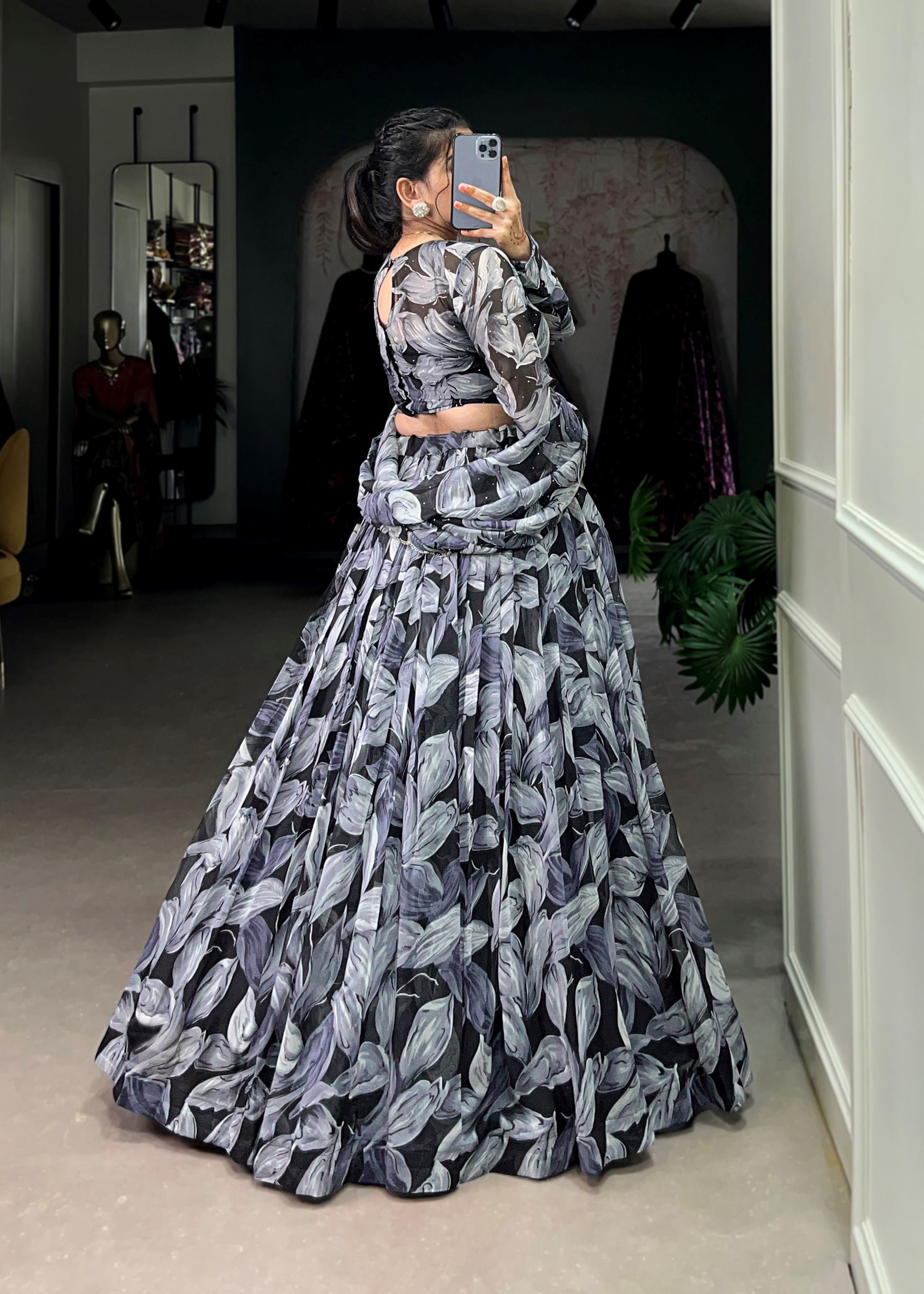 The coordinated black choli, also in Tabby Silk, continues the rich theme, while the matching black dupatta completes the look with a graceful, layered silhouette. Whether styled with diamond jewelry or contrasting metallic accessories, this lehenga offers endless styling possibilities — chic, classic, and contemporary all in one.