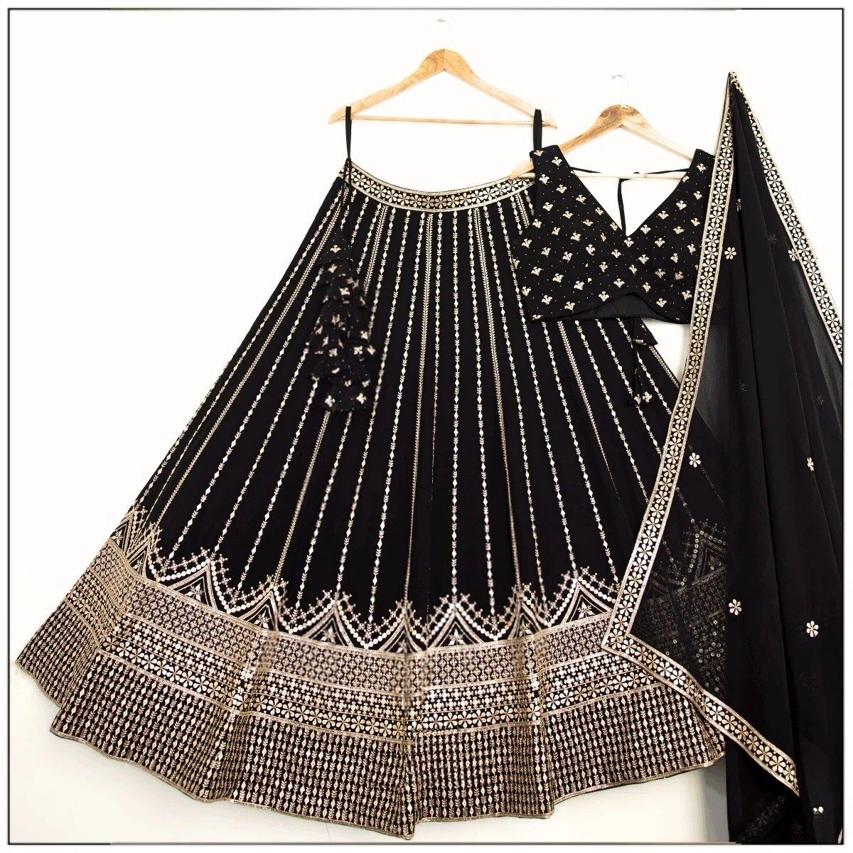 The deep black lehenga is embellished with a captivating mix of 3mm and 5mm sequins, strategically placed to reflect light from every angle. Paired with intricate jari embroidery, the ensemble radiates opulence and drama. The matching choli and flowing faux georgette dupatta complete the look with sophisticated balance, offering both structure and fluidity.