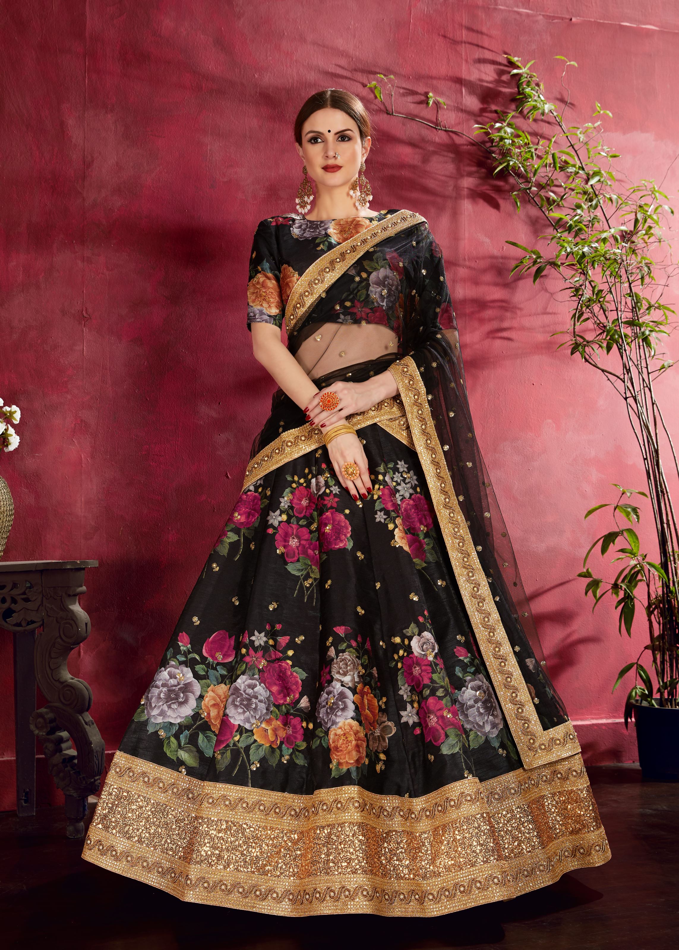 Black Heavy Banglori Silk Lehenga Choli With Floral Print, Dori, Zari And Sequins Embroidery ----- SIZE (SEMI STITCHED) AVAILABLE UP TO 42 BUST AND WAIST