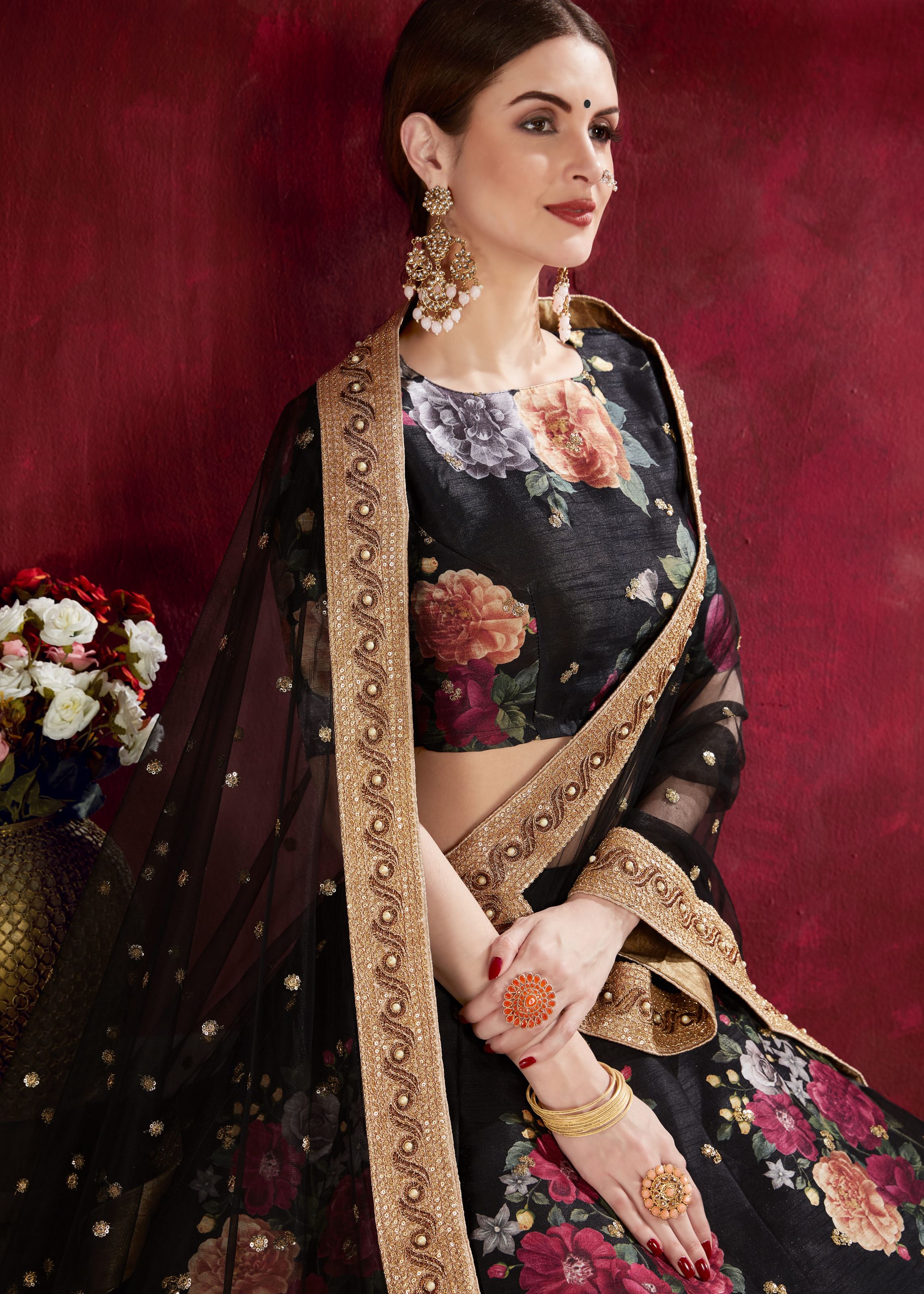 Black Lehenga Choli With Floral Print, Dori, Zari And Sequins Embroidery