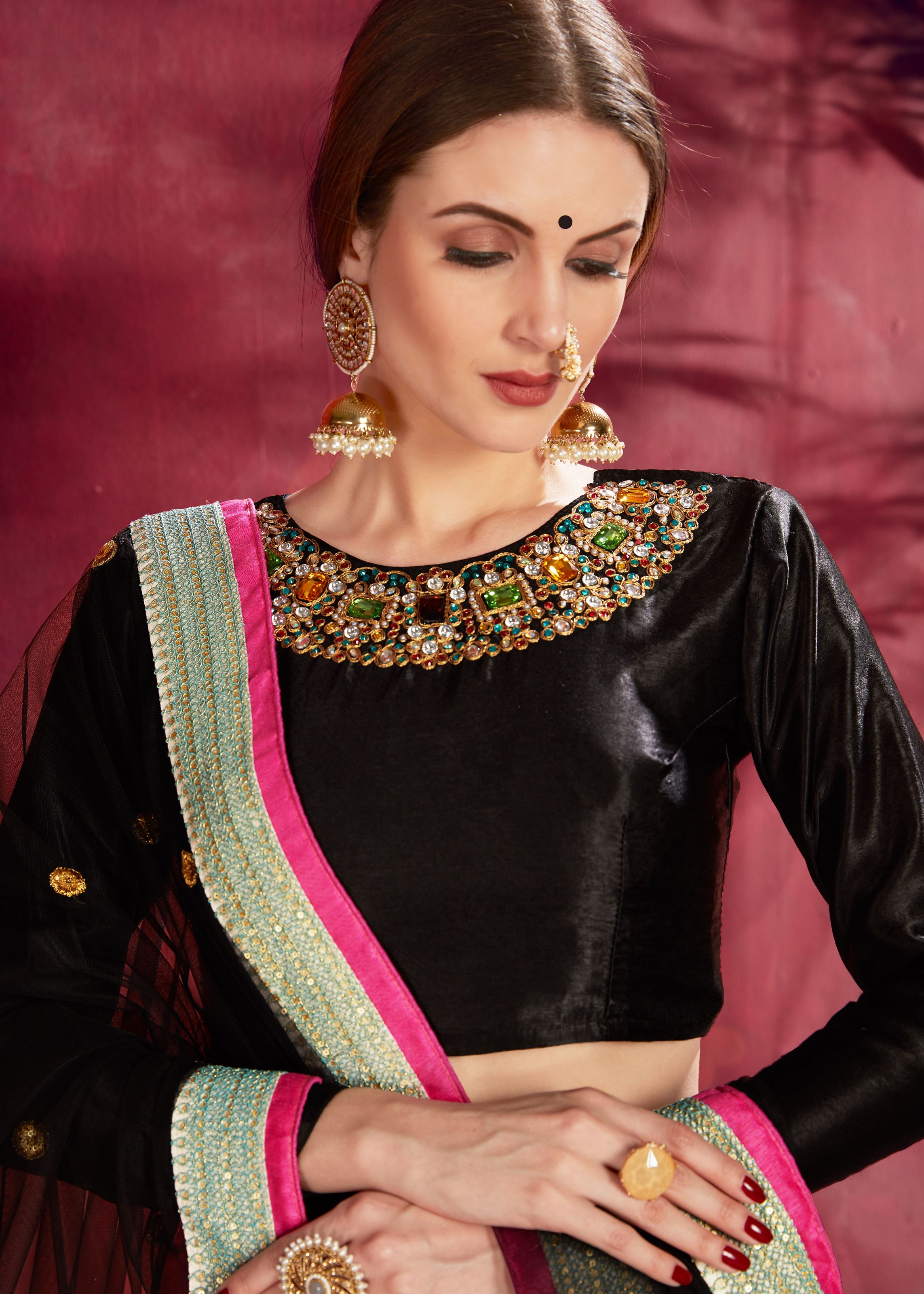 Black-Multicolor Heavy Banglori Silk Lehenga Choli With Floral Print, Dori, Zari And Sequins Embroidery | Diamond Work Neckline Blouse ----- SIZE (SEMI STITCHED) AVAILABLE UP TO 42 BUST AND WAIST