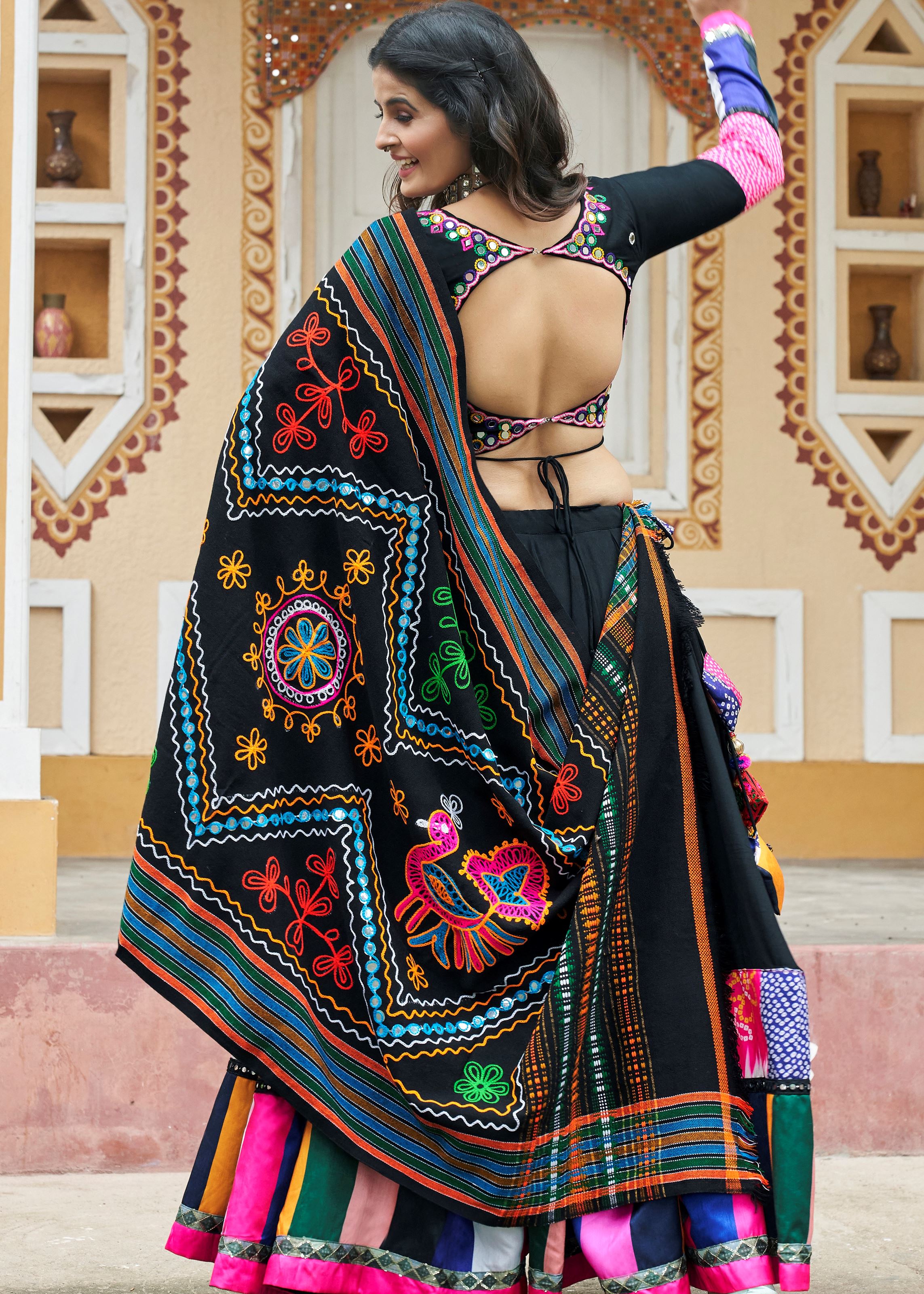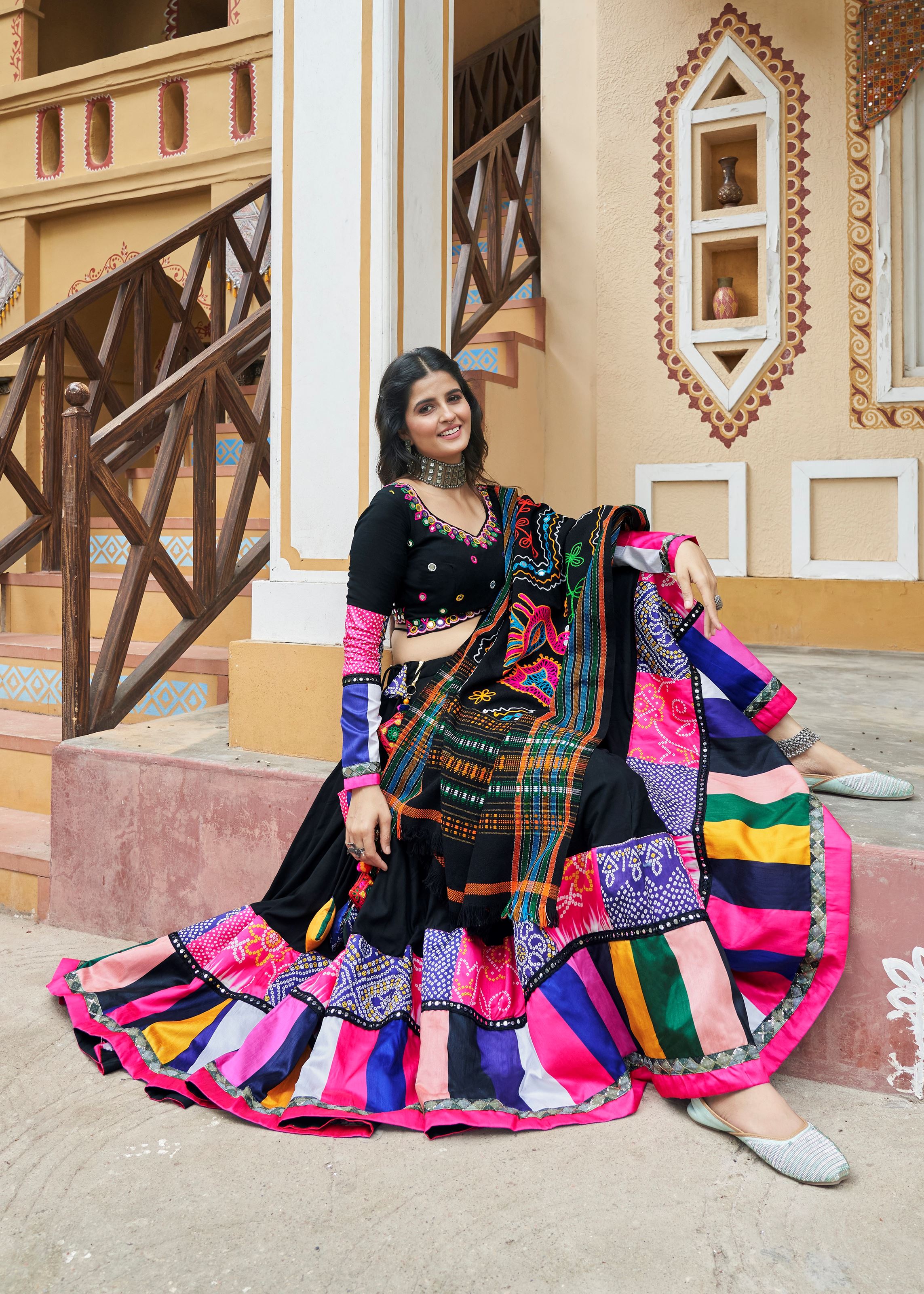 The full set includes a matching Rayon blouse with coordinated prints that enhance the ensemble’s visual appeal, offering a sleek and unified look. A lightweight Rayon dupatta in the same striking black adds a graceful drape, making this outfit comfortable, stylish, and easy to wear all day long.