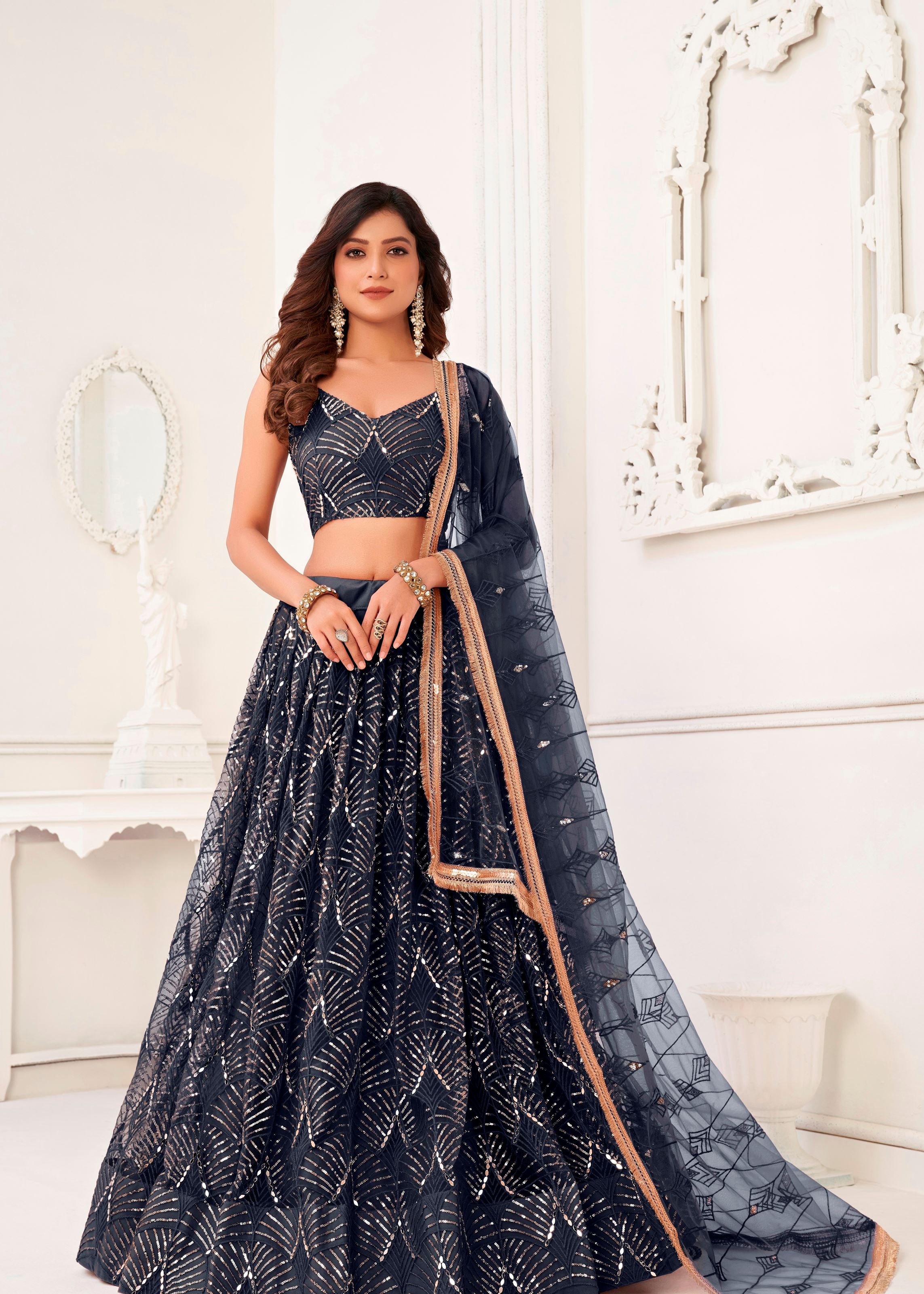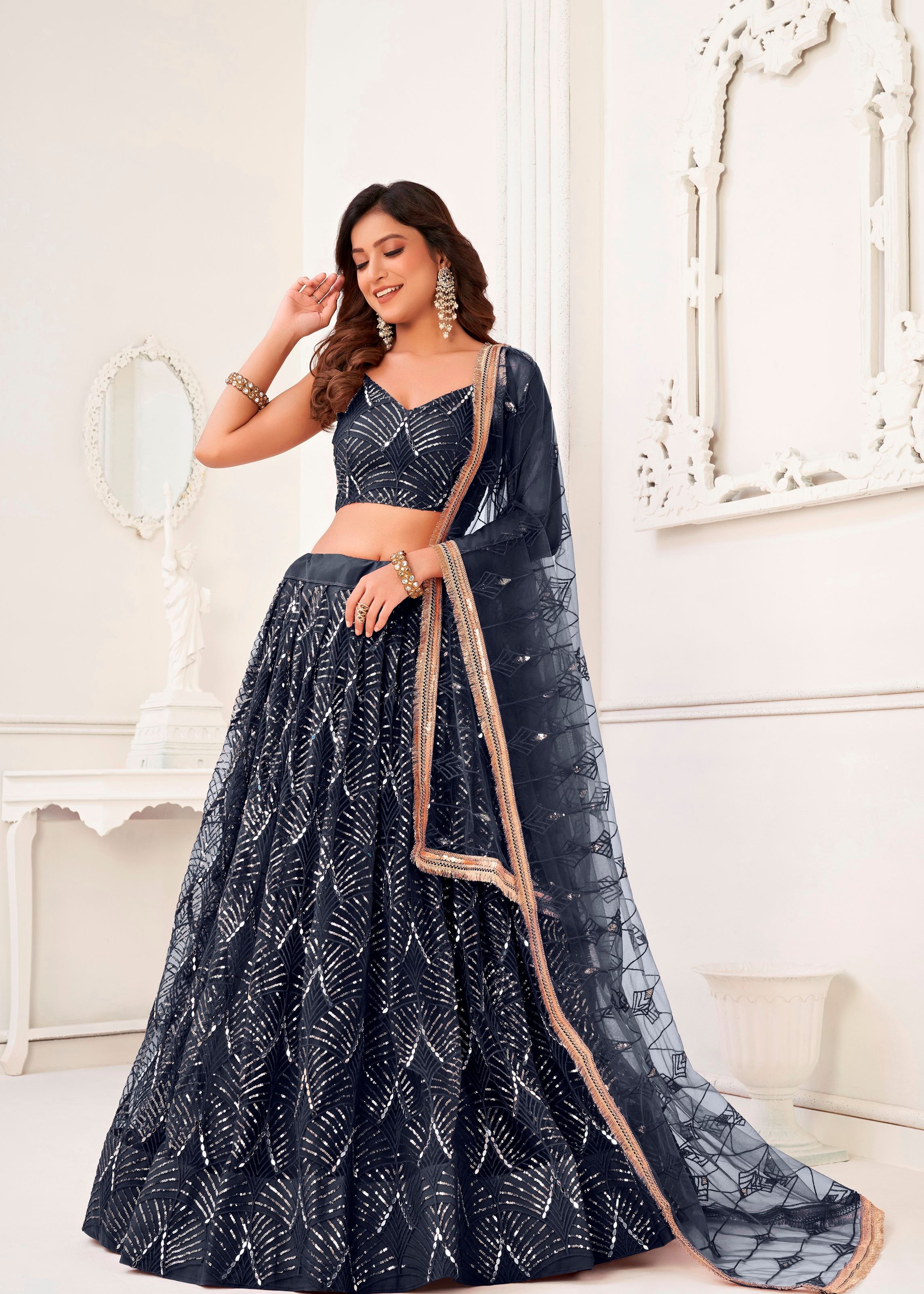 The matching net blouse mirrors the intricate mirror and thread work, creating a seamless and refined look from every angle. Designed for comfort and movement, the breathable net fabric ensures ease while exuding elegance. Ideal for those who seek ethnic fashion with a glamorous edge, this lehenga delivers timeless beauty with radiant charm.