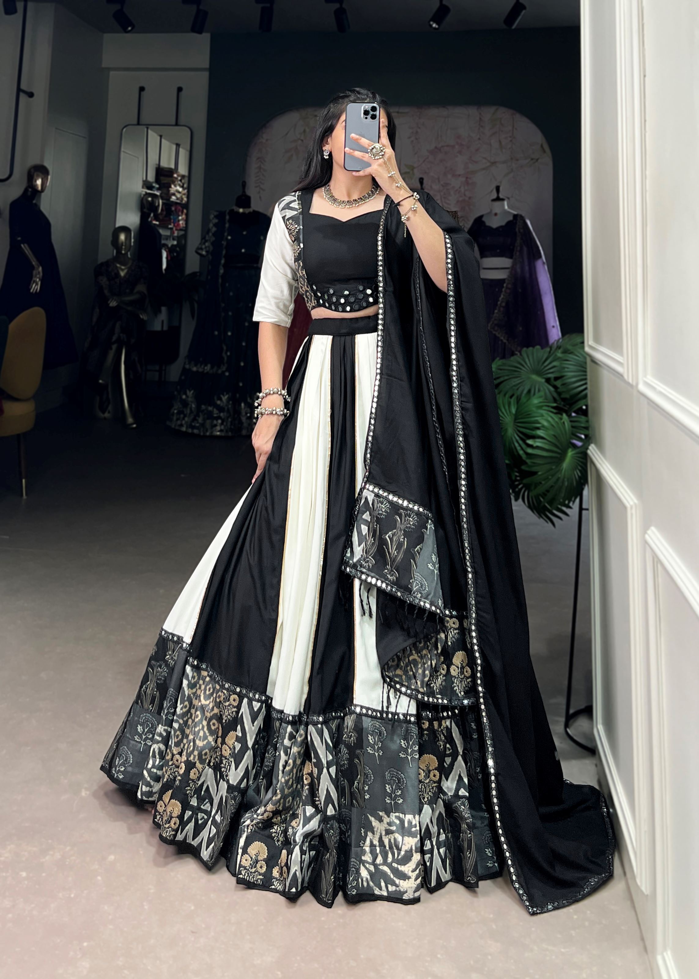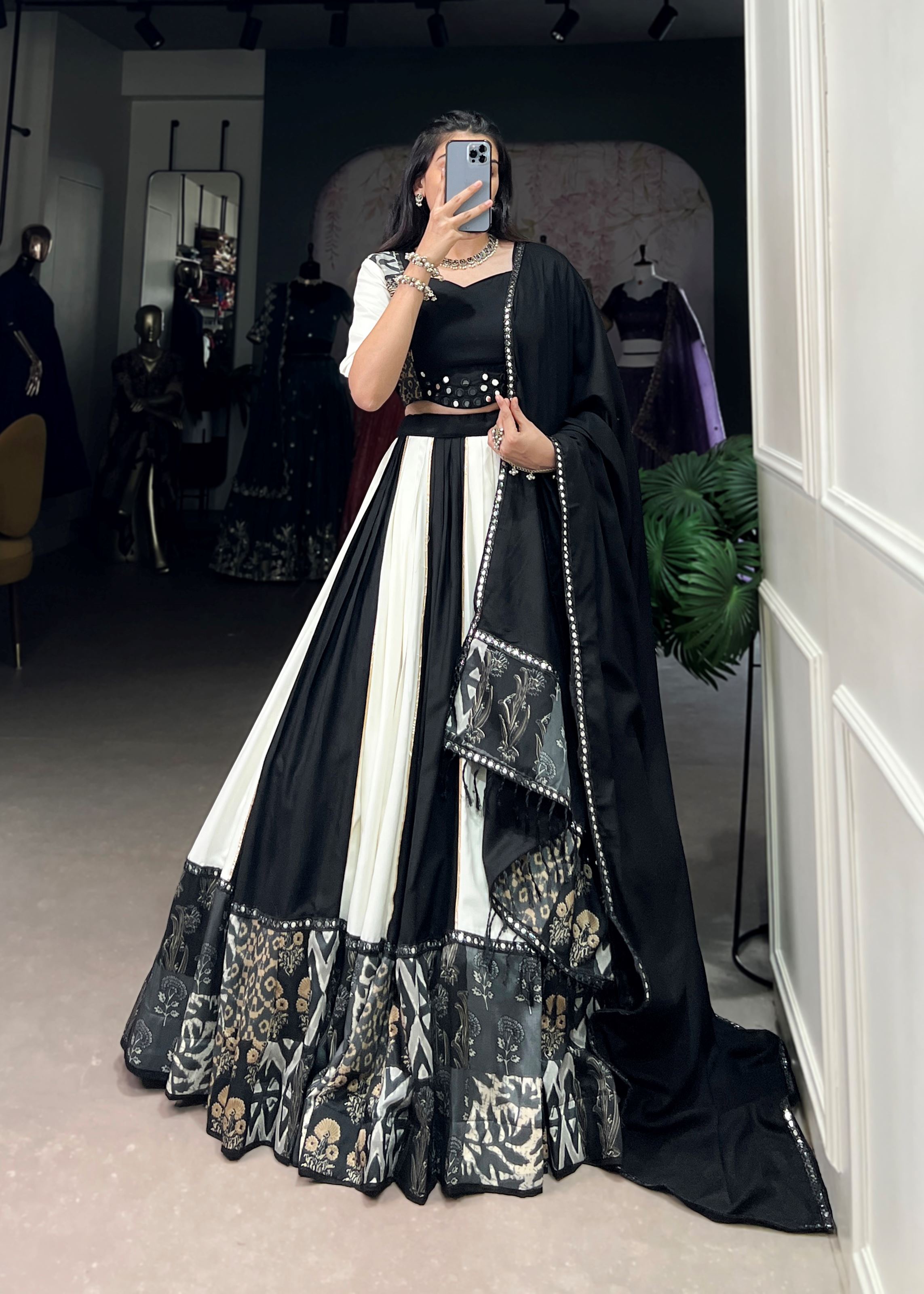 Black Printed & Plain Rayon Lehenga Choli with Mirror Lace and Gota Patti Sparkle