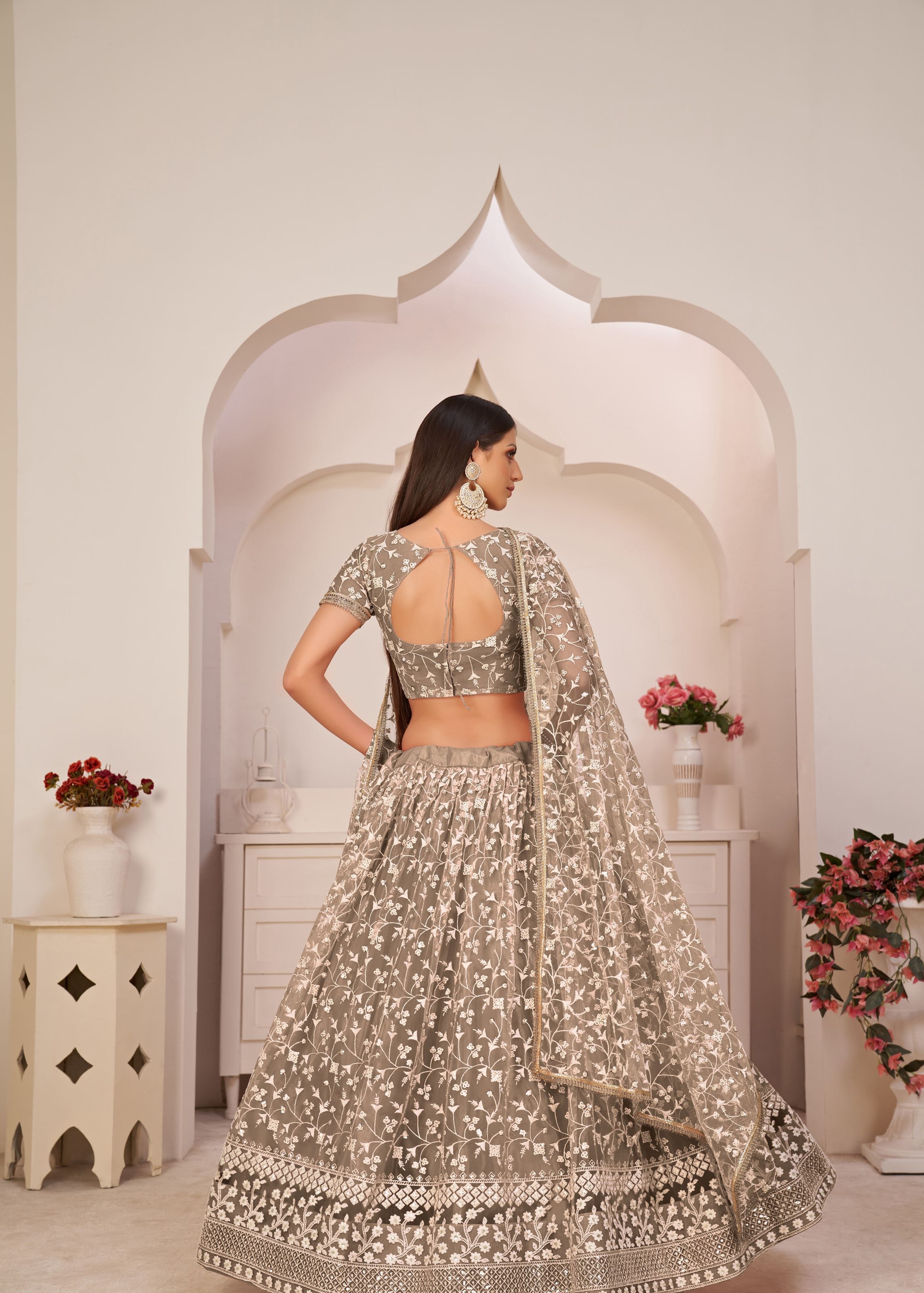 Brown Net Lehenga Choli with Thread & Zari Sandwich Sequin Embroidery Work