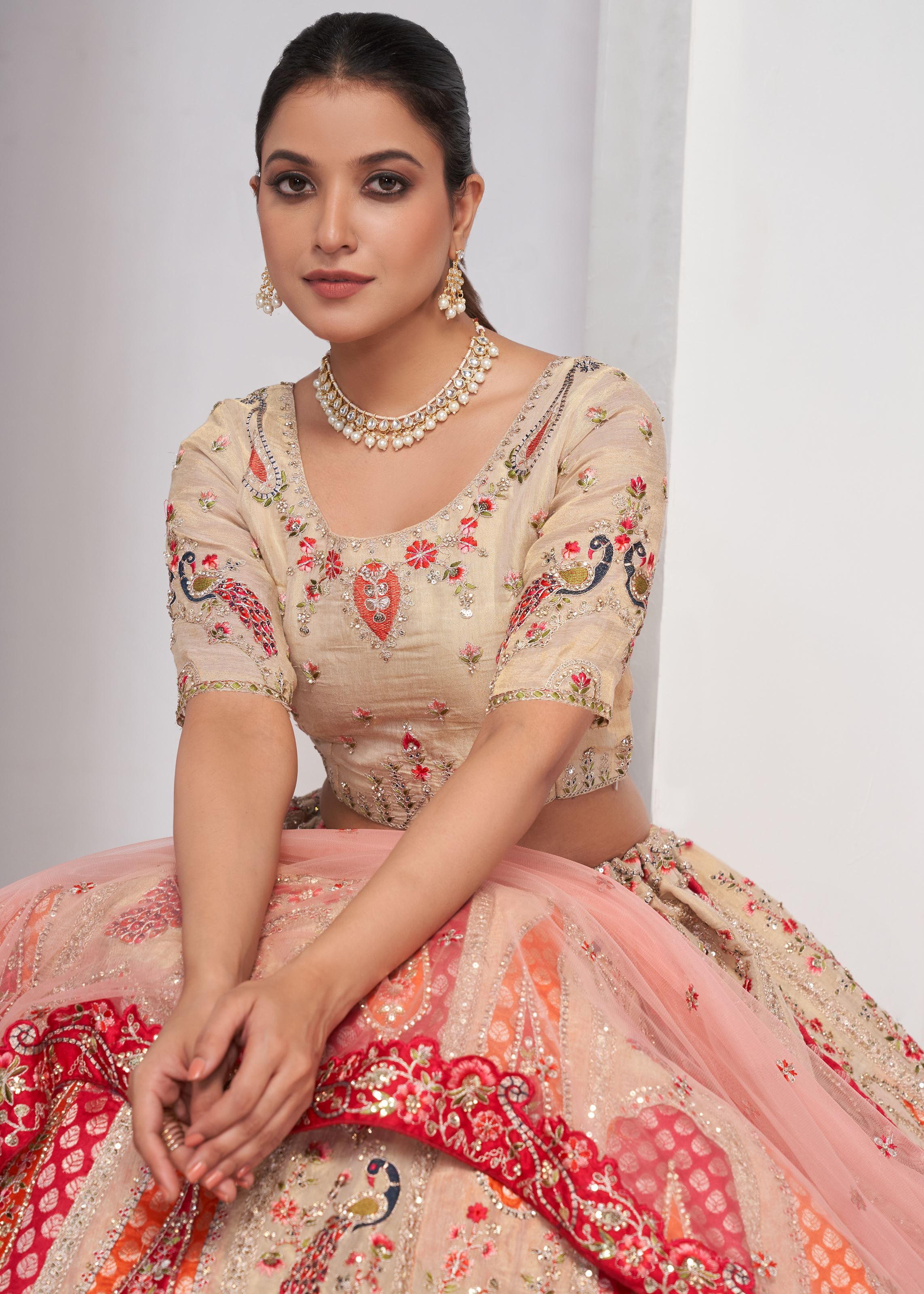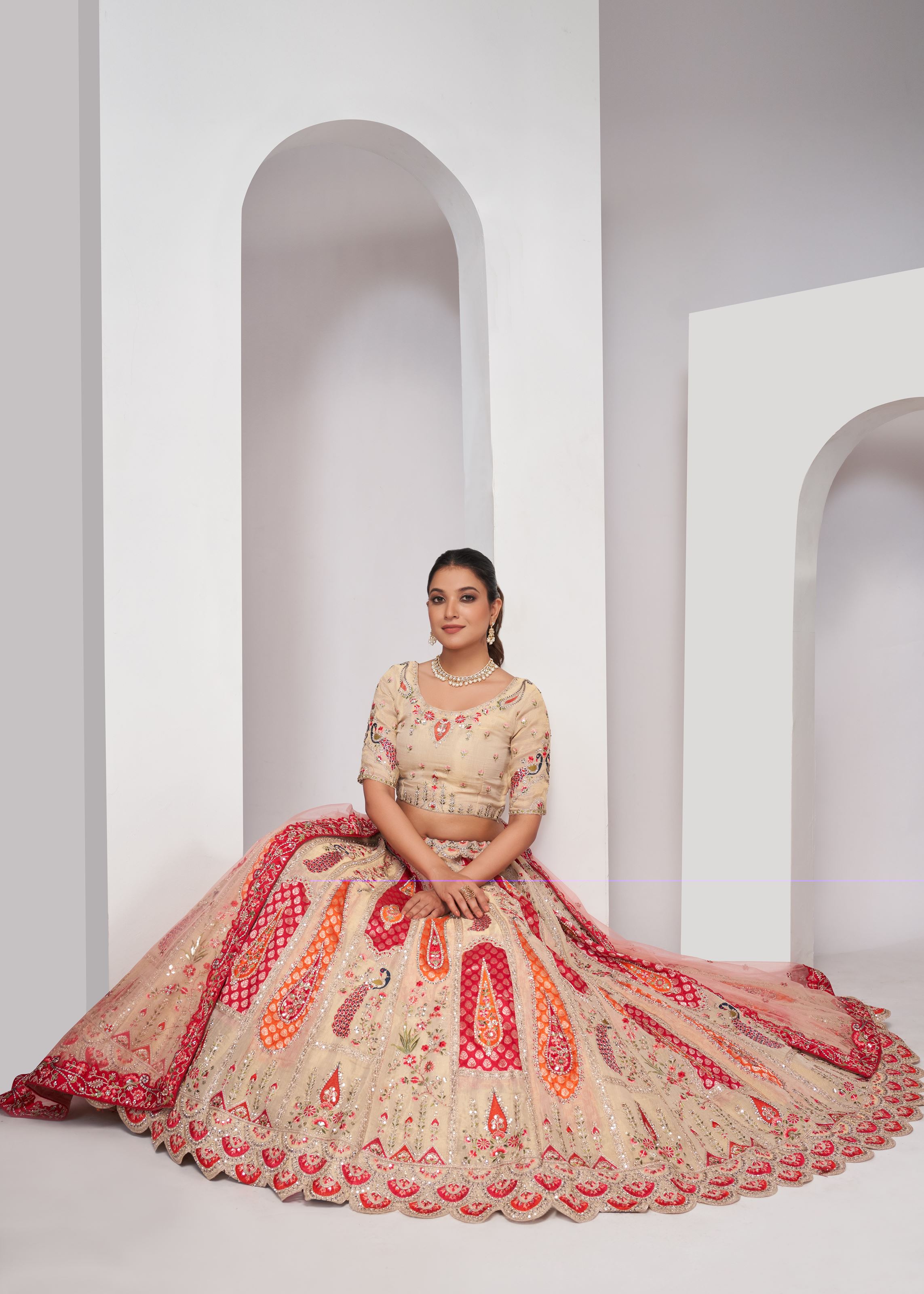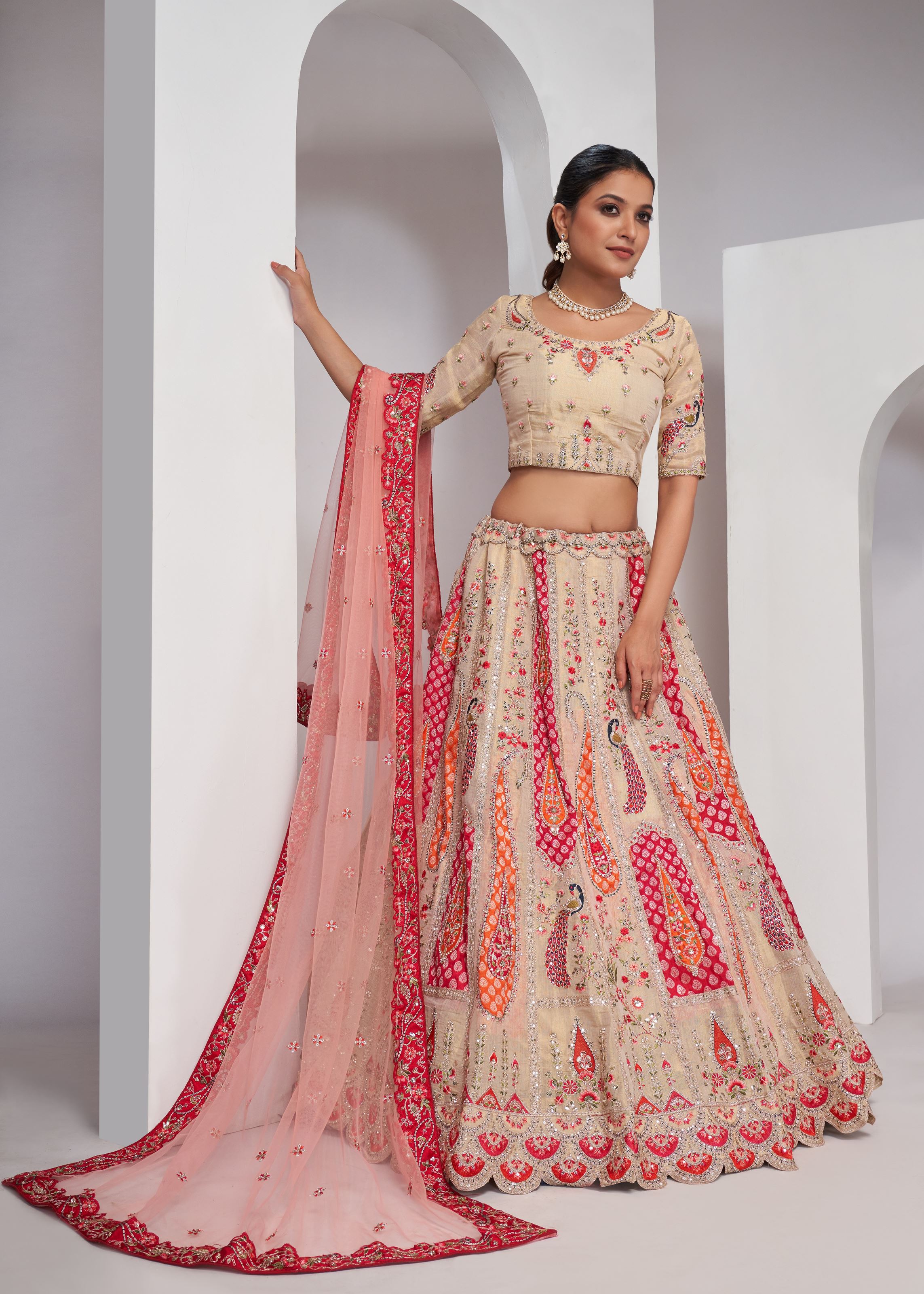 Chiku Banarasi Silk Lehenga Choli With Paisely Motifs Beautiful Peacock Embroidered In Bright Cream Colour