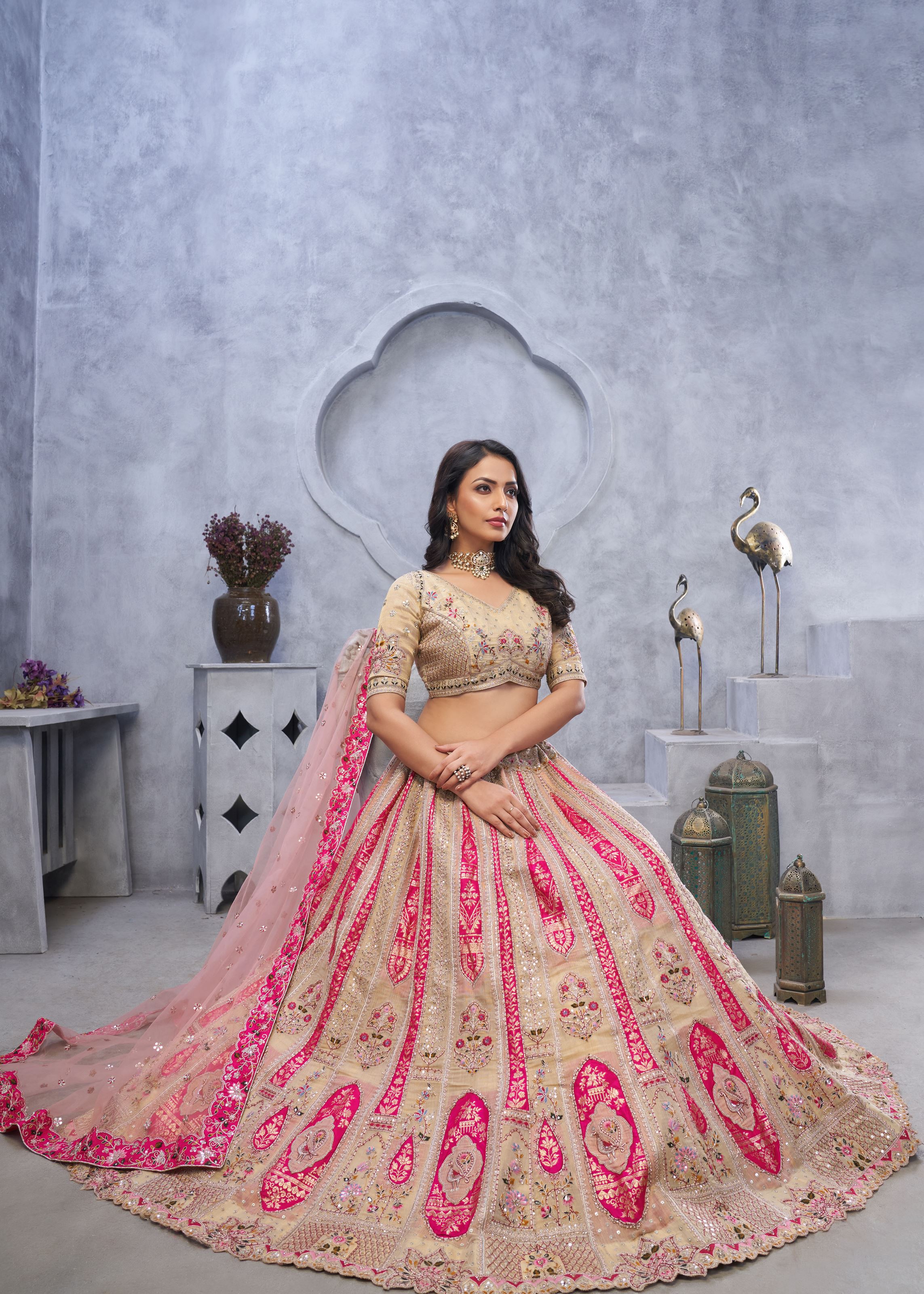 Chiku Organza Silk Intricate Paisley Motifs Traditional Embroidered Wedding Lehenga Choli With Soft Net Dupatta