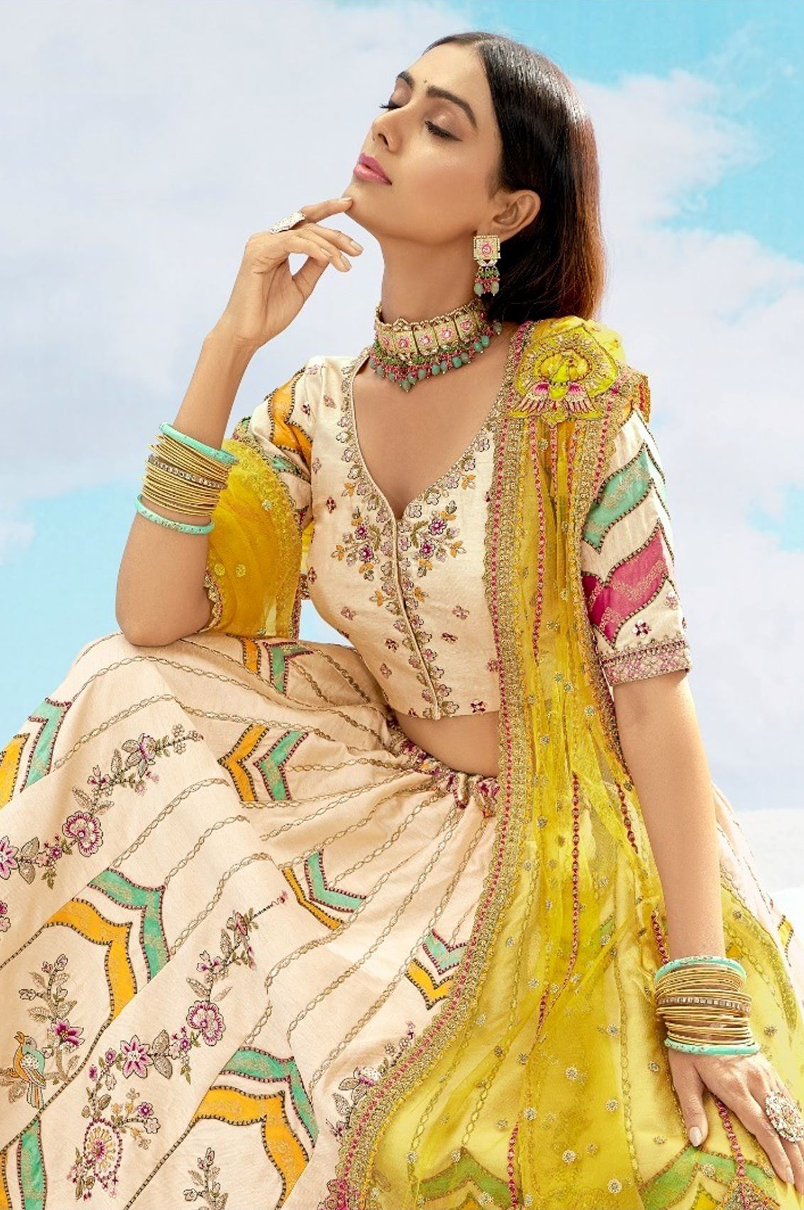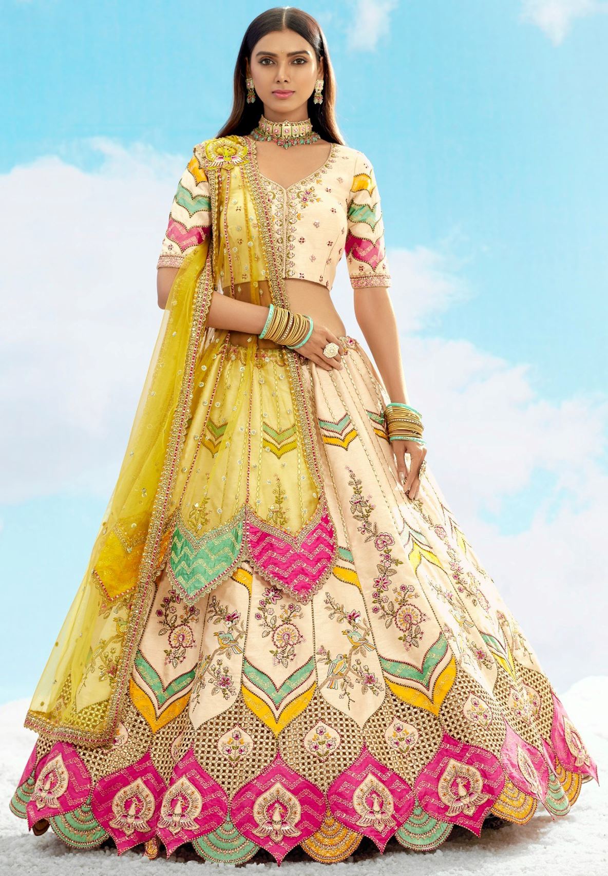 Cream Silk Lehenga Choli With Heavy Thread Embroidery, Zari With Sequins Work