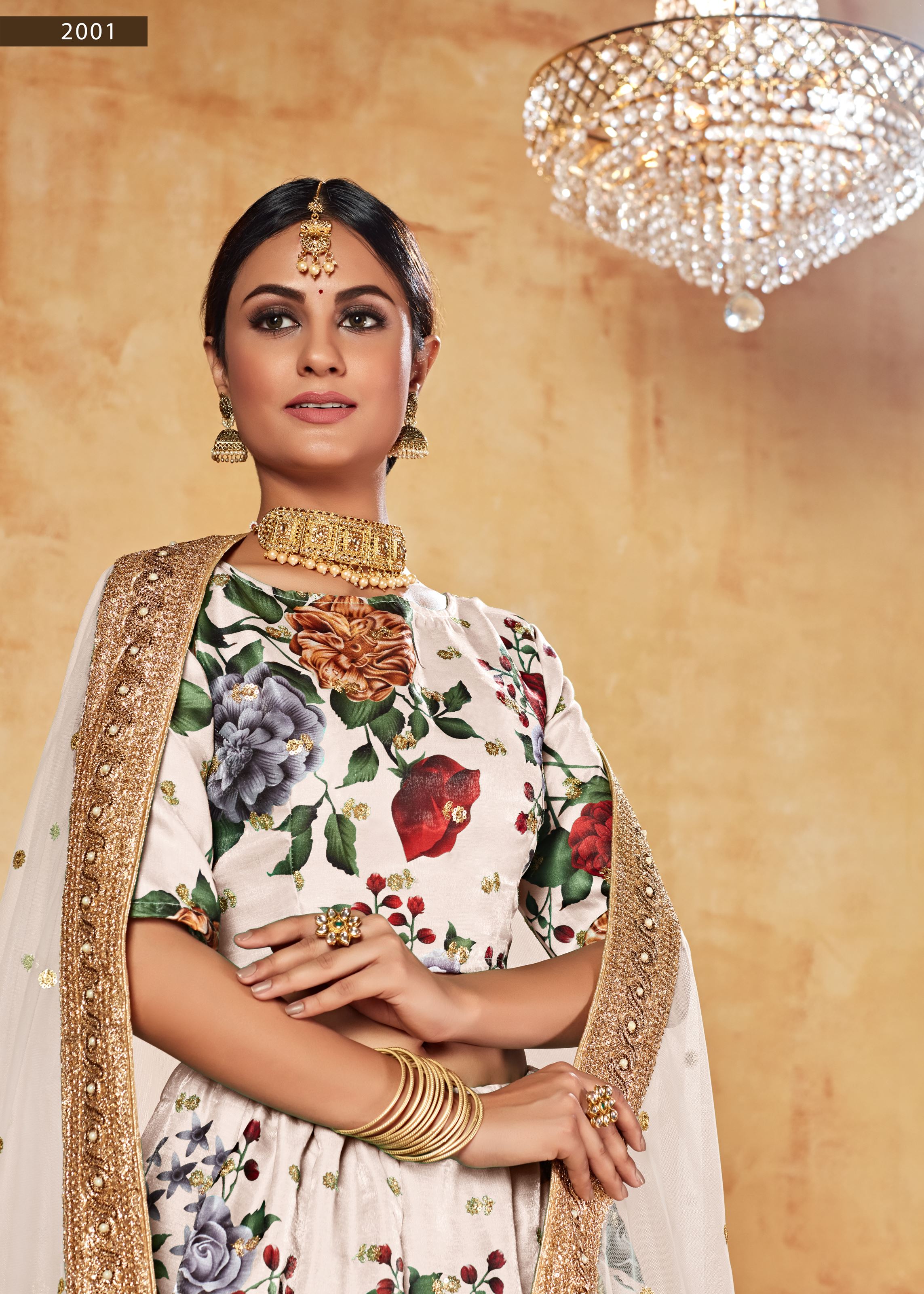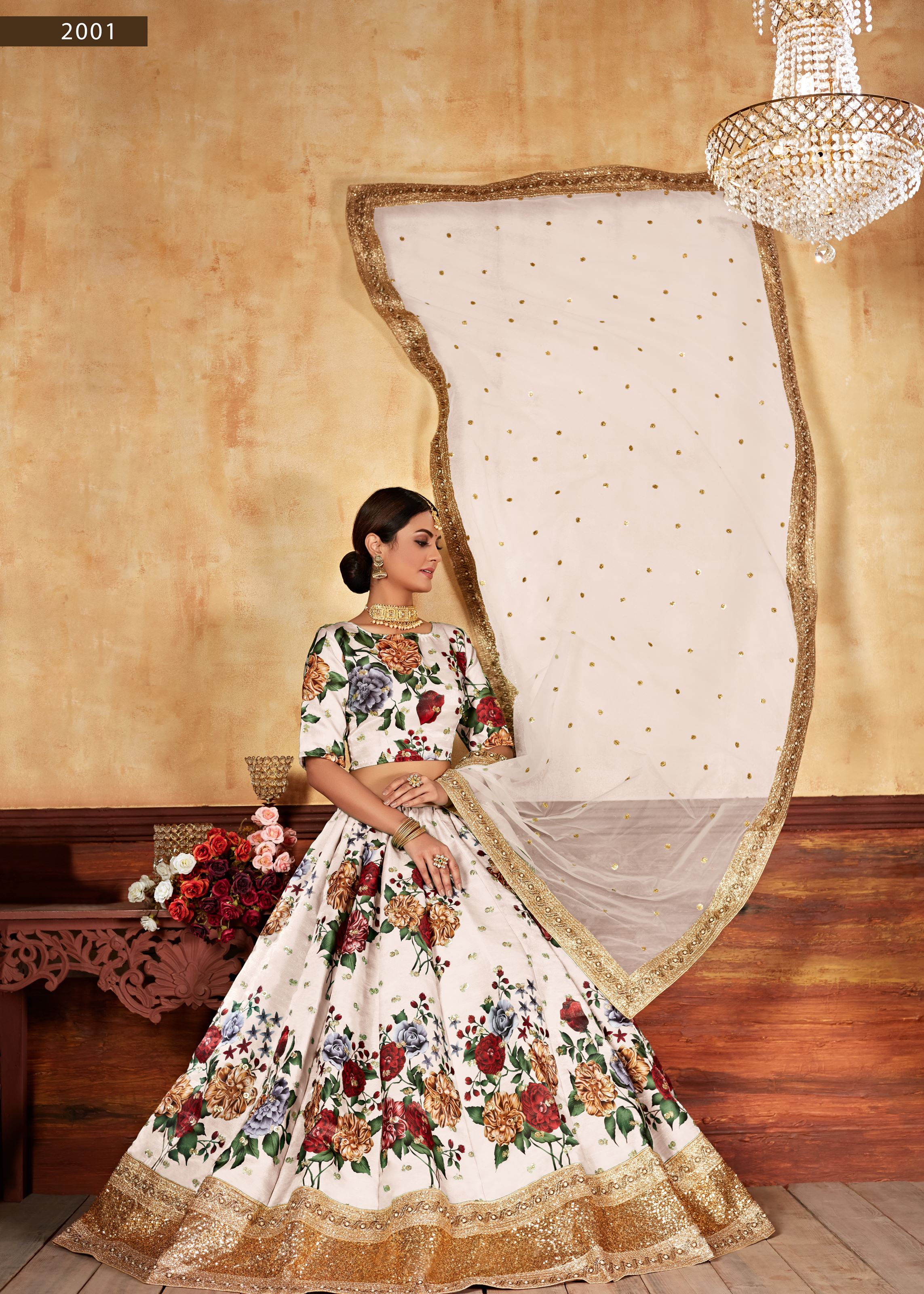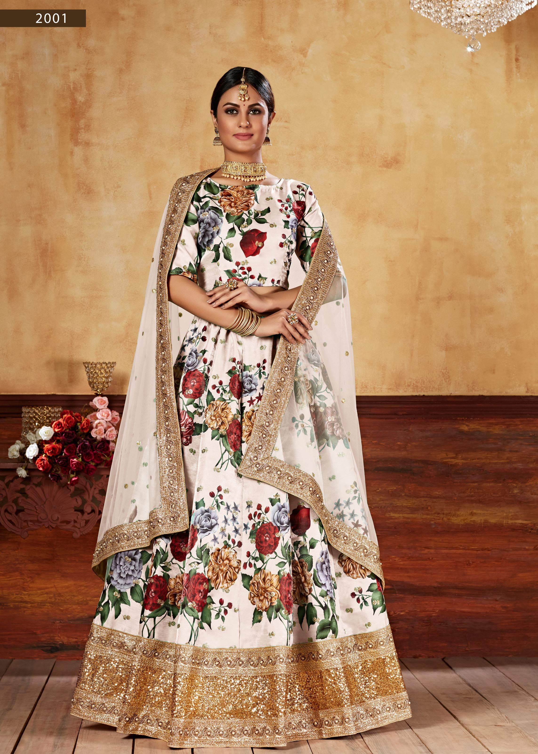 Cream Lehenga Choli With Digital Print And Dori With Jari Sequins Butti,Embroidered Border And Pearl Work