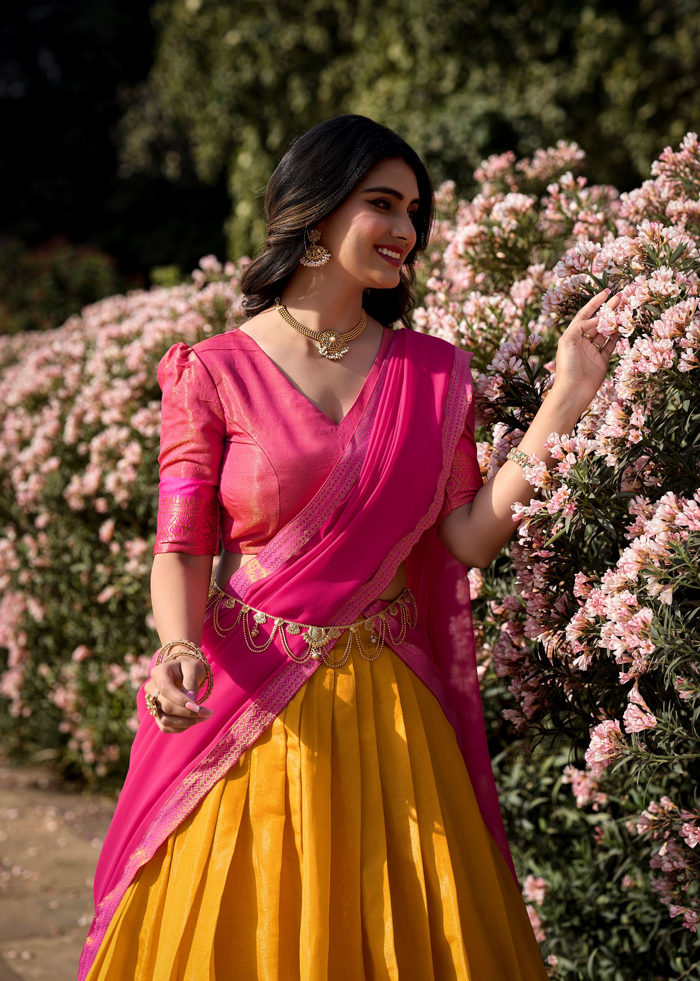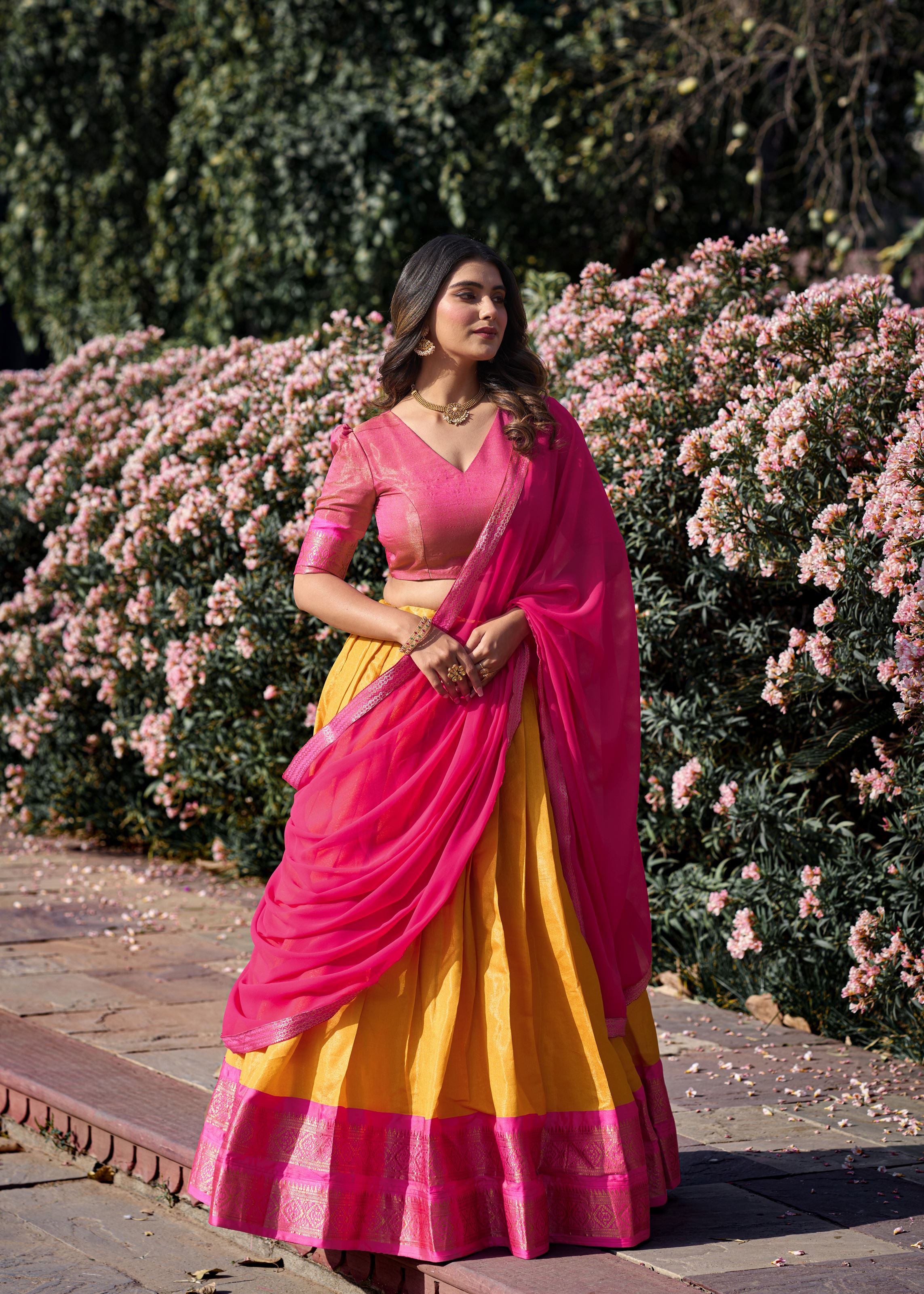 Golden Glow Zari Woven Mustard Kanchipuram Lehenga for Festive Grandeur