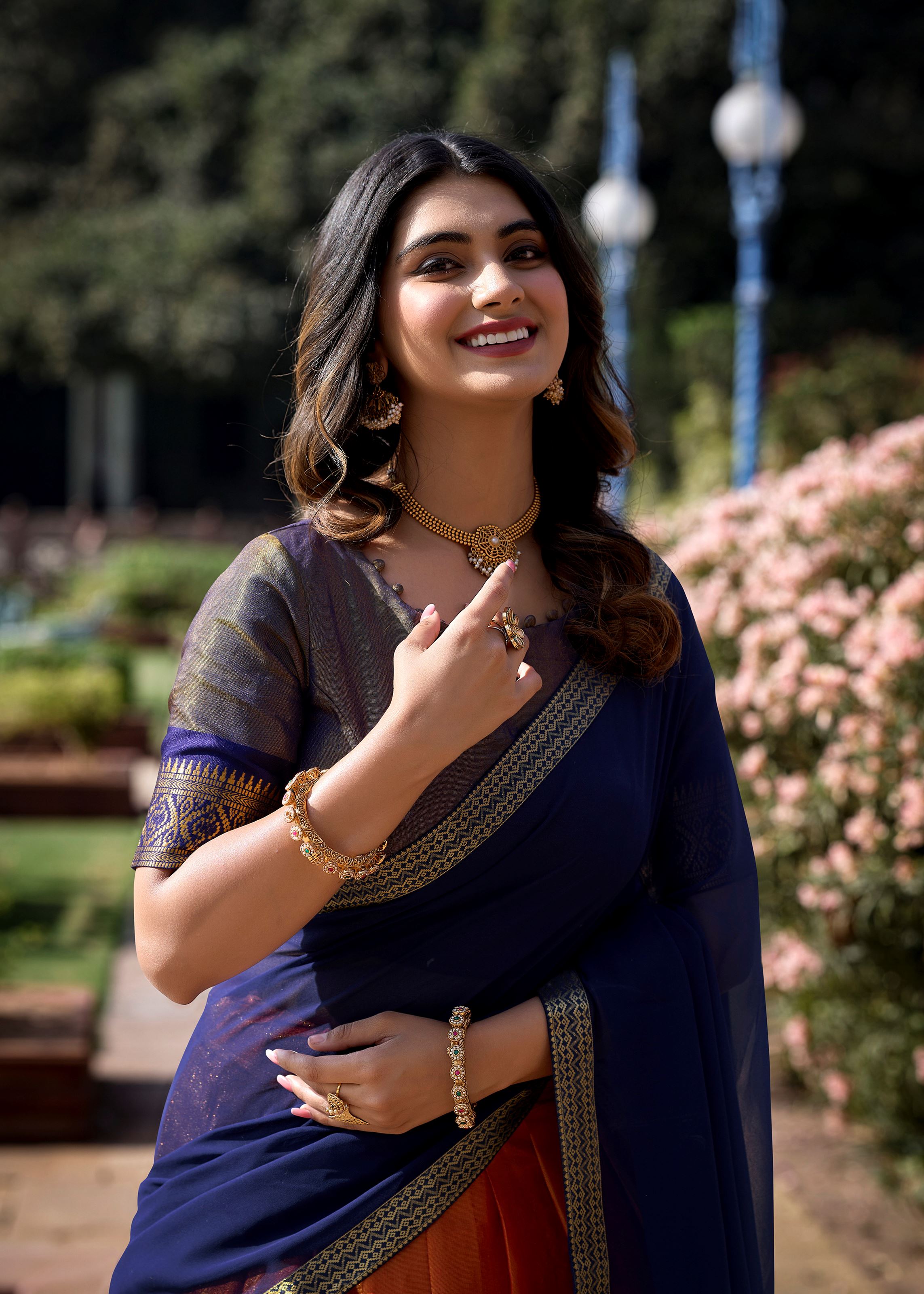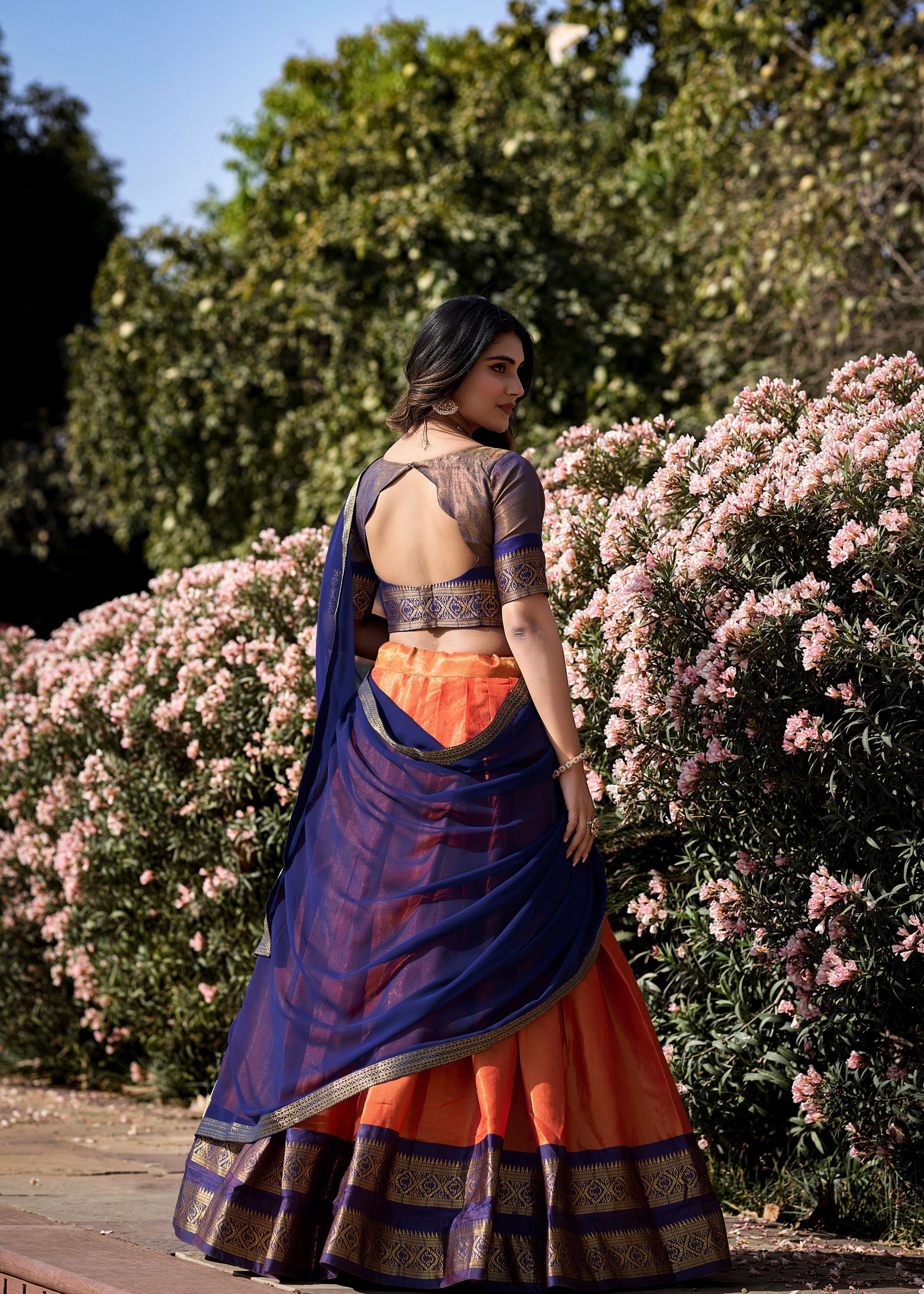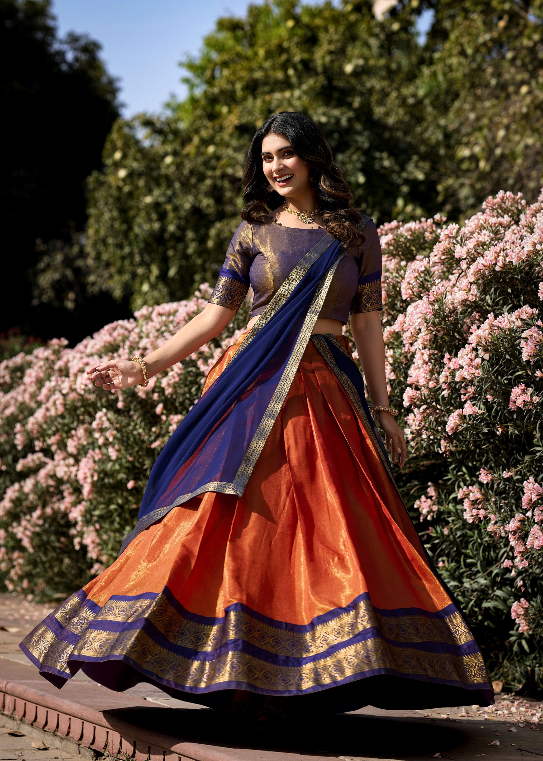 Golden Glow Zari Woven Orange Kanchipuram Lehenga for Festive Grandeur