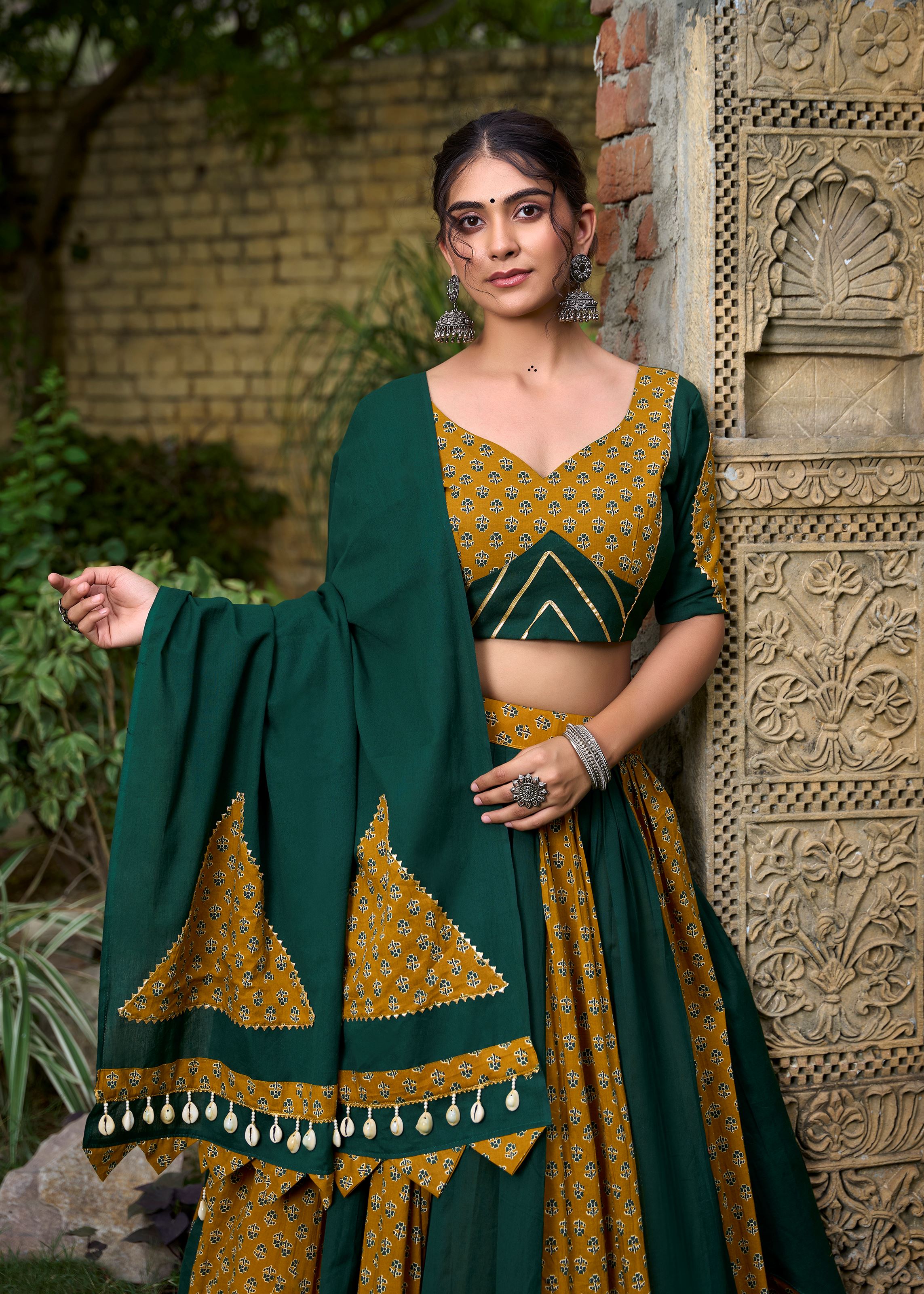 Delicate cowrie (kodi) lace detailing and fine prints add an artisanal touch, creating a statement outfit that blends earthy beauty with modern styling. Whether you're headed to a festive event, a haldi ceremony, or a cultural celebration, this lehenga choli captures attention with its understated grace. Perfect for women who value both tradition and comfort.