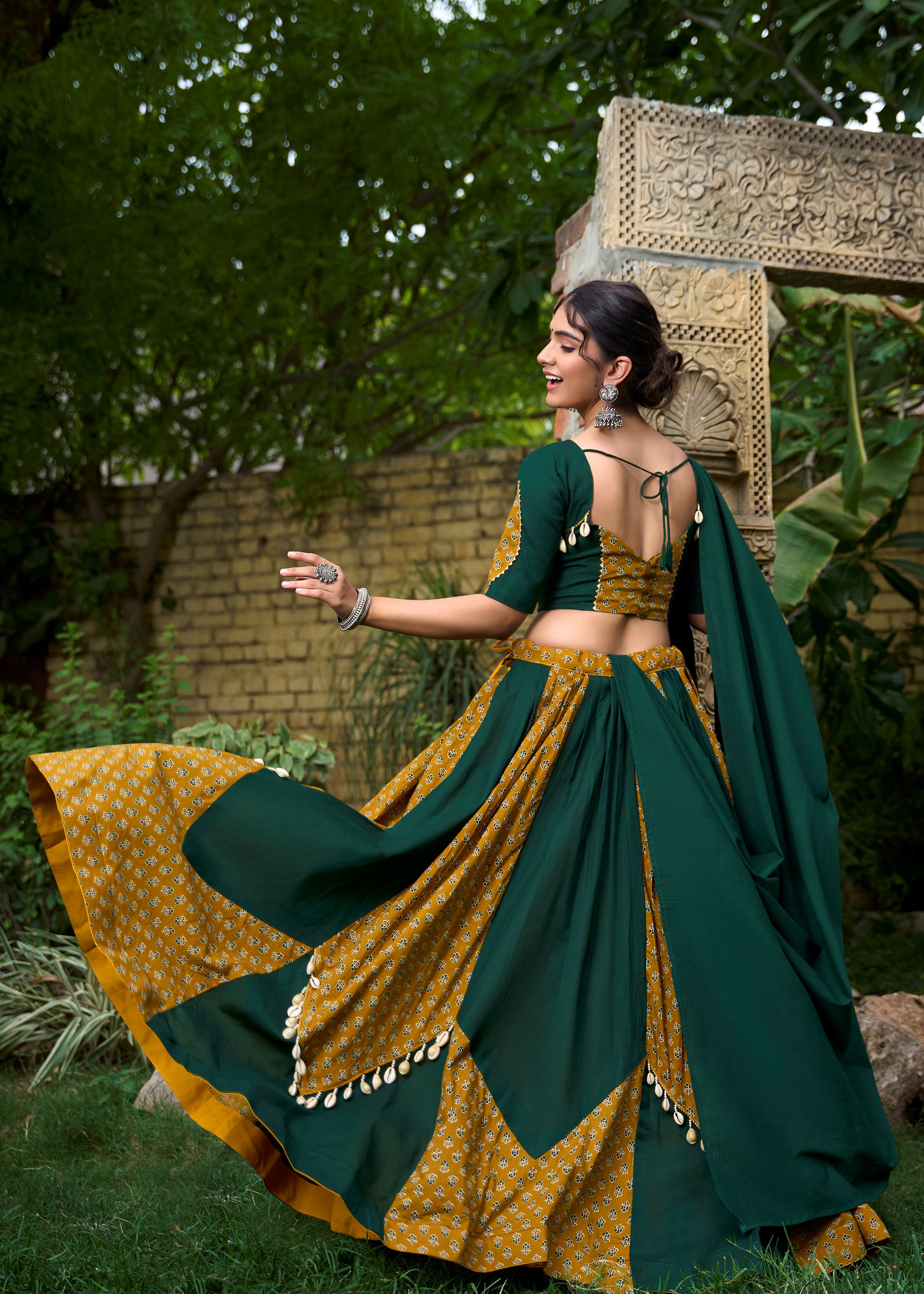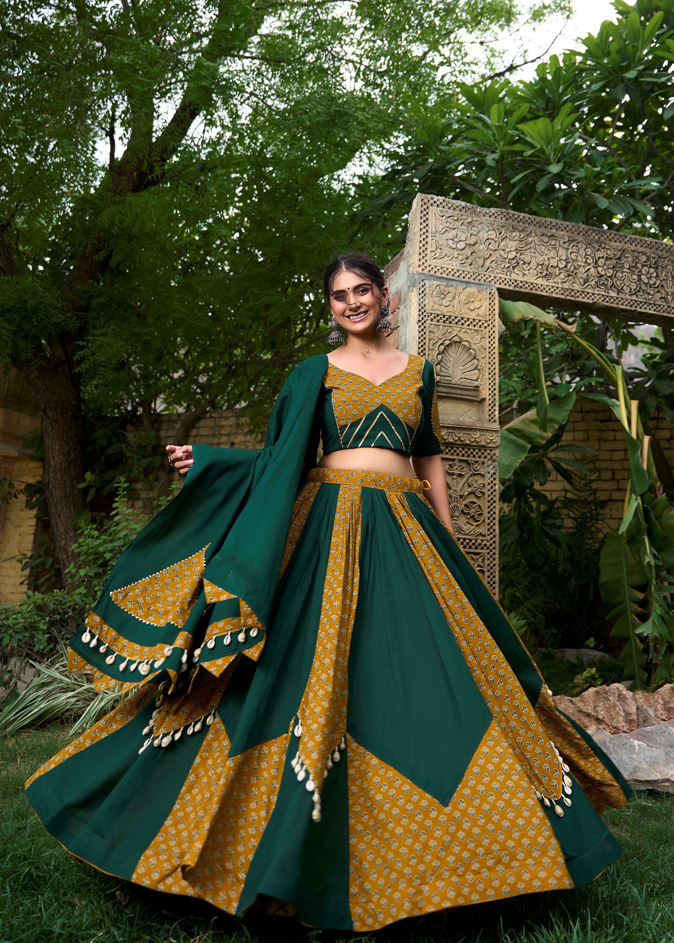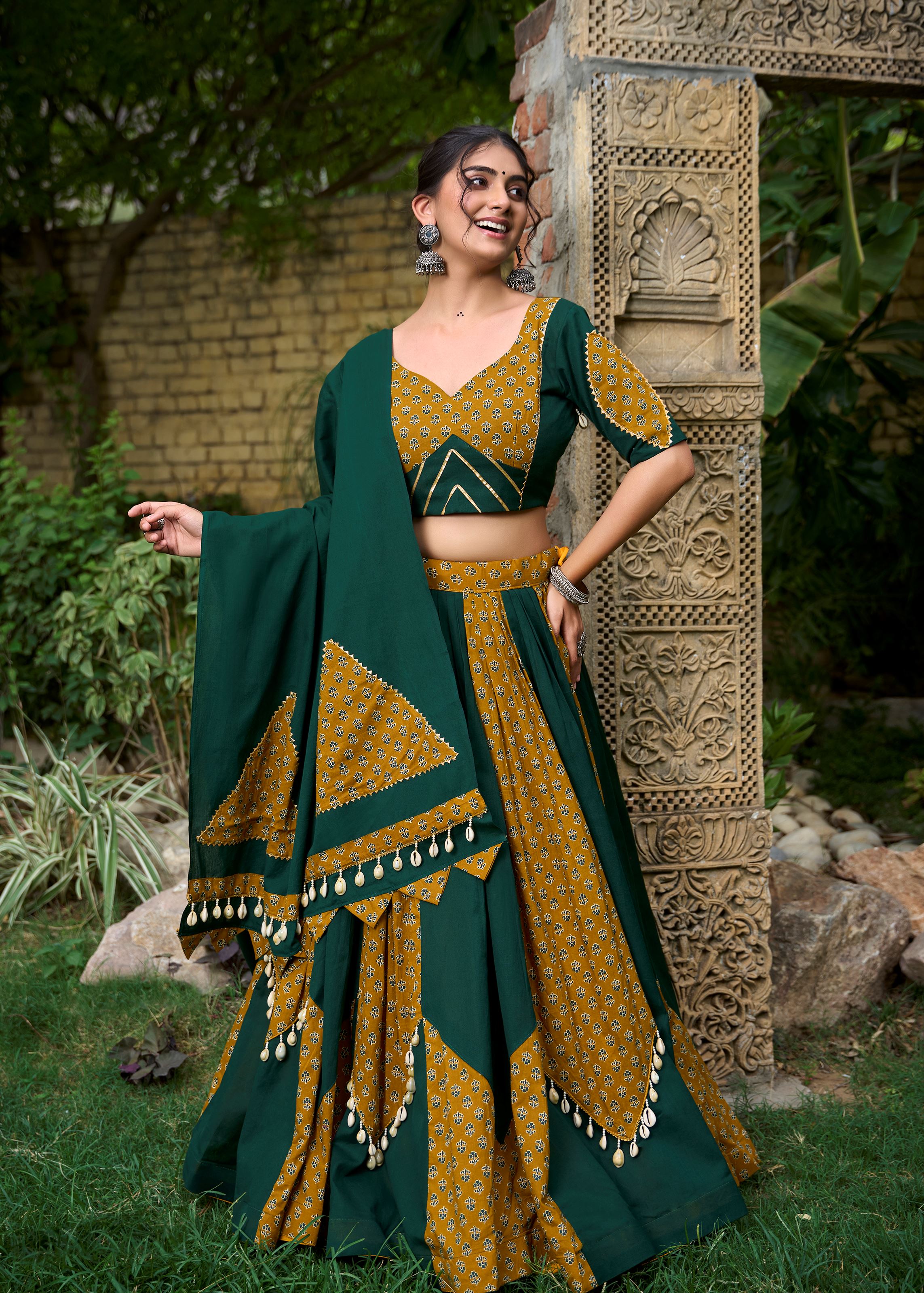 Green Cotton Lehenga Choli with Printed Grace & Cowrie Lace Beauty