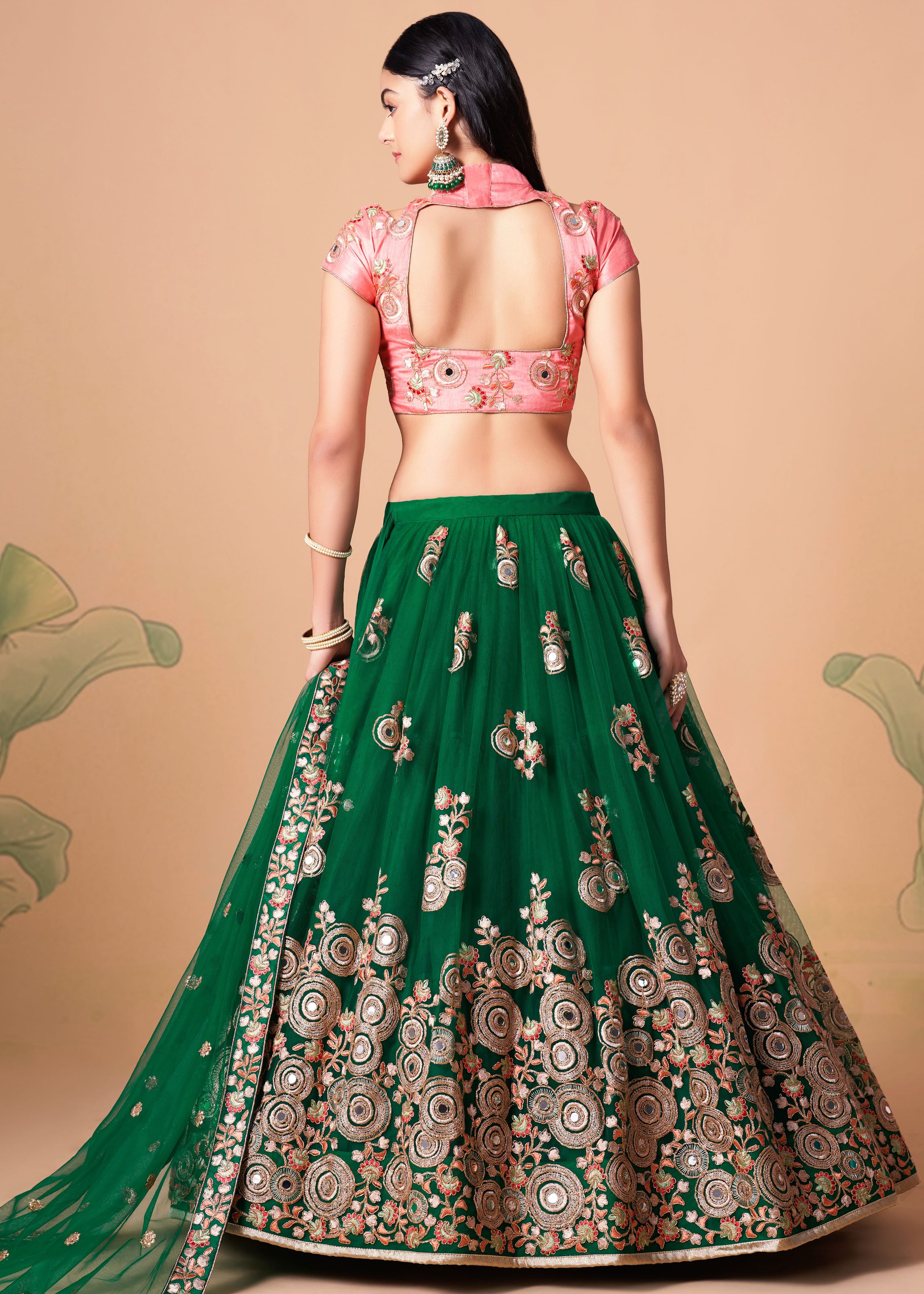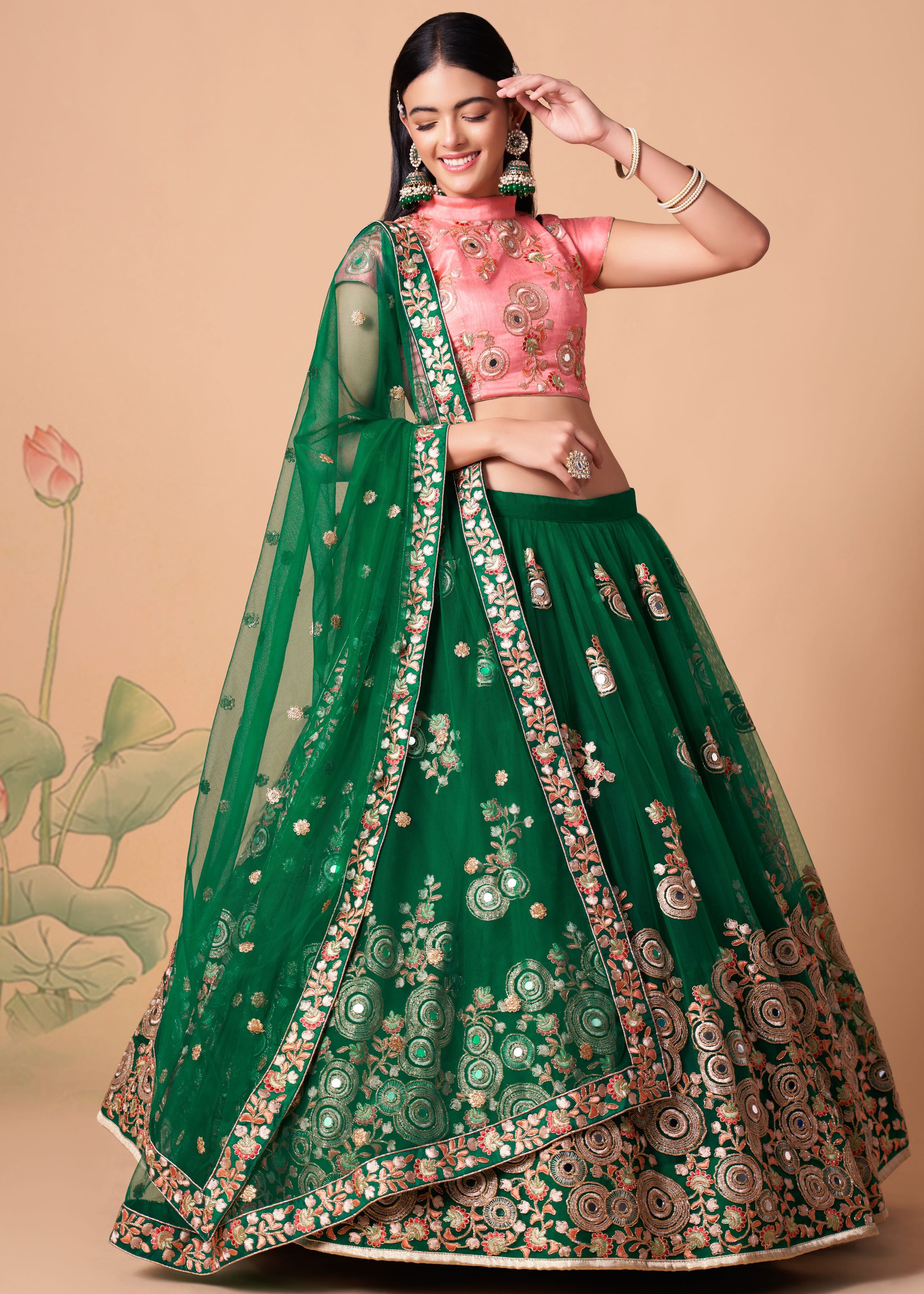 Green Lehenga Choli With Thread, Zari, Dori And Sequins Embroidery With Mirror Work