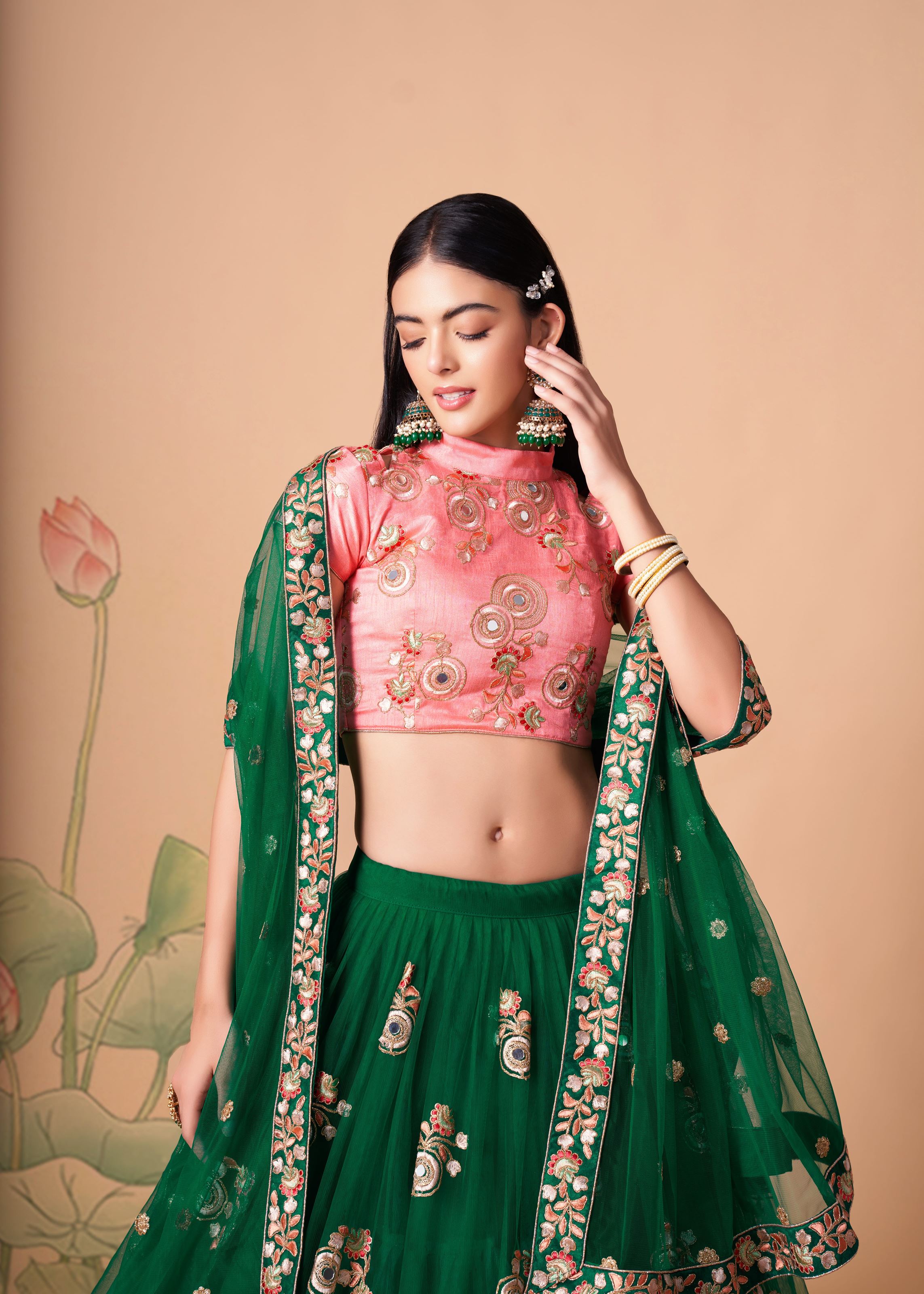 Green Soft Net Lehenga Choli With Thread, Zari, Dori And Sequins Embroidery With Mirror Work ----- SIZE (SEMI STITCHED) AVAILABLE UP TO 42 BUST AND WAIST
