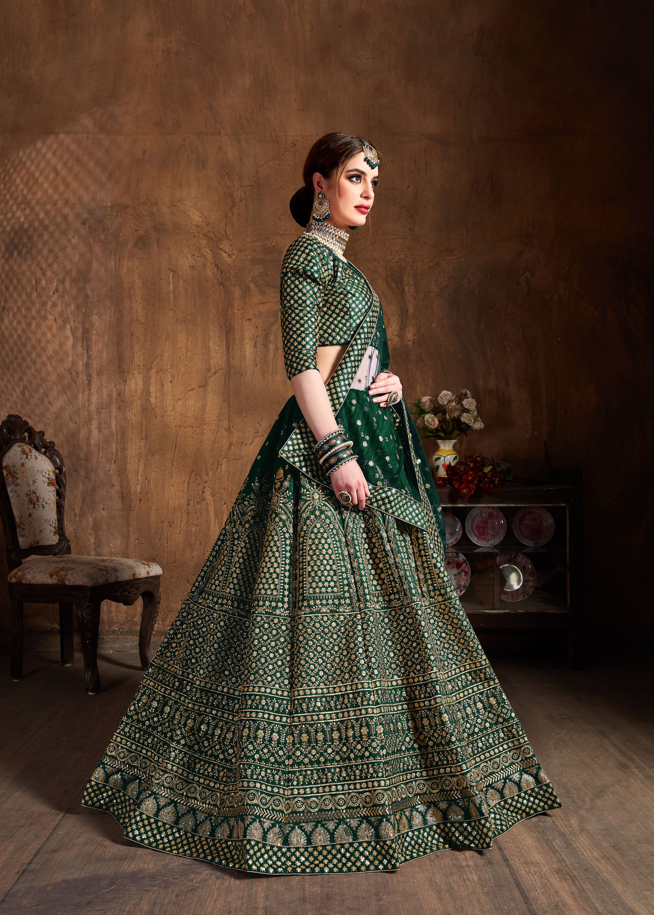 Green Raw Silk Lehenga Choli With Zari And Glitter Sequins Embroidery ----- SIZE (SEMI STITCHED) AVAILABLE UP TO 42 BUST AND WAIST