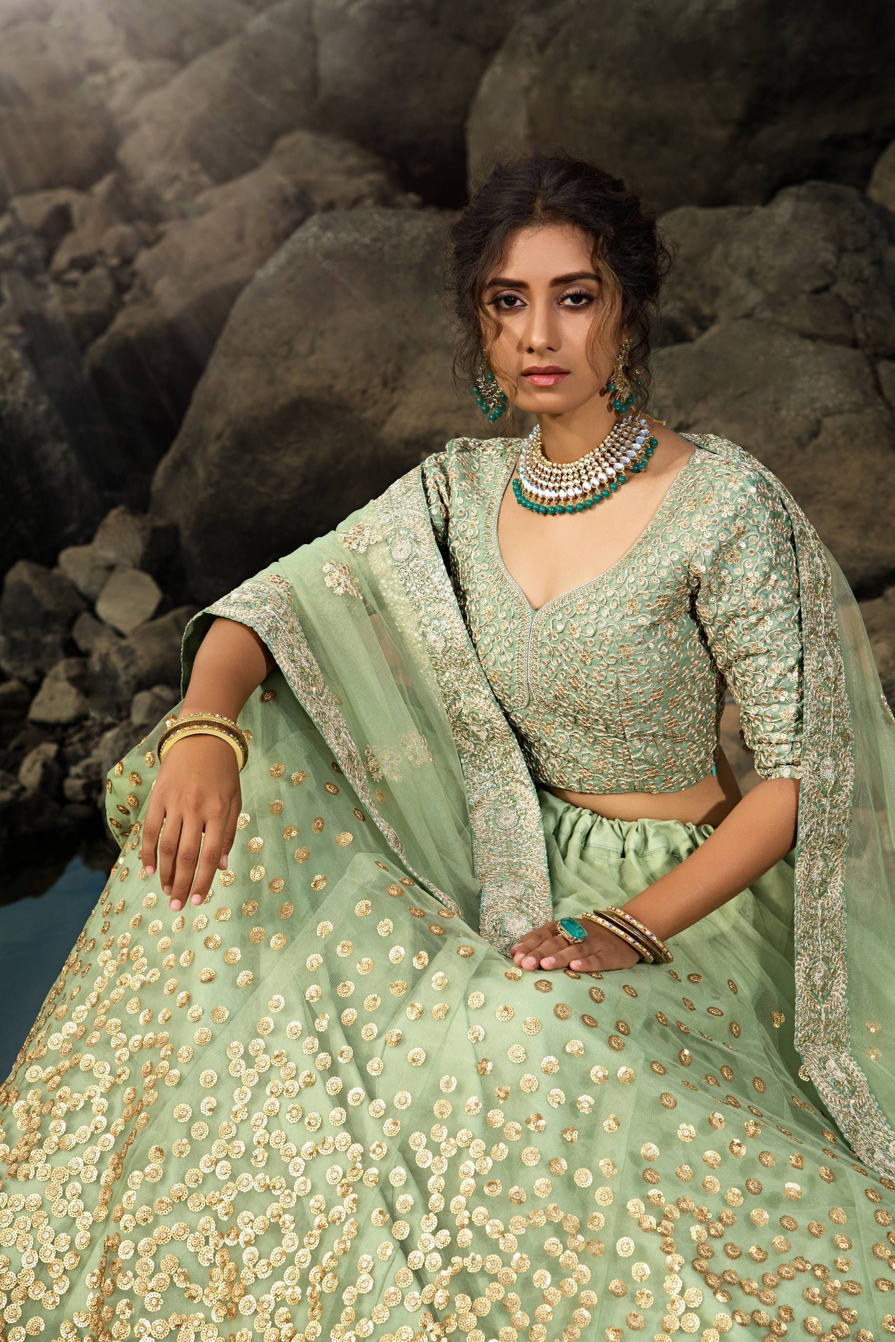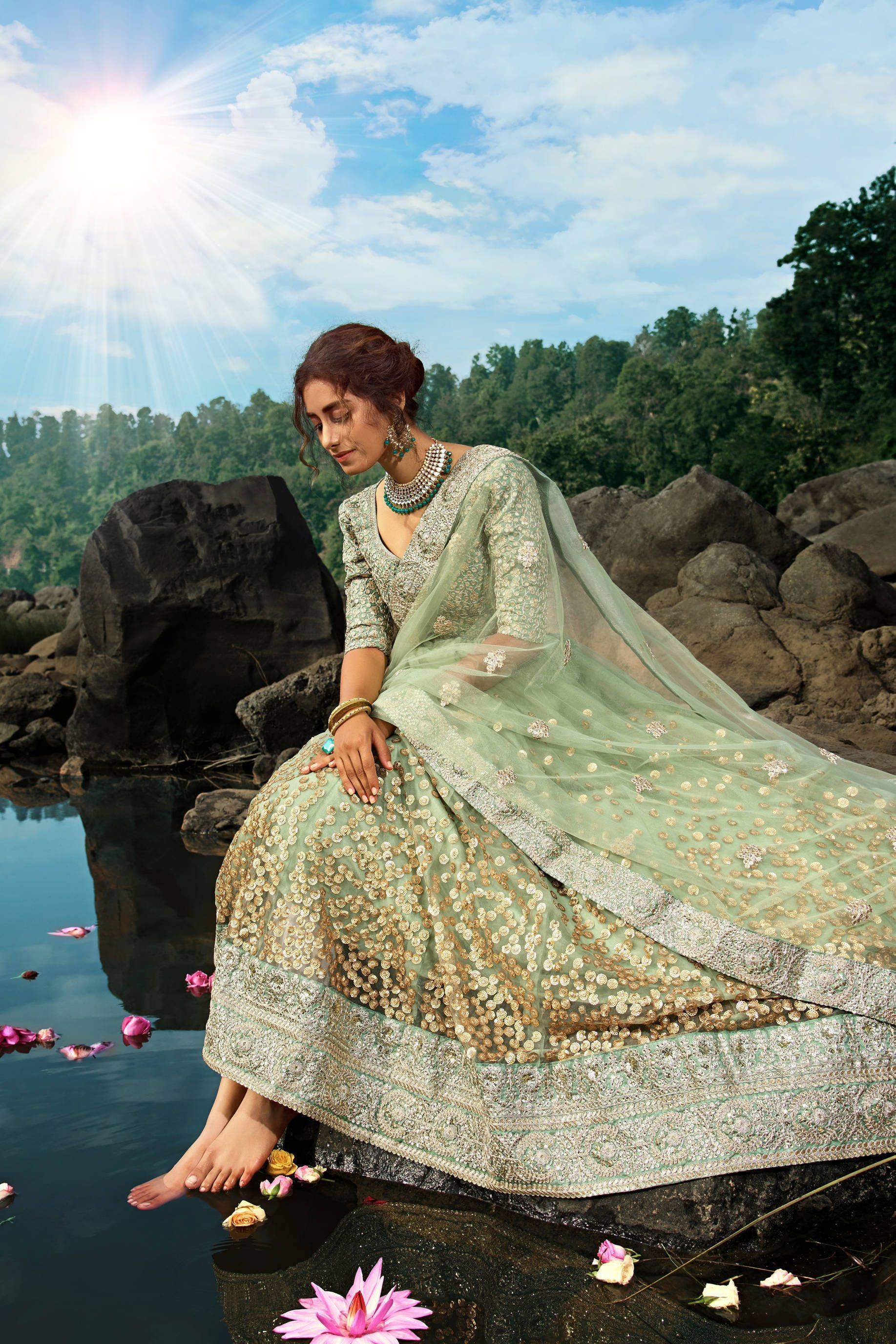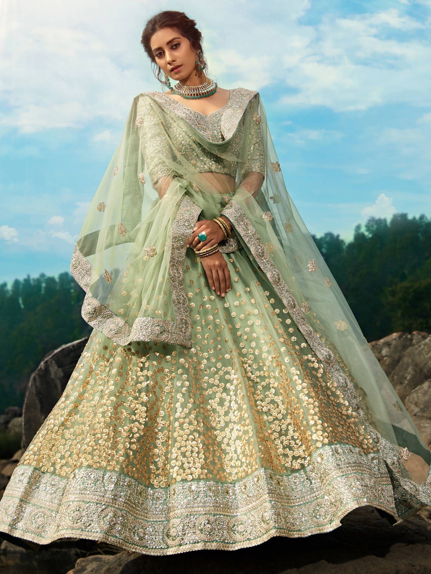 Green Zari Worked Soft Net Wedding Wear Lehenga Choli