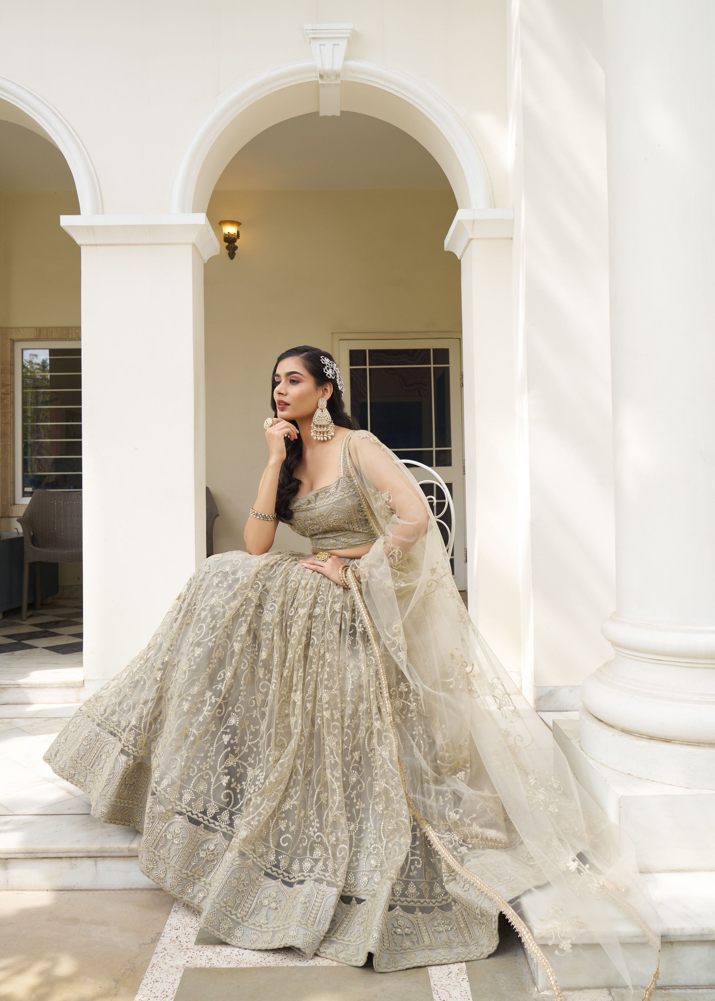 Timeless elegance meets modern artistry in this ethereal Ivory Butterfly Net Lehenga Choli from Aethnofit Fashions — a luxurious ensemble crafted to turn heads with its soft palette and intricate detailing. The lehenga, made from lightweight butterfly net, is lavishly adorned with designer thread work, shimmering zari embroidery, and delicate sequin accents, creating a balanced blend of tradition and glamour. The soft ivory tone exudes purity and sophistication, making it a perfect choice for bridal wear, engagement ceremonies, or reception evenings.